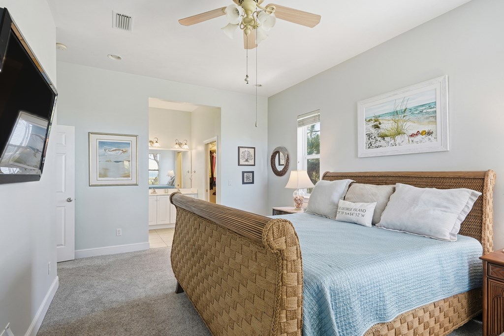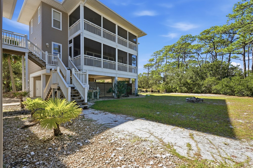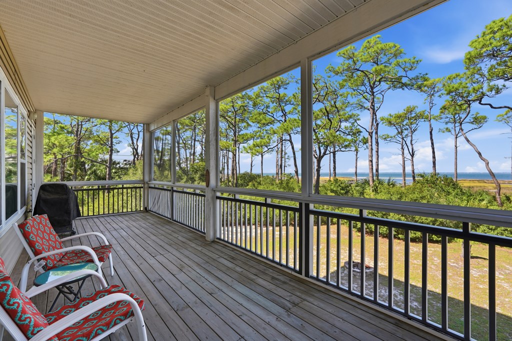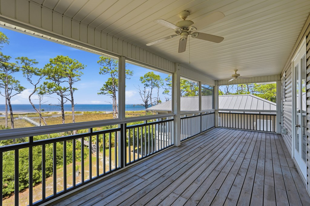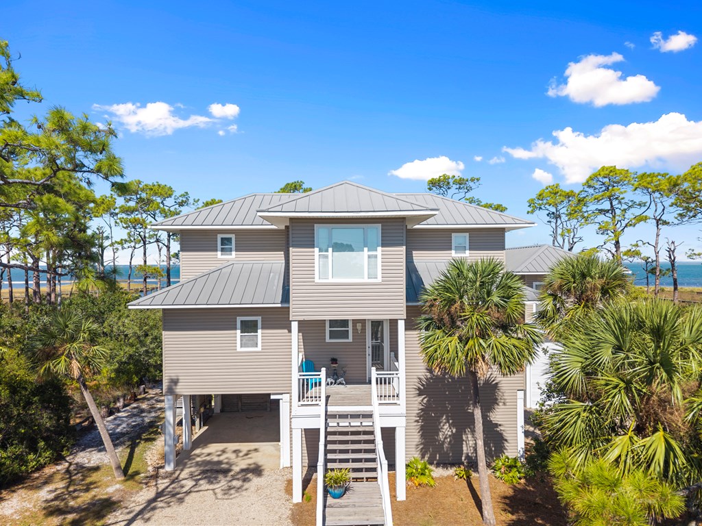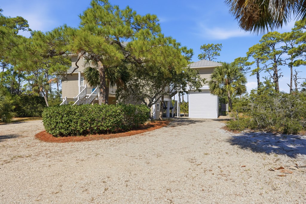 A Must SEE BAYFRONT sanctuary on the quiet, highly sought after east end of St. George Island. This private 1.26 acre property offers a peaceful setting with a long dock perfect for fishing, birdwatching, and launching small watercraft. The main floor features a large primary suite that opens to a full screened balcony, an open kitchen with granite countertops, a 40" gas range, and a comfortable living area with a gas fireplace. Upstairs, you will find an airy office with custom built-ins and large windows boasting Gulf views! This spacious area has a flex room used for additional sleeping, two bedrooms, and two bathrooms. Each bedroom opens to expansive screened decks capturing bay views. Practical features include under-house storage, an outdoor shower, and a fish cleaning station. A 34' x 14' RV/boat garage with full hookups also includes a 476 sq. ft. apartment above with queen and twin Murphy beds, full kitchen and bath, washer/dryer hookups, and a private screened deck overlooking the bay. Ideal for guests or rental income. Built by a renowned local builder, this home is ideally located near the acclaimed St. George Island State Park and just a short walk from public beach access. It offers excellent potential as both a private retreat and an income producing investment. The spacious lot appears to have room for a pool, adding even more versatility and value. Experience the perfect blend of quiet island living, comfortable entertaining, and breathtaking sunsets over the bay.