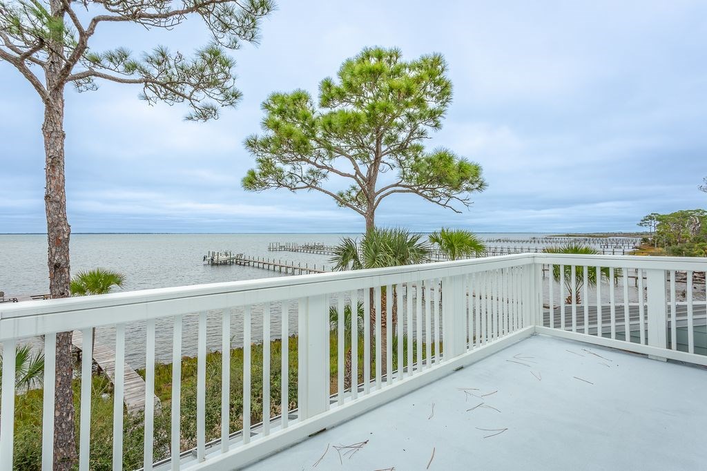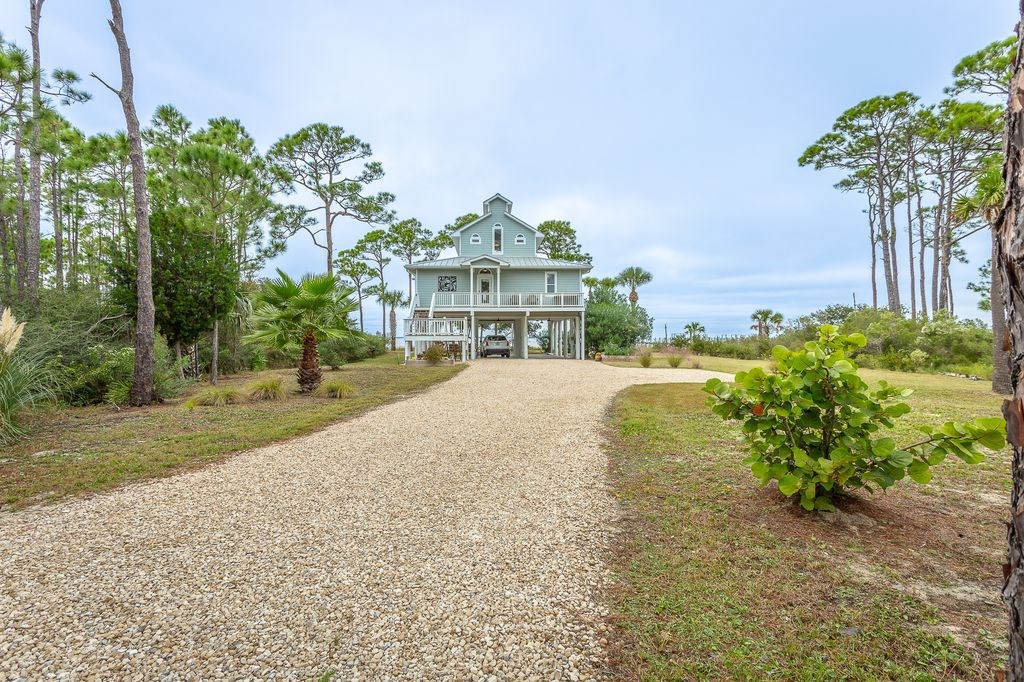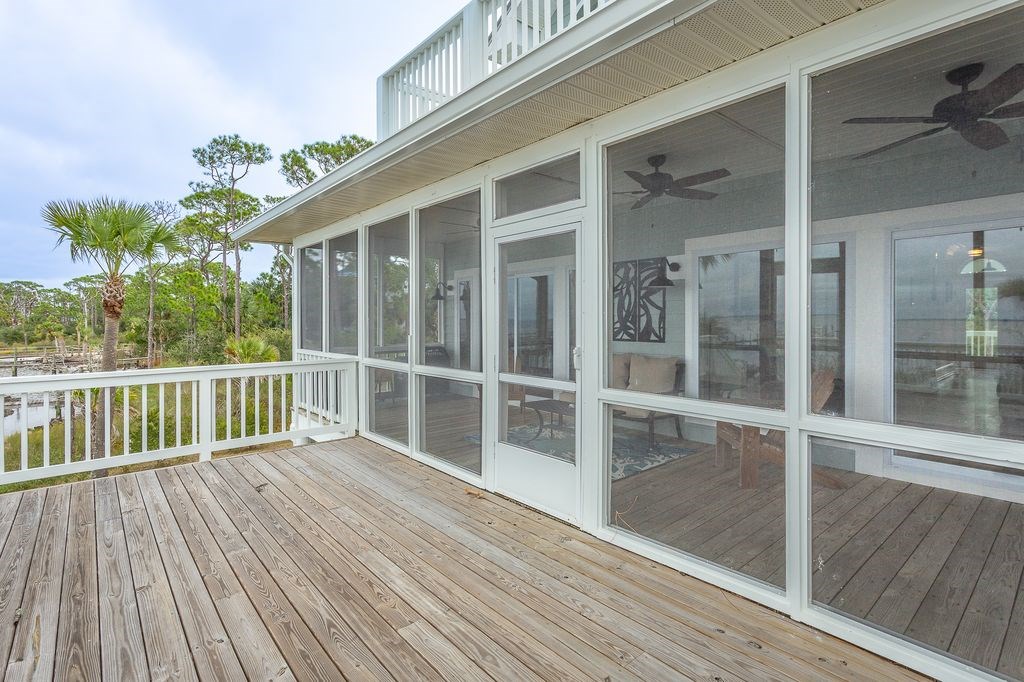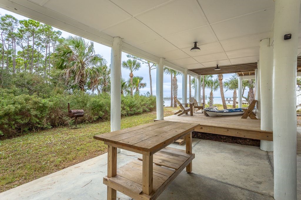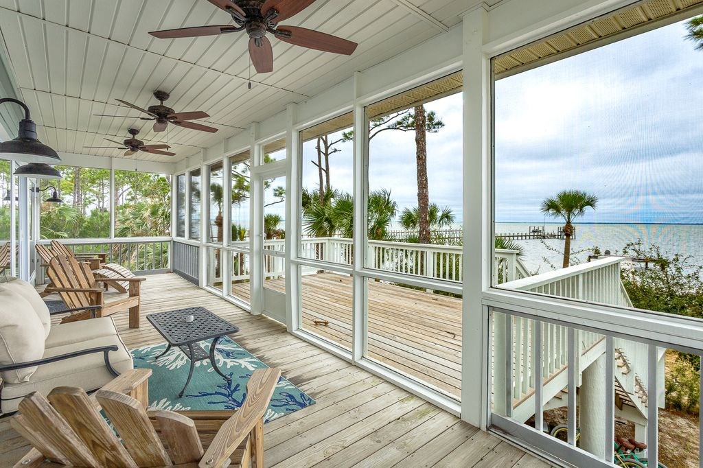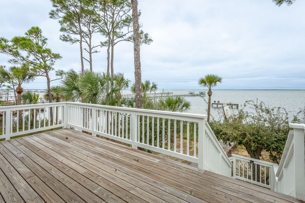 This beautiful St George Island bayfront home is located within the gated St George Plantation and fronts Apalachicola Bay offering fantastic views. The home sits on a 1 acre parcel with 100' of bay frontage providing privacy and solitude. This 3BR/3BA residence has been completely renovated by the current owners. Exterior renovations included new roof, impact rated windows and doors, Hari Plank siding, HVAC, marine grade lighting, front and back decks, stairs, porch screening, underpinning, driveway, landscaping, exterior painting. Interior renovations include, new custom cabinets, vanities, countertops, sinks, plumbing fixtures, water heater, tubs, fireplace, electrical fixtures, interior doors, tile shower, tile kitchen backsplash, tile floors in baths, appliances interior painting, refinished solid oak wood floors. The St George Plantation community amenities include 24 hour gated and roving security, community clubhouse, 2 pools, airstrip, fitness center, tennis and pickle ball courts and 7 miles of white sand beach. Come take a look, it's coastal solitude at its finest.