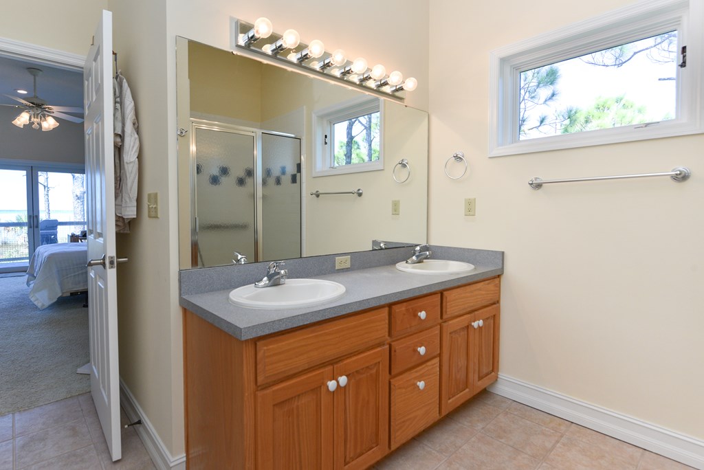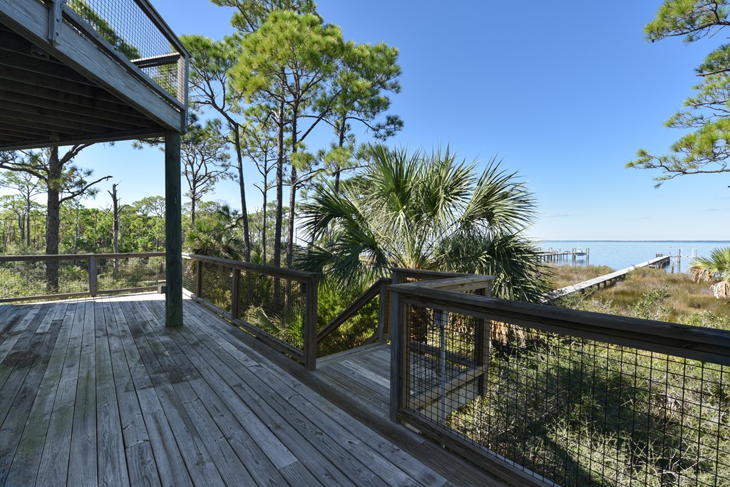 St. George Island Bayfront home with private boat dock. Strategically designed with window walls and multi-level decks to shower rooms with natural light and capture panoramic sunset views and Apalachicola Bay vistas from the open living area, kitchen, and three bedrooms. This one-owner home, nestled privately among native trees and natural landscaping, features 2 primary BRs with ensuite baths, 2 additional BRs and a 3rd full bath. Spacious kitchen with abundant cabinetry, gas range, and separate pantry. Convenient powder room serves the living/dining area. Elevator access to all levels. Solid construction with Hardi-plank siding, galvalume metal roof, storm shutters and concrete pilings . Golf-cart friendly community with a full range of amenities: gated and roving security, clubhouse, 2 pools, fitness room, tennis and pickle ball courts, beach, Bayfront part with paddle boat launching, extensive bike paths and nature trails, and a 3,300' paved airstrip.