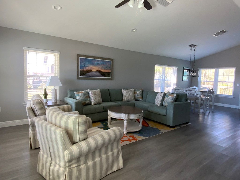 COASTAL COTTAGE LOCATED IN MEXICO BEACH WITH NO HOA"S. THIS STUNNING FULLY FURNISHED 3 bedroom 2 bath with 1623 square feet of living space. Open concept design and Core-Tec LVP flooring throughout. Open kitchen WITH with granite and stainless steel appliances. You'll love the wrap around porch/deck that will create a great outdoor entertaining area for a total of 2405 square feet. Hardie board siding, metal roof & the attached two car garage. The property is beautifully landscaped with irrigation well & sprinklers. It also has a outdoor shower. you're only a short walk, bike or golf cart ride to the beautiful beaches. SHORT TERM RENTALS ALLOWED. Please note that the home has a just been completely painted throughout the home on the inside. The owner has put a new beautiful sectional couch, rug & a brand new washer & dyer. Call today for a showing.