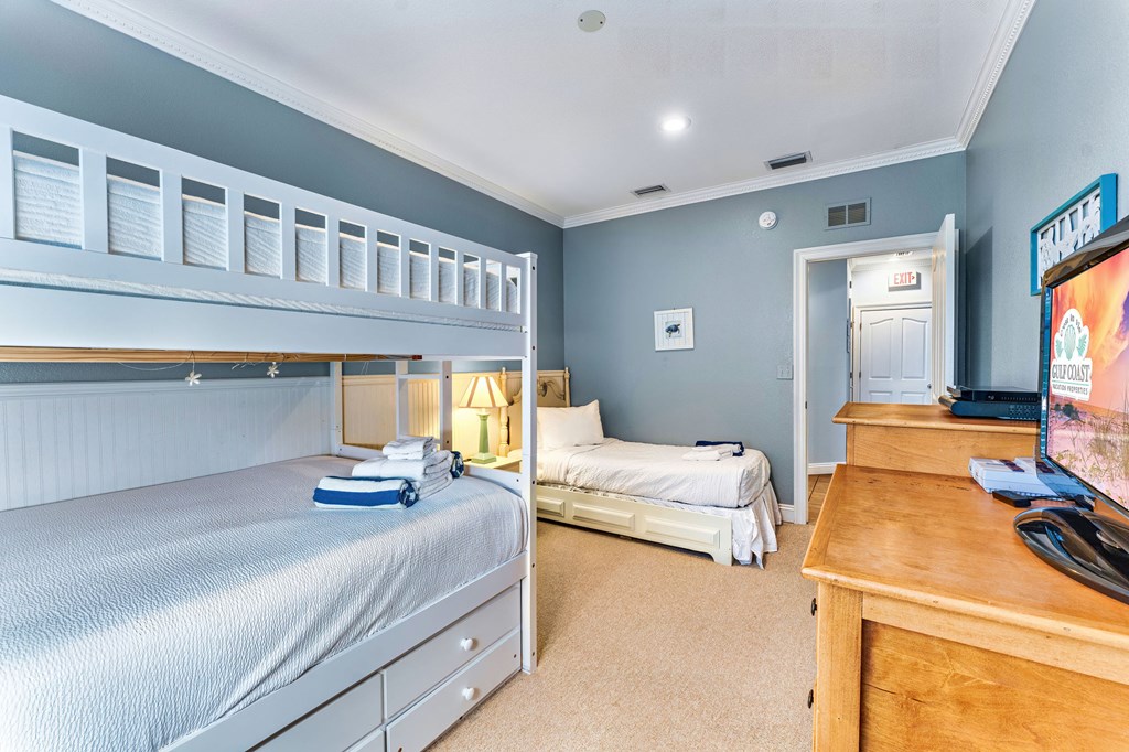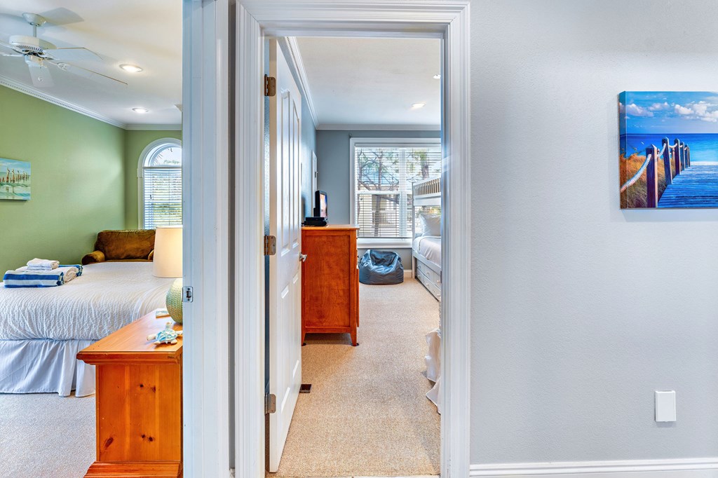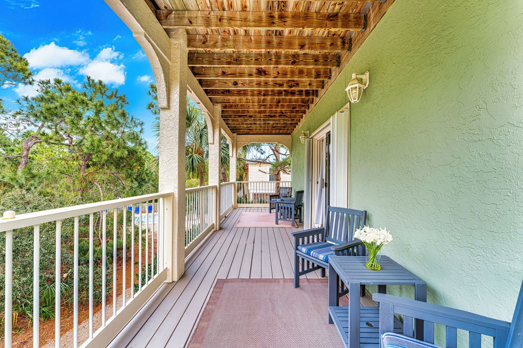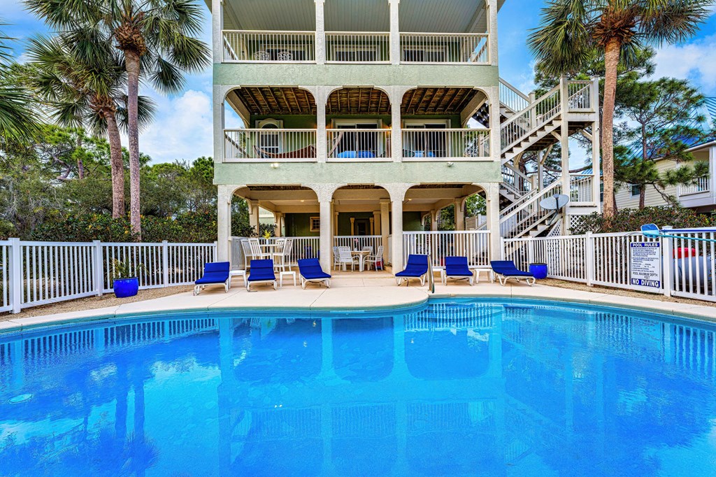 Exceptional second-tier 4BD/3.5BA two-story home in the exclusive gated St. George Plantation. Set on a landscaped, partially wooded half-acre lot (100' x 217'), this property offers privacy, space, and easy access to premier community amenities. The ground level features a welcoming entry, laundry, and generous owner's storage. The first level includes two guest bedrooms sharing a full bath—one with a bunk bed and full-size bed—plus a south-facing primary suite with an ensuite featuring a jetted tub and separate shower. The main upper level offers a spacious great room combining living, dining, and kitchen areas, a convenient half bath, and a north-facing guest bedroom with ensuite. Three of the four bedrooms open to expansive covered porches, creating seamless indoor–outdoor living and tranquil views. Exterior features include a private in-ground pool, shower, fish-cleaning station, multiple covered decks, and a short walk to the beach. The home has been lovingly maintained and has a solid rental history with repeat guests and excellent reviews. An elevator shaft is already built in and currently used as owner's closets. Just a 3-minute stroll leads to uncrowded white sandy Gulf beaches; a 5-minute walk brings you to Magnolia Clubhouse with an indoor fitness room, large 103,000-gallon pool, restrooms, covered pavilion with picnic tables, and a tennis court. Additional community amenities include a private airstrip, a second pool, two more tennis courts (three total), two pickleball courts, miles of bike paths, 24-hour roving security, underground utilities, and access to Bob Sikes Cut. Ideal for anyone looking for a serene coastal retreat on Florida's Forgotten Coast or an appealing investment opportunity, this home is ready to welcome you—schedule your private showing today! Please note, a new buyer fee of 0.50% of the purchase price is payable to SGPOA at closing.