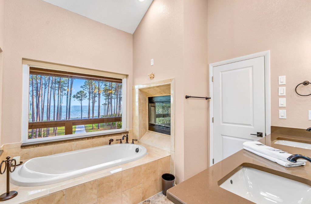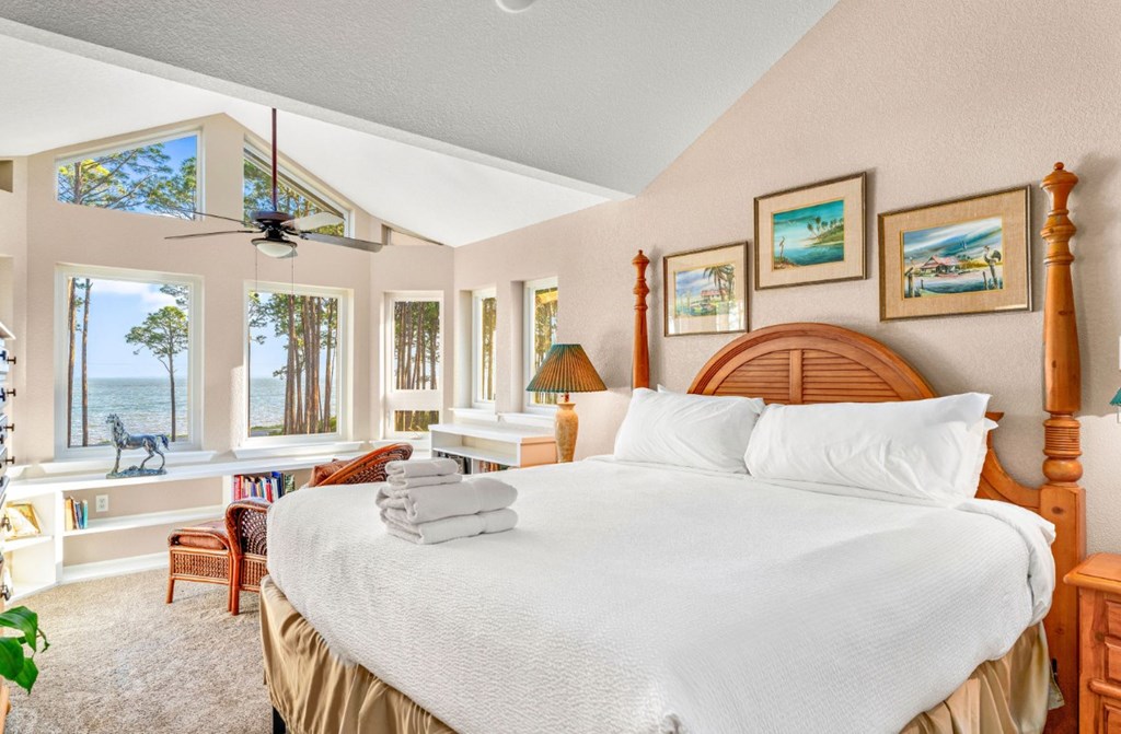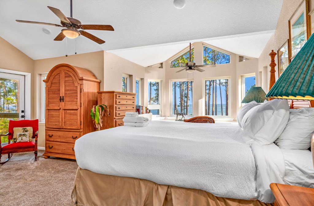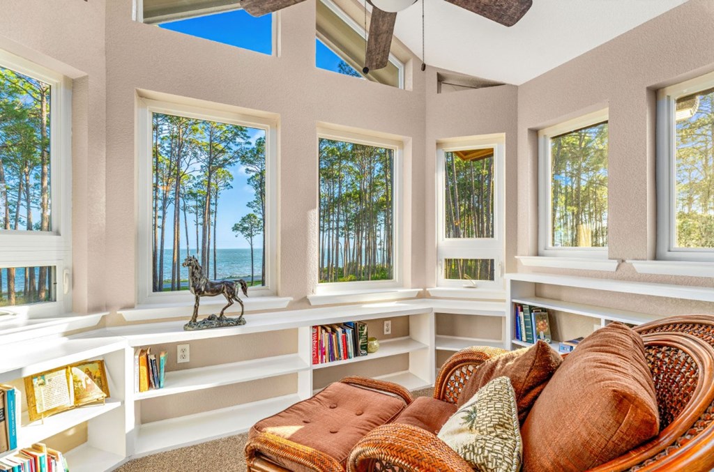 Come view this exquisitely designed home overlooking a great view of Apalachicola Bay. A 5 BR 3.5 Bath home on 1.94 A with a road cut all the way through to _____________for a back egress. Many extras are included-such as a 2,000 sf covered pad with two large storage units (see photos)-A possible future workshop) -a well-a propane tank for the stove and 2 fireplace hookups In the future -an area right on Apalachicola Bay where a dock could be planned-oversized two car garage-irrigation system- an area designed (planned) for a future elevator-ample room for a swimming pool-a lot of space for storage-a beautiful winding driveway-a wondrous view of Apalachicola Bay- furnishings negotiable-all measurements are taken from Franklin County records- buyer should reverify if needed.