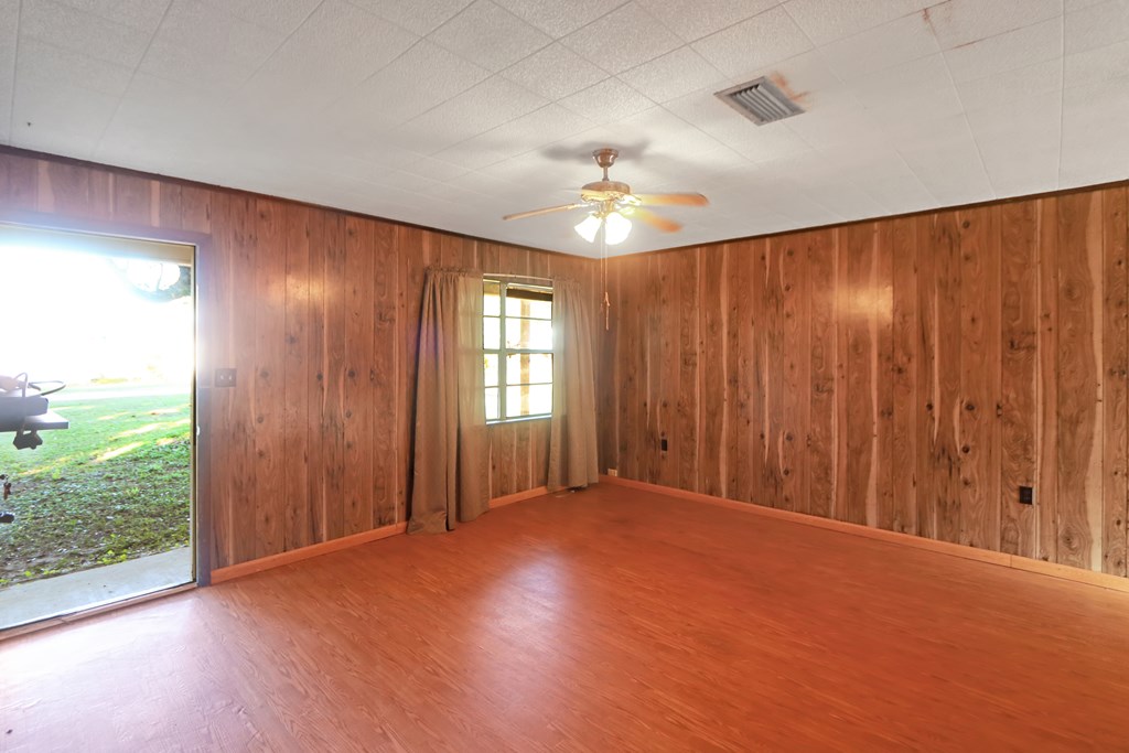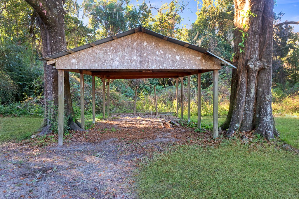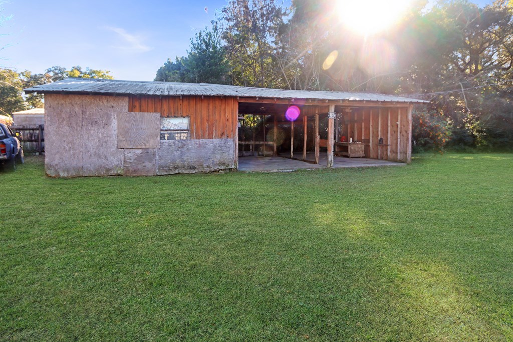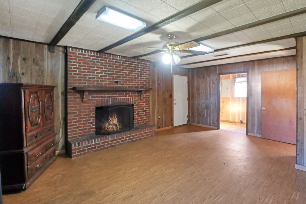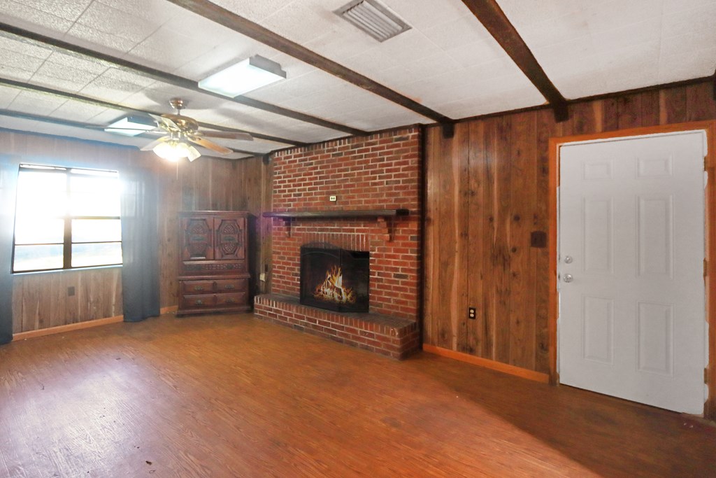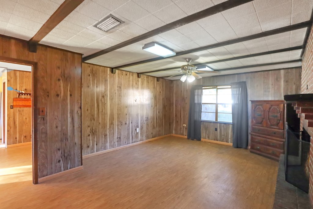 Must see solid three-bedroom, two-bath brick residence tucked away on an X flood zone lot at the dead-end of a city street. Inside the front door you are greeted with a formal living area granting direct access to the backyard through the sliding glass doors, creating a seamless indoor/outdoor flow. The kitchen with breakfast bar is awaiting your updates! waits updating features a breakfast bar. The fireplace in the expansive den creates a warm ambiance, with the potential for conversion to a 4th bedroom. The laundry room is located off this space and offers additional storage. Down the hall you'll discover the master suite and two additional bedrooms and a full bath. Outside, the property includes a detached single carport and double garage with attached workshop, providing ample room for storage, hobbies, or project space. With its comfortable layout, desirable location, and generous outbuildings, this home is ready to welcome its next owners.