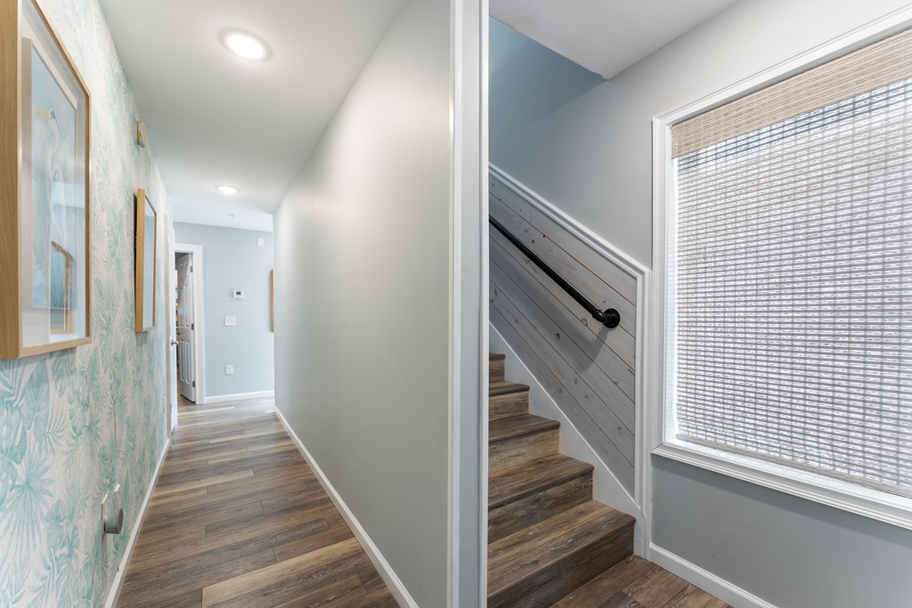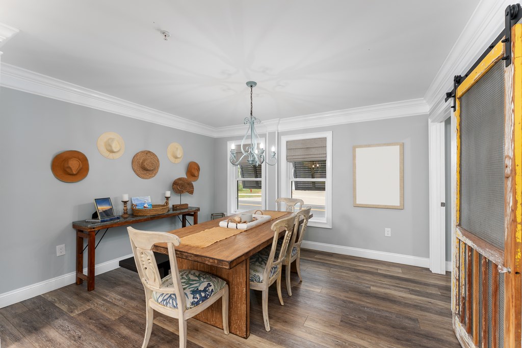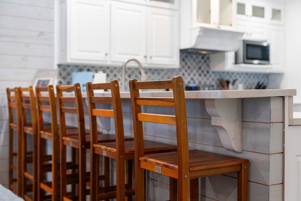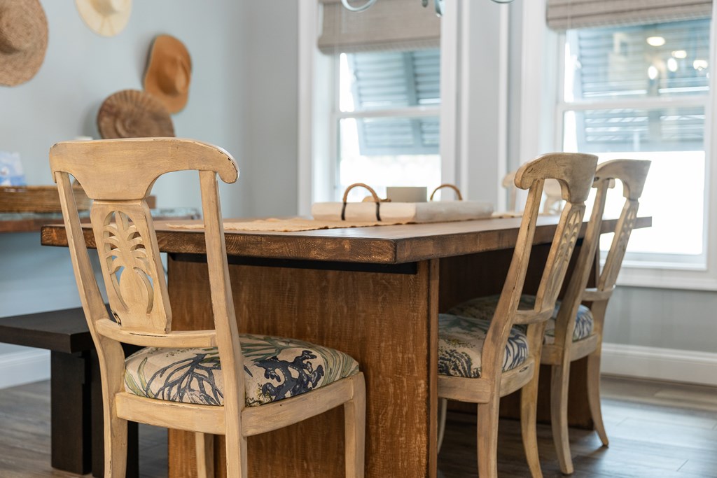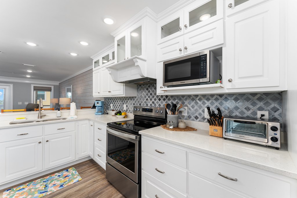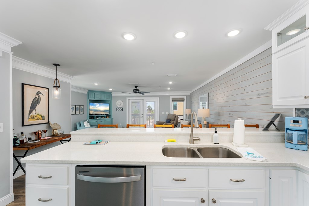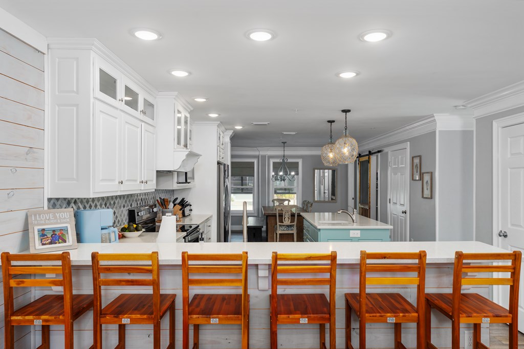 This beautifully updated 4-bedroom, 5.5-bath townhome offers approximately 2,396 square feet of heated living space across four thoughtfully designed levels, blending coastal character with modern comfort and functionality. Originally built in 2003 and extensively updated in 2018, the home features a standing-seam metal roof, solid construction, and quality finishes throughout. The main living level showcases an open-concept design ideal for entertaining, with shiplap accent walls, crown molding, recessed lighting, and durable luxury vinyl plank flooring. A spacious living area flows seamlessly into the chef's kitchen, which features white cabinetry, solid-surface countertops, stainless steel appliances, decorative tile backsplash, and a large center island with bar seating. Pendant lighting and coastal design details extend into the dining area, creating a warm, inviting atmosphere. Each of the four bedrooms includes its own en-suite bath, offering privacy and flexibility for owners and guests. Bedrooms are generously sized and thoughtfully furnished, with ceiling fans, custom touches, and ample natural light. Bathrooms are well appointed with custom vanities, solid-surface or marble-style countertops, contemporary fixtures, and tiled showers. A stylish powder room adds convenience on the main living level. Additional highlights include a dedicated laundry room with shelving, built-in cabinetry, attractive stair detailing, drywall interior walls, central air conditioning with ducted heat, and a functional mix of tile and vinyl plank flooring designed for durability and low maintenance. With approximately 3,830 total square feet, the multi-level layout is ideal for full-time living, second-home use, or rental potential. Well maintained and move-in ready, this coastal townhome delivers space, comfort, and timeless beach-inspired design.