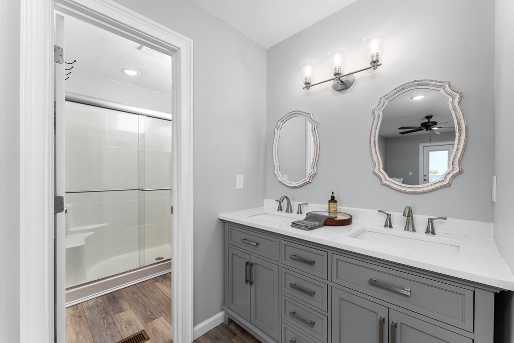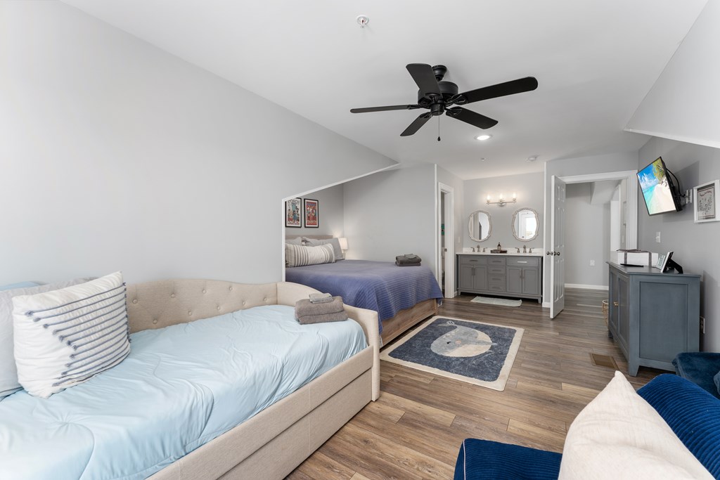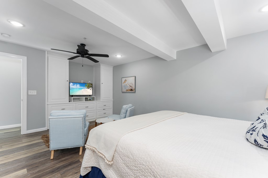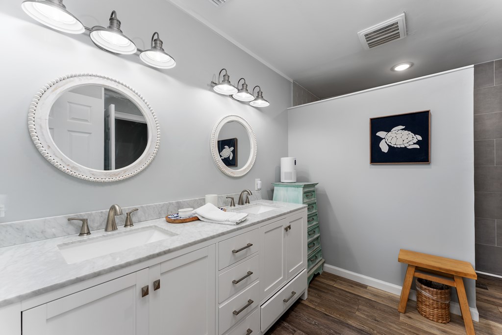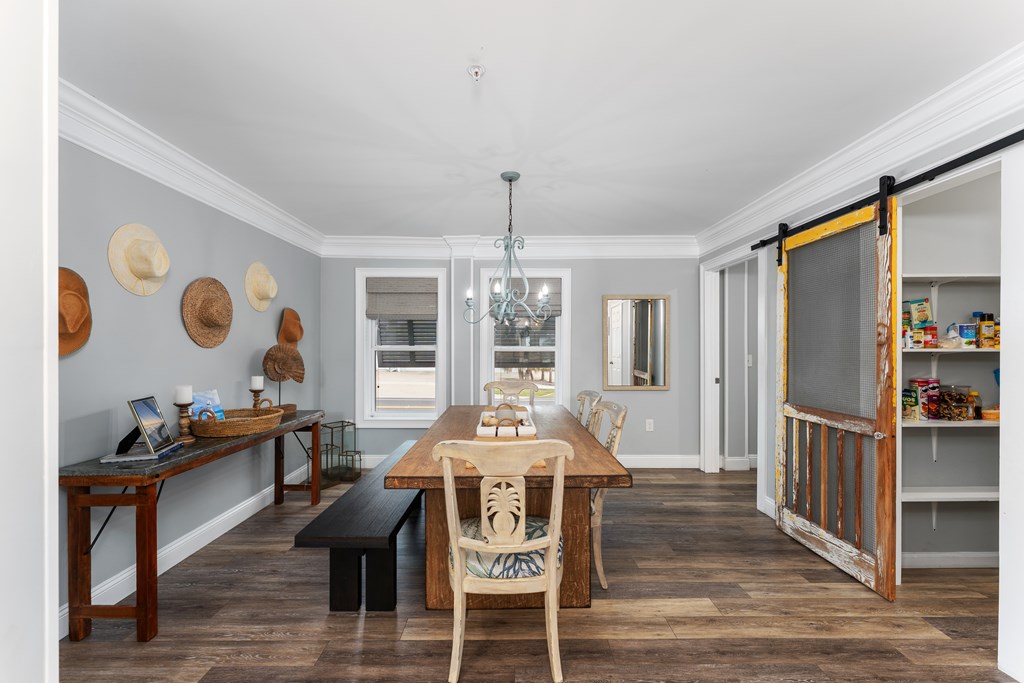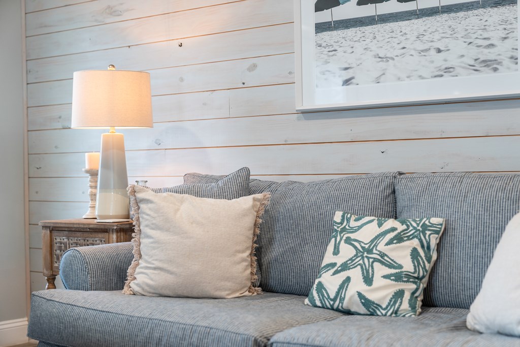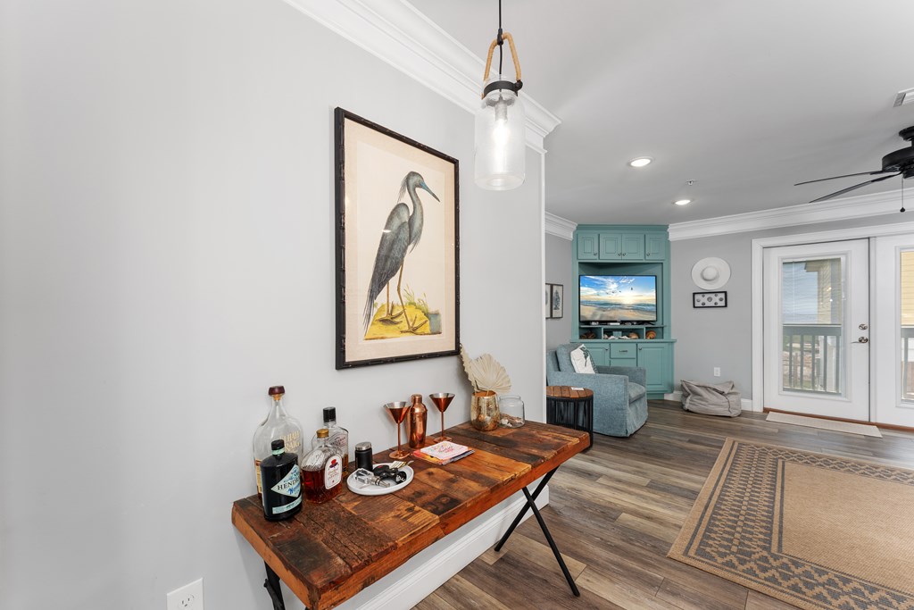 This beautifully updated 4-bedroom, 5.5-bath townhome offers approximately 2,396 square feet of heated living space across four thoughtfully designed levels, blending coastal character with modern comfort and functionality. Originally built in 2003 and extensively updated in 2018, the home features a standing-seam metal roof, solid construction, and quality finishes throughout. The main living level showcases an open-concept design ideal for entertaining, with shiplap accent walls, crown molding, recessed lighting, and durable luxury vinyl plank flooring. A spacious living area flows seamlessly into the chef's kitchen, which features white cabinetry, solid-surface countertops, stainless steel appliances, decorative tile backsplash, and a large center island with bar seating. Pendant lighting and coastal design details extend into the dining area, creating a warm, inviting atmosphere. Each of the four bedrooms includes its own en-suite bath, offering privacy and flexibility for owners and guests. Bedrooms are generously sized and thoughtfully furnished, with ceiling fans, custom touches, and ample natural light. Bathrooms are well appointed with custom vanities, solid-surface or marble-style countertops, contemporary fixtures, and tiled showers. A stylish powder room adds convenience on the main living level. Additional highlights include a dedicated laundry room with shelving, built-in cabinetry, attractive stair detailing, drywall interior walls, central air conditioning with ducted heat, and a functional mix of tile and vinyl plank flooring designed for durability and low maintenance. With approximately 3,830 total square feet, the multi-level layout is ideal for full-time living, second-home use, or rental potential. Well maintained and move-in ready, this coastal townhome delivers space, comfort, and timeless beach-inspired design.