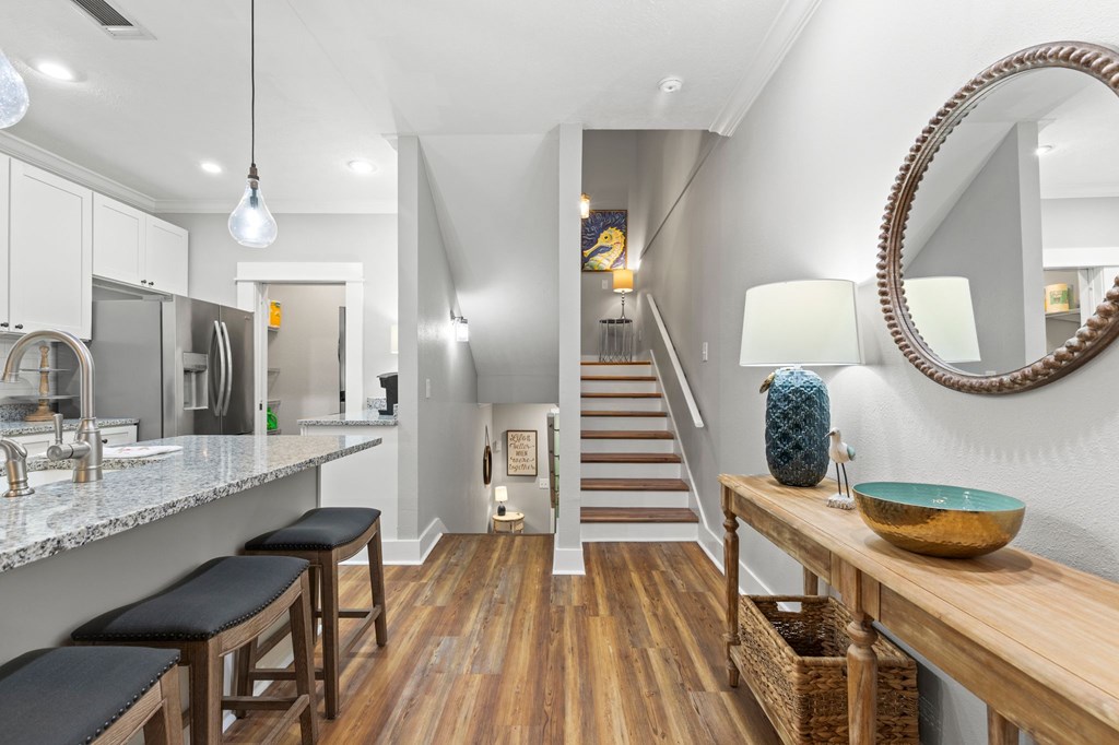 Beachside living just steps from the Gulf in this move-in ready, fully renovated and fully furnished townhome located in the desirable Oceanside Village of Mexico Beach. One of the largest two-bedroom floor plans in the community, this split-level layout offers a bedroom on each floor for added privacy. Recent updates include a new roof, HVAC, newly replaced sliding doors, updated appliances, and wine fridge, along with modern finishes throughout. The kitchen features granite countertops, custom cabinetry, stainless steel appliances, and LVP flooring. The bright living area opens to a spacious deck overlooking the community pool, while both bedrooms feature private balconies. The garage level has been upgraded with epoxy flooring that is fully waterproof, providing durability and low-maintenance convenience. Ideal as a primary residence, vacation home, or rental investment, this turnkey property offers easy coastal living in one of Mexico Beach's most sought-after communities.