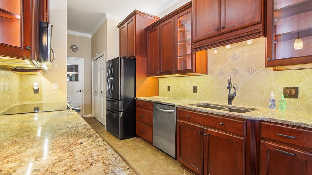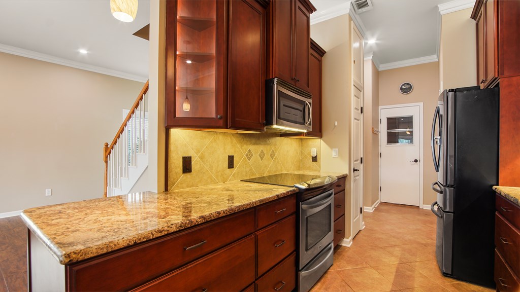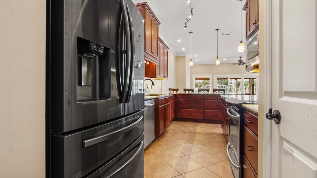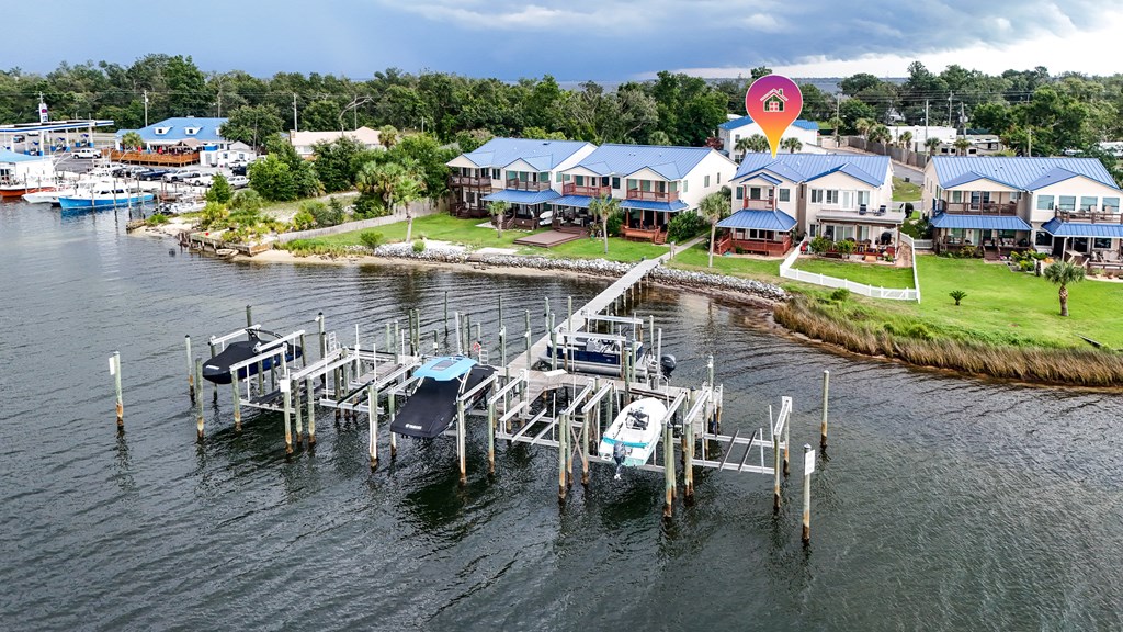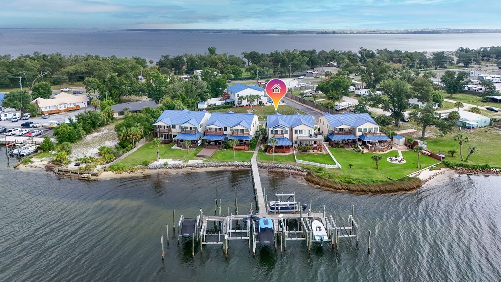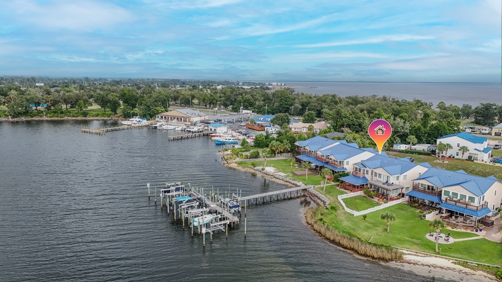 East on Tyndall Parkway, Highway 98 toward TAFB, just past Pier 98, Blue Harbor to the right, 5108 Blue Harbor is the townhome in the middle right on the bayou.