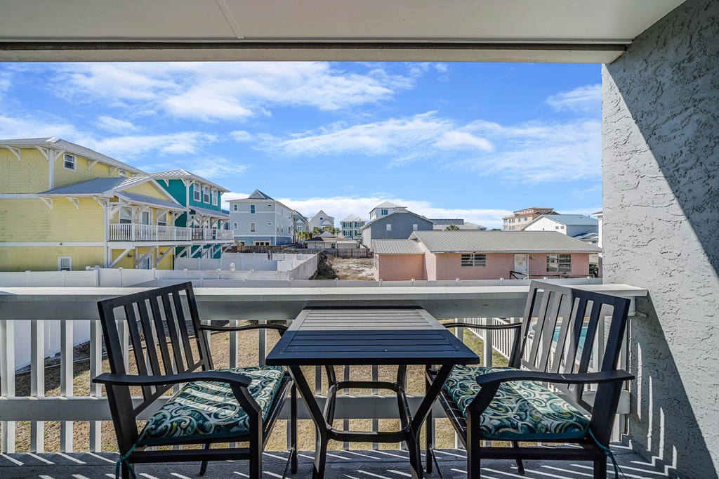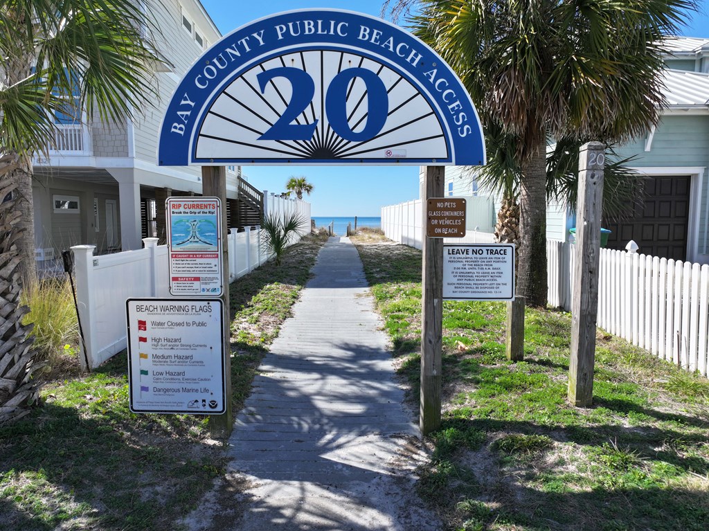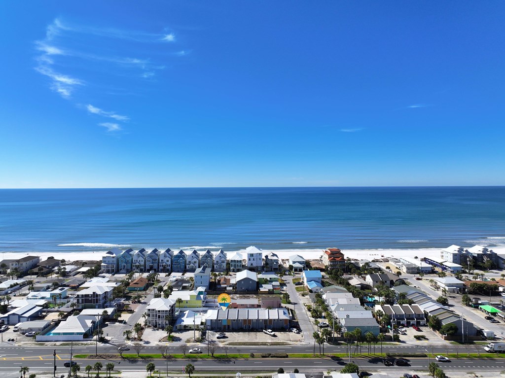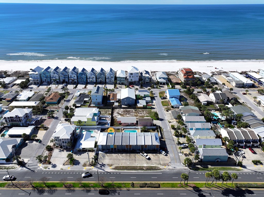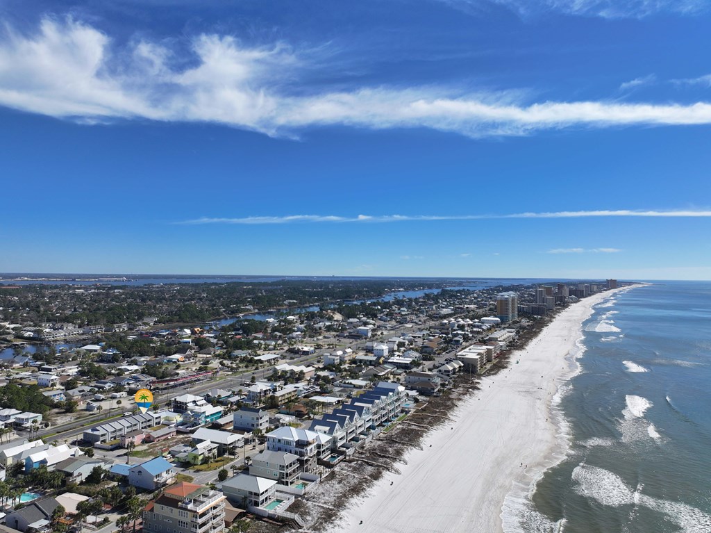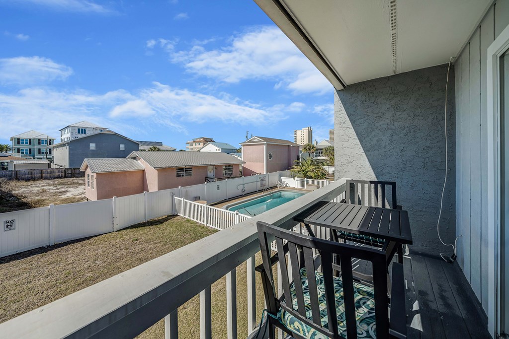 Looking for your own beach getaway? This townhome is just 100 feet from the sands of Panama City Beach with no road in between. Spacious and clean, the unit features a master bedroom balcony overlooking the courtyard and pool, plus very low HOA fees and only eight owners—so you'll almost always have the place to yourself. Downstairs offers a large living area with tile floors, a kitchen with solid wood cabinets, ample storage, a breakfast bar, and a full-sized laundry room. The patio and balconies have weatherproof decking and extra storage. Upstairs, both bedrooms fit king beds; the master features double closets and its own balcony with ocean sounds. The four-piece bath features a custom double-sink vanity with a marble countertop. Enjoy upgrades like storm doors, new lighting, LVP and tile floors, stainless appliances, and an upgraded washer and dryer—all included, along with most furniture, making it turn-key. Each unit has its own roof, so there are no shared roofing costs. Located steps from Beach Access 20, this property is for long-term tenants only, ensuring a quiet community with a large pool and patio for relaxing