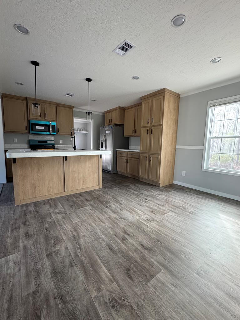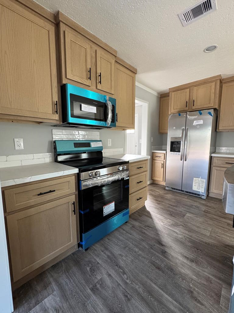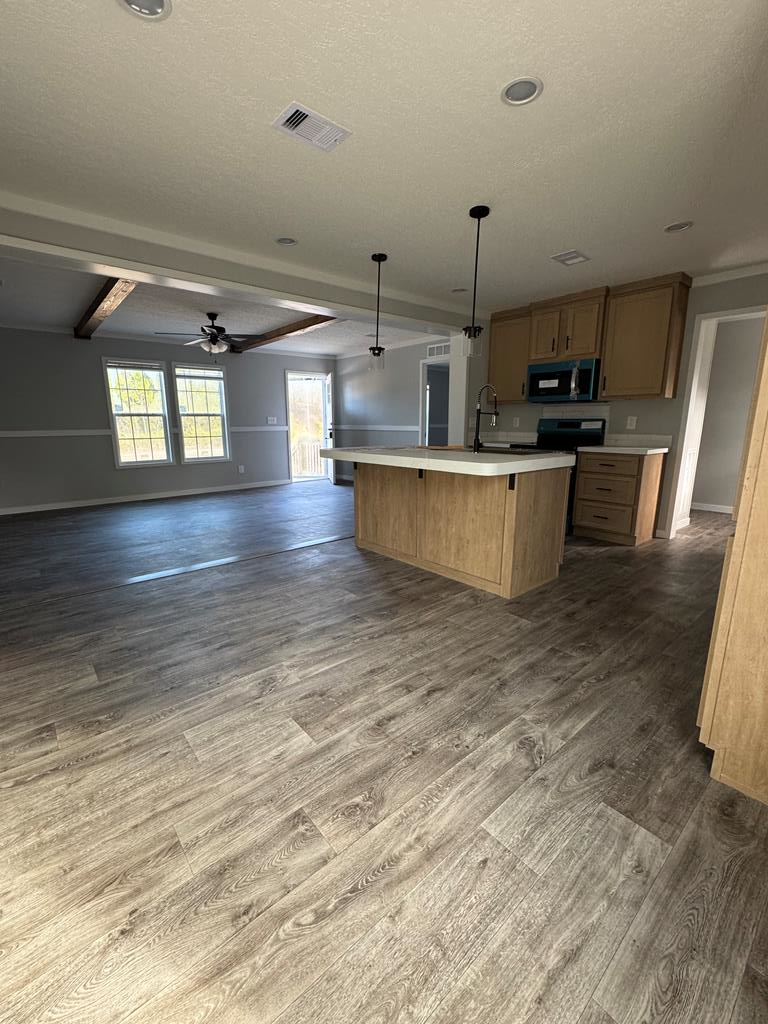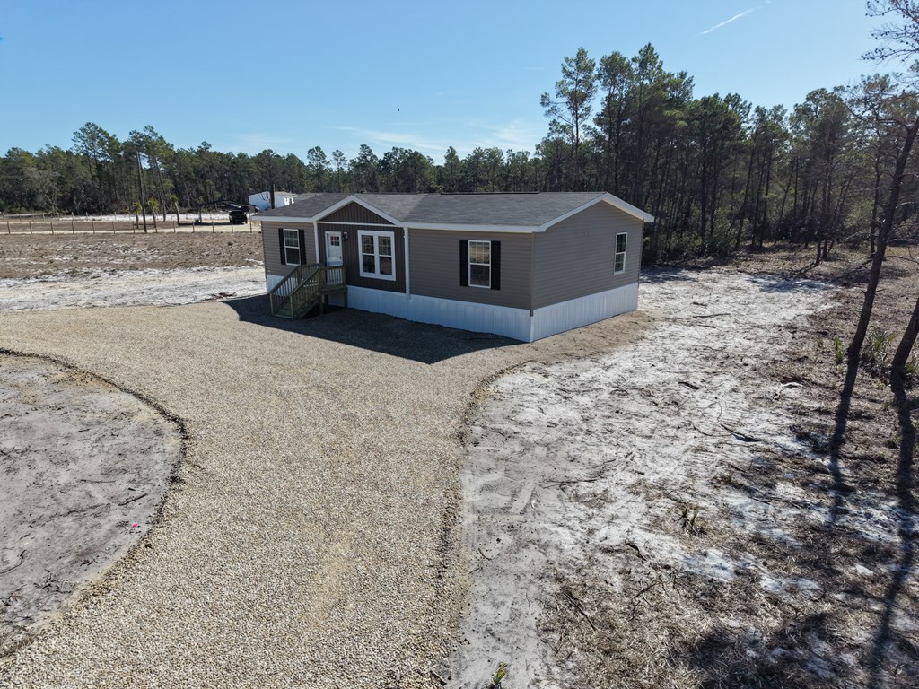 Welcome to this brand-new 2025 double-wide mobile home located in the Carrabelle Beach area within the county limits, offering the benefit of no city property taxes while still enjoying city water and sewer on a paved road. Designed with a split floor plan and an open-concept living, dining, and kitchen layout, this home provides both comfort and functionality. The kitchen features an abundance of cabinetry, a stylish tile backsplash, a center island, and comes complete with a full kitchen appliance package, making it truly move-in ready. The living room is highlighted by a real wood feature wall and wood ceiling beams, adding warmth and character to the space. A full blinds package is included throughout the home. A spacious laundry room offers additional storage and room for a deep freezer, ideal for family living or coastal convenience. The primary bedroom includes walk-in closets with wood shelving, while the ensuite bathroom features a large walk-in tiled shower and his-and-hers sinks. Located in the X flood zone, flood insurance should not be required with a lender. The property spans approximately 1.2 acres, extending past the curve, providing ample space and privacy. Enjoy close proximity to Carrabelle's public beach, making this an excellent option for a full-time residence, second home, or coastal getaway. One of the owner's is a licensed active real estate agent in Florida.