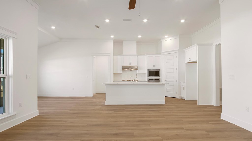 The Lily floorplan, our newest addition to WindMark Beach in Port Saint Joe, Florida. This thoughtfully designed home boasts elegant features and numerous large windows for an abundance of natural light. The Lily plan features four bedrooms, three full bathrooms, and a two-car garage. As you enter the foyer, grand tall ceilings and sleek EVP flooring dress the path to the living area. On your way to the heart of the home, you will pass two hallways on either side leading to the guest bedrooms, two full bathrooms, and the laundry room. The open concept living area is surrounded by large windows, flooding this grand space with natural light and giving views to the covered back patio. A large kitchen island sits overlooking the family room making entertaining a breeze. The sleek quartz countertops, tall white Shaker-style cabinetry, and Herringbone backsplash are sure to catch your eye. The family chefs will love the gas burning stovetop range, ceramic farmhouse sink in the island, and the walk-in corner pantry with built-in wood shelving. On the other side of the kitchen, a secluded hallway leads to the primary suite. In addition to added privacy, this bedroom offers elevated tray ceilings and three large windows. The picturesque bath ensuite features an oversized tile shower with a glass door, separate soaking tub, dual sink vanity, and a large walk-in closet with wooden shelving. Beyond the interior features and details, every home is equipped with Smart Home Technology. This thoughtful integration of technology ensures that your new home is perfectly designed to meet the demands of modern life. Enjoy quality materials and workmanship throughout, with superior attention to detail, in addition to a one-year builder's warranty. The community features a town center with food, shopping, a gym, and more. There are boardwalks, bike and golf cart paths, and beach accesses along with two community pools and breathtaking views of the Gulf of America. Call us for a tour!