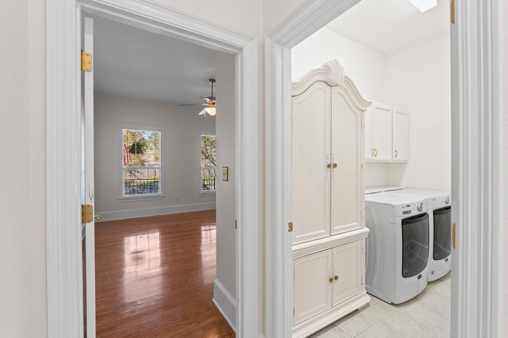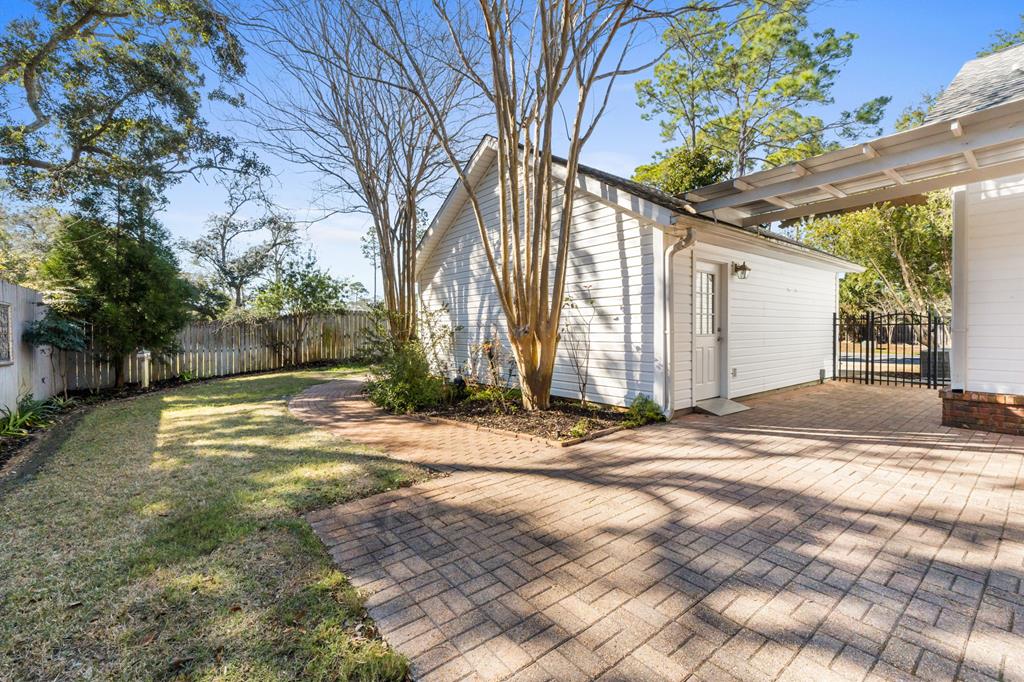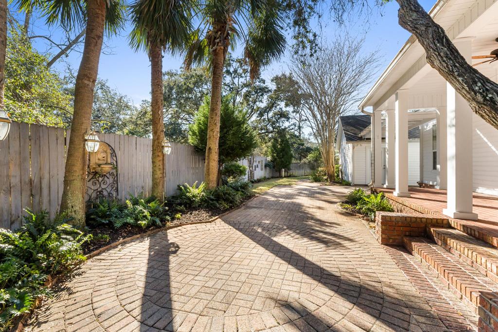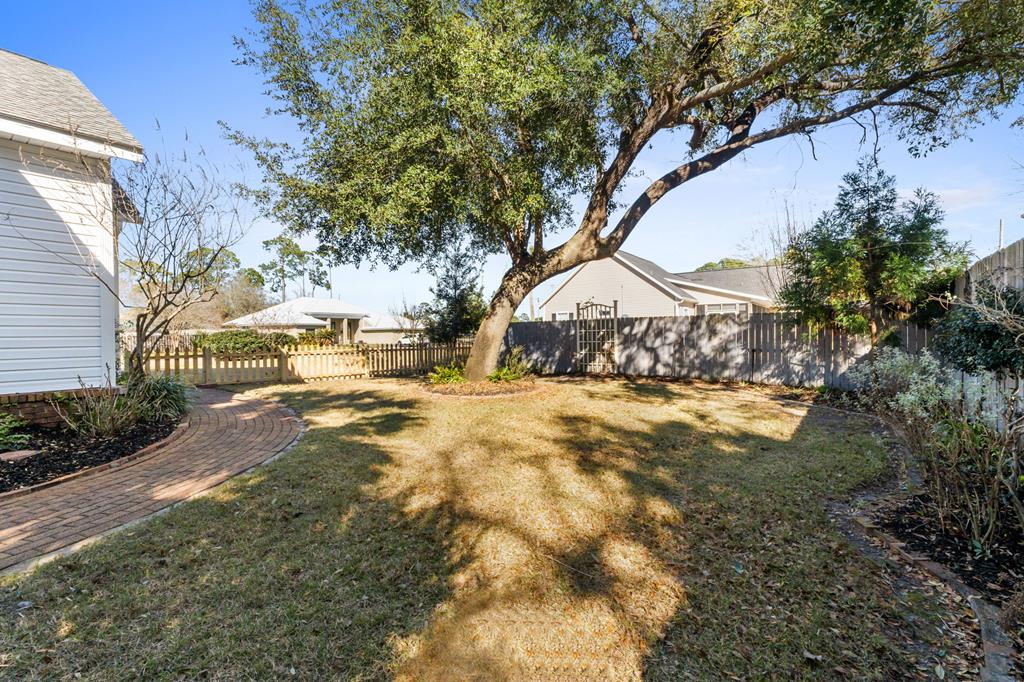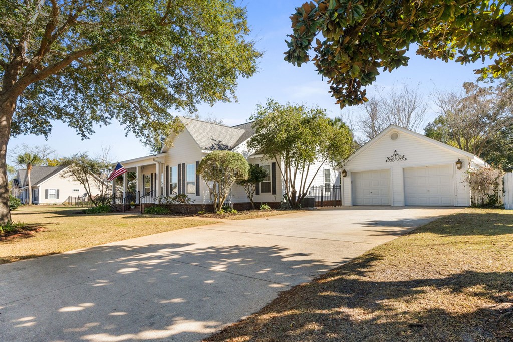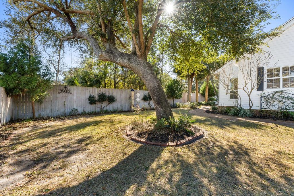 BEAUTIFUL, WELL MAINTAINED HOME, WITH SPLIT FLOORPLAN, AND HIGH CEILINGS!!! This home has awesome curb appeal with landscaping around the entire home done by the owner that had a green thumb and artistic eye. You enter the home from a covered porch which has a hanging swing, catching the breeze coming off the bay. Then you open the front door, seeing past the entryway with chandelier, to the backyard through the multiple windows and door. The living room has the high ceilings, a fireplace, built in bookcases, along with the sun coming into the house through all these back windows and rear door which opens onto the covered porch in the back of the house. To the right side of the home when entering you will find two nice size bedrooms and a bathroom with a large storage closet in the hall. As you go through the living room, you'll go to the left and enter the dining area and the large kitchen, which also boast many windows, making this area bright and cheery as well. The large walk in laundry room is next to the very roomy master bedroom and master bath. The master bath has an area you could add a claw tooth tub if desired, with plumbing already in place. (the previous owner choose to remove tub and replace with a piece of furniture she wanted). The detached 2 car garage is perfect for cars, golf cart, workshop, etc. There is room on the side of the garage or in front of the fence if needed for kayaks, longboards, etc. THIS property is a well-built home with a lot of character and charm just a golf cart ride away from shops, schools, restaurants, grocery stores, pickleball court, and the bay. Come see for yourself, since seeing is believing!!!!