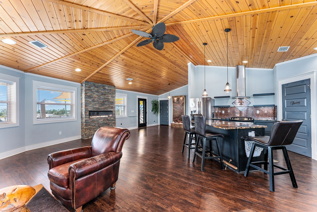 This 3BR/2.5BA Deltec-built home in Mexico Beach combines solid construction, thoughtful design, and an exceptional coastal setting—offering confidence and comfort for relaxed beachside living. From the moment you arrive, you'll appreciate the ample parking and oversized heated and cooled storage area. Access the main living level by stairs or enjoy the convenience of the electric lift. Once inside, the light-filled living room immediately draws you in with a wall of windows that provides front-row views of the water—perfect for watching birds, boats, and daily coastal activity. Vaulted ceilings enhance the open-concept layout, complemented by wood floors and a cozy fireplace that anchors the space. The kitchen is well equipped with granite countertops, soft-close cabinetry, a gas stove, walk-in pantry, and a spacious island with additional seating. Two comfortably sized guest bedrooms offer plenty of room for family or visitors, while the primary suite features two cedar-lined walk-in closets and an ensuite bath. Step onto the private balcony to enjoy quiet moments or your morning coffee with a view. Additional features include solar panels, a whole-house Generac generator, and a fenced yard with garden beds and fruit trees. Ideally located near sugar-white beaches, fishing, and boating, the home is also close to dining and local entertainment. With nearby beach access, a city pavilion with restrooms and picnic tables, a convenient boat ramp, and no HOA fees, this property is equally well suited as an investment opportunity or a personal coastal retreat.