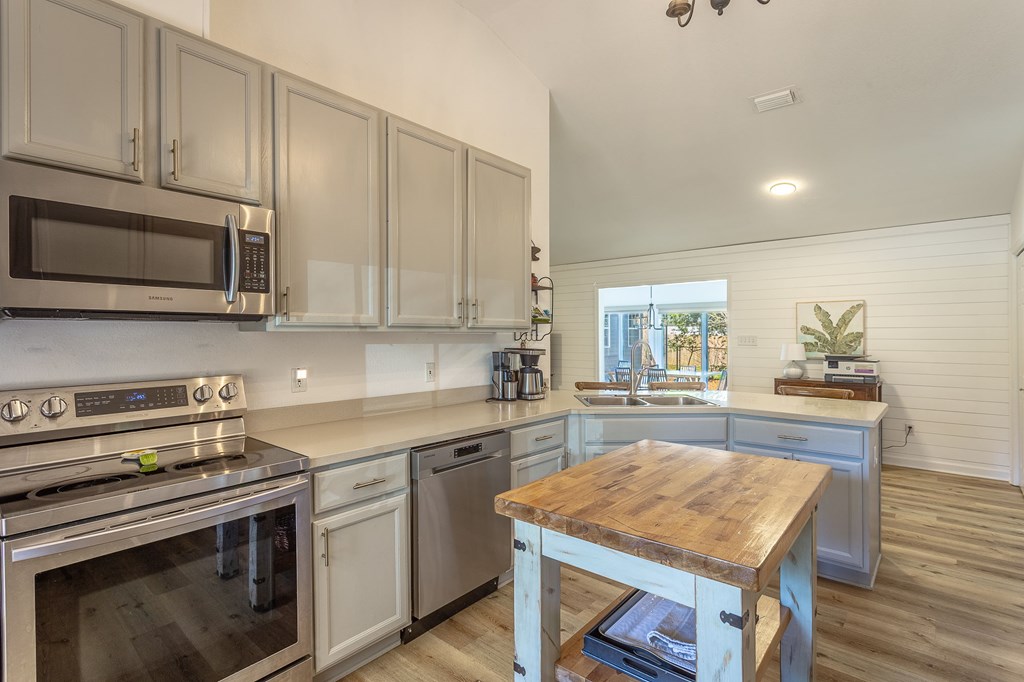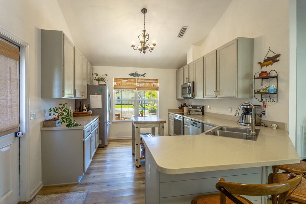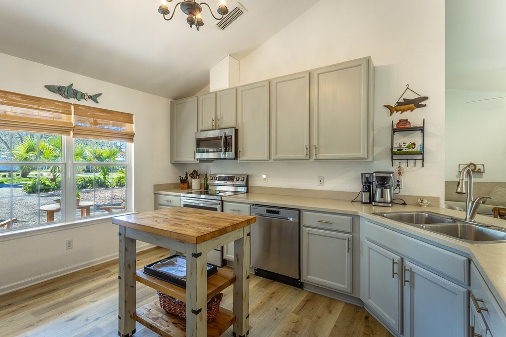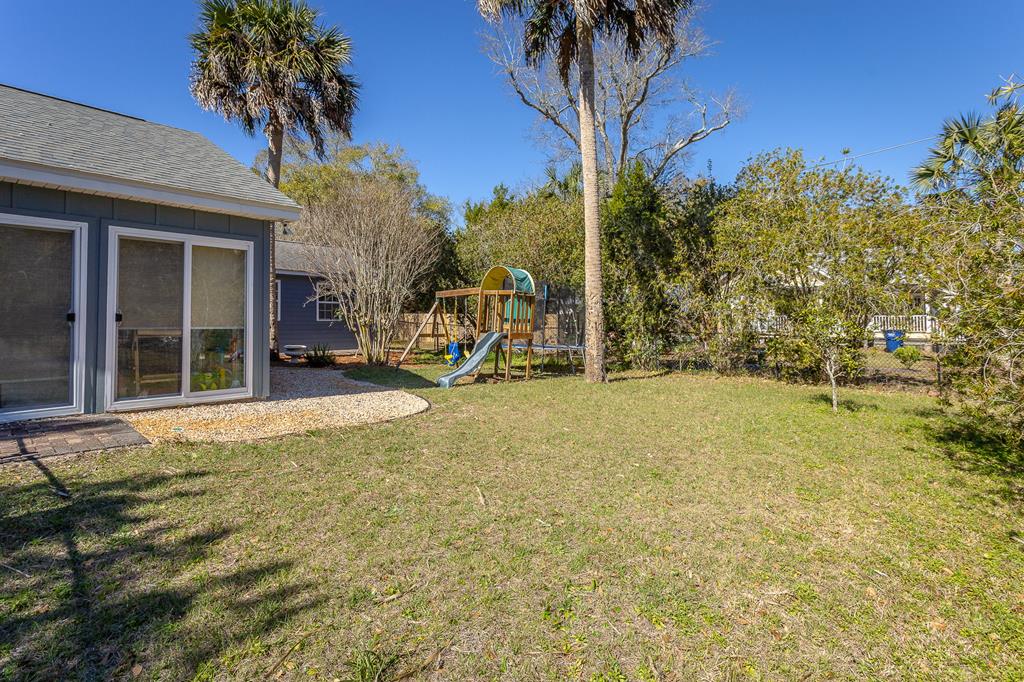 Located in the Historic Southside of Apalachicola, this 3BR/2BA home delivers 1,644 square feet of comfortable living space on a 90' x 100' lot and a half, with a fenced back yard and rare separate garage building! Vaulted ceilings give the main living area height and character, while generous windows keep the home light and welcoming – all ground level for easy mobility. The sunny Florida room across the back adds a fantastic flex space; use it as a dining space, creative studio, or home office - you'll use this spot every day! The kitchen is on the side of the great room with updated 2020 appliances, plenty of counter space and a separate pantry. This home has been well maintained and well loved with a new roof in 2020. A patio connects the home to the garage, creating an easy flow for entertaining, grilling, or simply enjoying the fenced backyard. With the expanded homesite, there's room to garden, play, add a firepit, or just appreciate the extra breathing room. The location strikes an ideal balance: just four blocks to Lafayette Park and less than a mile to downtown shops, restaurants, and the waterfront. Set in a golf-cart-friendly neighborhood, evenings out and fishing from the piers are just a quick ride away. If you've been waiting for space, updates, low maintenance and a prime Southside address with personality, this one checks the boxes!
