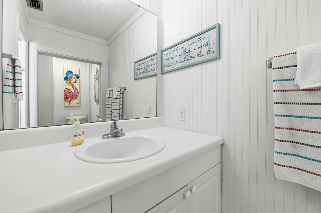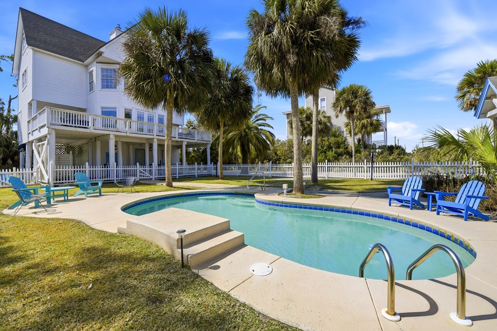 Welcome to Buddy's Bungalow on beautiful St. George Island — a one-of-a-kind three-story coastal retreat with character, space, and unforgettable architectural details. This 3 bedroom, 3 bathroom home also offers an additional sleeping area, comfortably accommodating family and guests while maintaining privacy throughout the home's thoughtful layout. From the moment you step inside, you're greeted by soaring 30-foot vaulted ceilings in the main living area, creating a dramatic yet inviting space filled with natural light. Rich heart pine flooring runs throughout, adding warmth and timeless charm. The first level features the living room, the kitchen, formal dining area, full bathroom, and a convenient laundry room — everything you need for effortless everyday living or entertaining. The second floor overlooks the grand living space below and includes two guest bedrooms connected by a Jack-and-Jill bathroom. This level also offers a versatile additional sleeping nook that could easily function as a sitting area, reading loft, or future home office. The third-story primary suite is truly a retreat of its own. Loft-style in design, this private master sanctuary features a king bed area, a beautiful clawfoot soaking tub, and a large walk-in shower — creating a spa-like atmosphere high above it all. Step outside and enjoy your own backyard oasis. The private pool with a waterfall feature provides the perfect setting for relaxation, while the gazebo adds shaded space for entertaining or unwinding after a day at the beach.