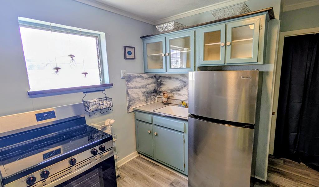 Head East from Carrabelle approx 6 miles. At Lanark Village turn left onto Parker Ave. Turn left onto Pine Street. Unit is on the left, sign in front yard.