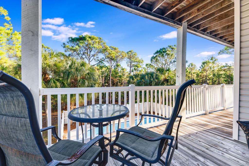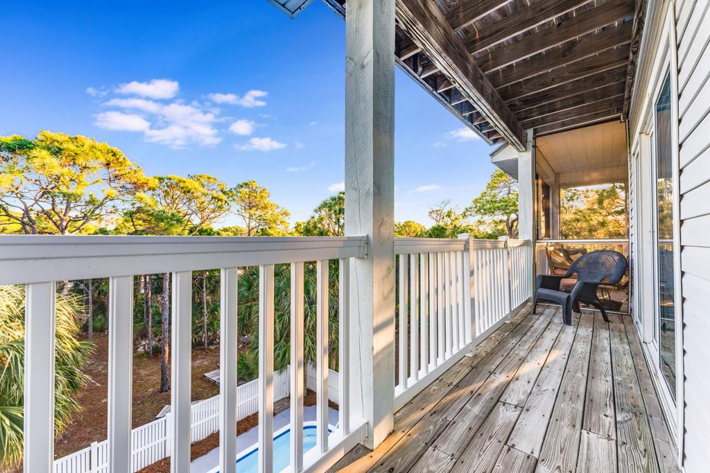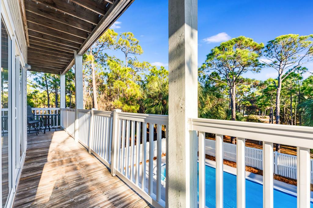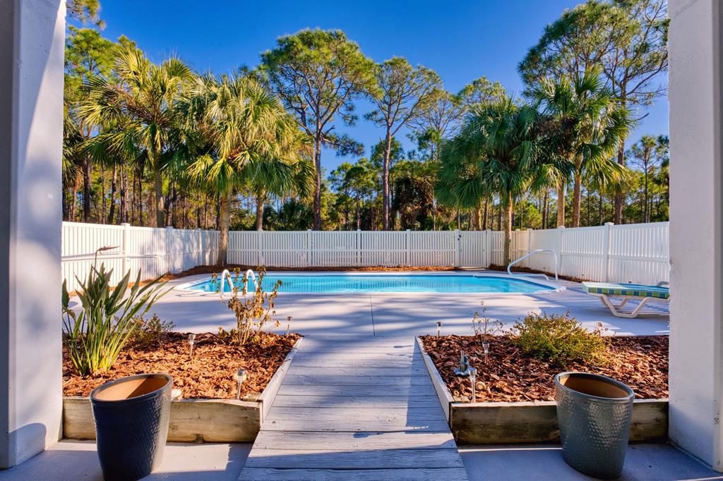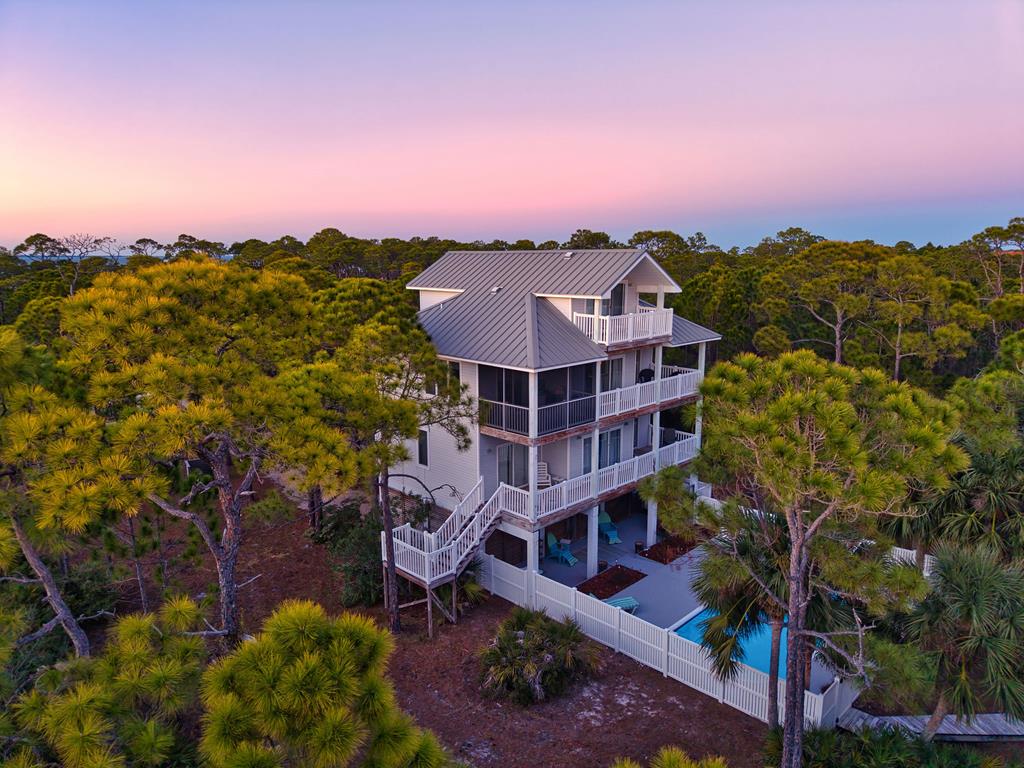 Meet "Bayside Beauty" a lovely island retreat tucked inside the gates of the St. George Island Plantation! This is the kind of home that makes a stunning impression the minute folks drive up. Gorgeous vegetation with mature scrub oaks and palms surround the private lot. Step inside and you will recognize that it has been beautifully remodeled and lovingly maintained. The open second floor is the main living area and is perfect for gathering, whether you are mixing drinks at the custom bar in the open living area or sharing dinner with family and friends adjacent to the open kitchen. After your meal, enjoy gorgeous sunset views on the ample decks surrounding the home. Hardwood floors, granite countertops, stainless appliances along with spacious private bedrooms are just a few of the lovely assets of this home. There is even a screened sitting area for morning coffee or evening conversations when the breeze is just right. The first floor has 2 bedrooms, each with their own full baths and private decks overlooking the pool. A middle bedroom gives you flexibility for an office, studio, bunk or game room. The top floor bedroom is considered the primary suite, peaceful and isolated with a full bath. Enjoy the private deck to watch the sun come up over the island which is absolutely the best way to start the day! Entertaining is easy here with the private pool area being spacious and inviting, with a covered spot ready for your future outdoor kitchen setup for grilling and or just relaxing in the shade. All of this without feeling overcrowded. The home offers plenty of storage as well, which can be used for personal or rental gear. Take a quick and easy walk to the beach with a beach access path directly behind the home. "Bayside Beauty" is not just pretty but it is warm, welcoming, and ready to find its new island homeowner! A MUST See!
