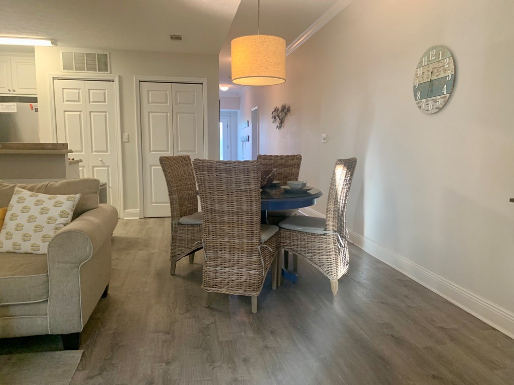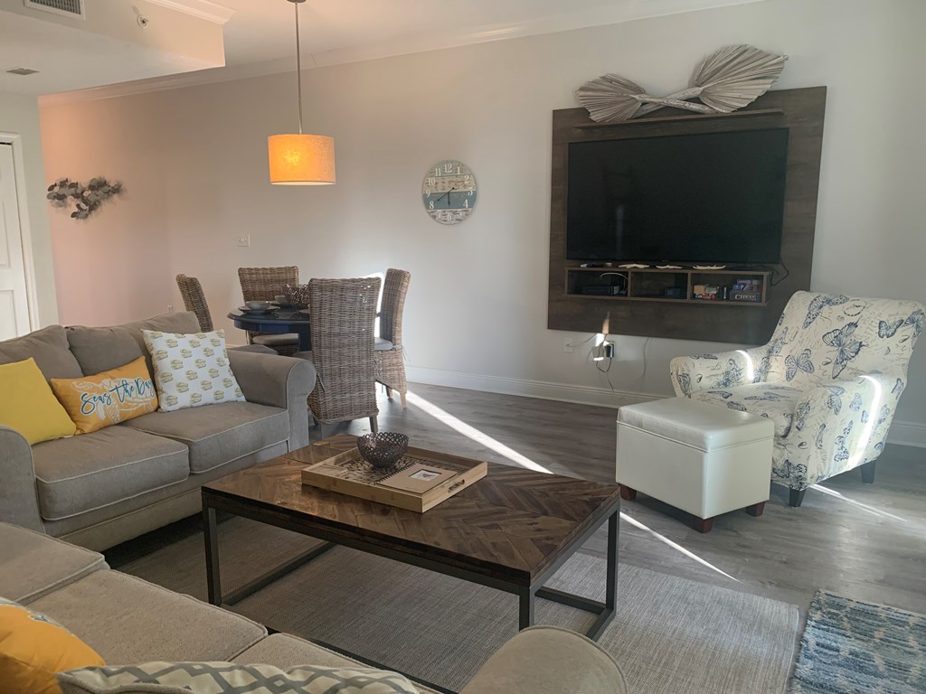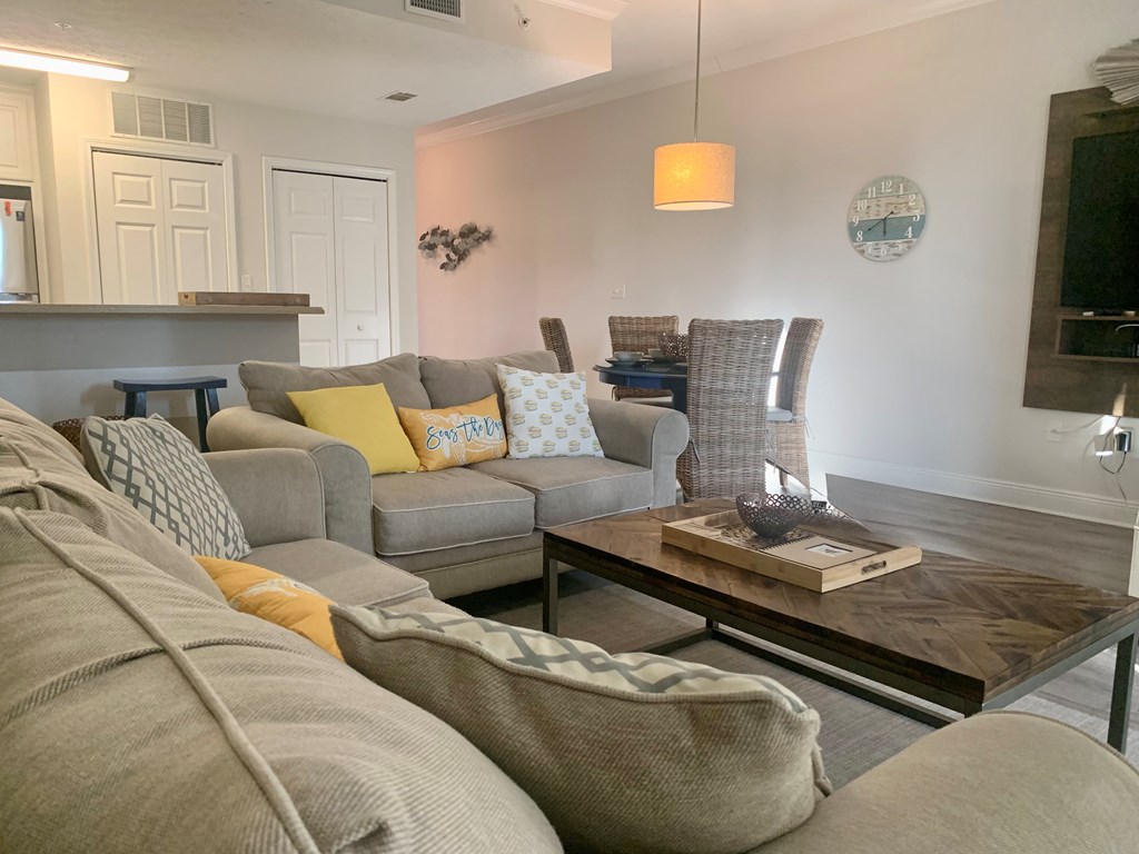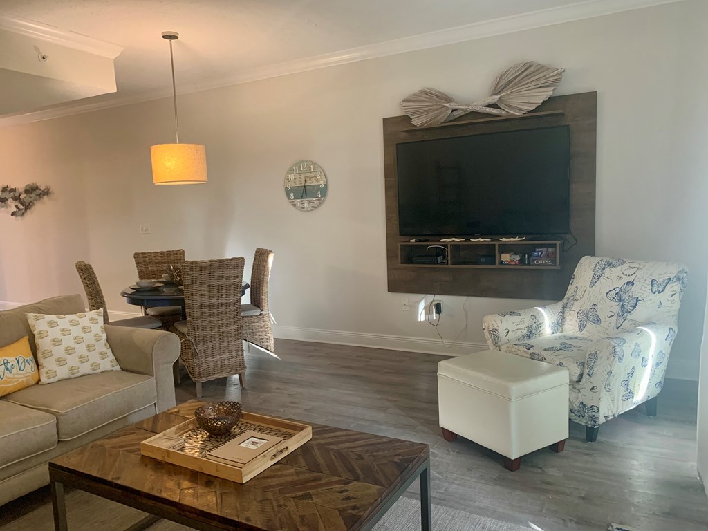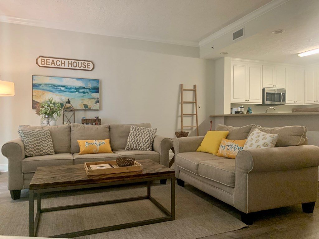This inviting 2-bedroom, 2-bath condo at Summerhouse is offered turnkey and fully furnished, making it an easy choice for personal enjoyment or investment potential. The spacious primary suite includes an ensuite bath with a tiled tub/shower combination, while the guest bedroom offers comfortable accommodations for visitors. A built-in single bed tucked into the hallway adds extra sleeping space and is a favorite feature for kids. The condo sleeps 7 comfortably. The well-designed kitchen is ideal for preparing meals and includes a convenient breakfast bar for additional seating. An open-concept living area feels bright and airy, providing plenty of space to relax and gather after a day at the beach. Glass sliding doors lead to the balcony, allowing water views to be enjoyed both indoors and out. Community amenities include an elevated pool with views of the Gulf, along with a hot tub, sauna, and restrooms. Located in Mexico Beach, this condo is centrally positioned near beaches, fishing and boating, local dining, music venues, and shopping.