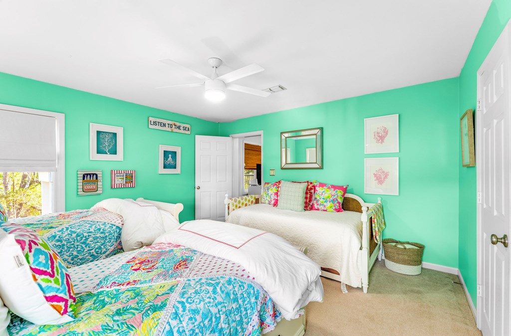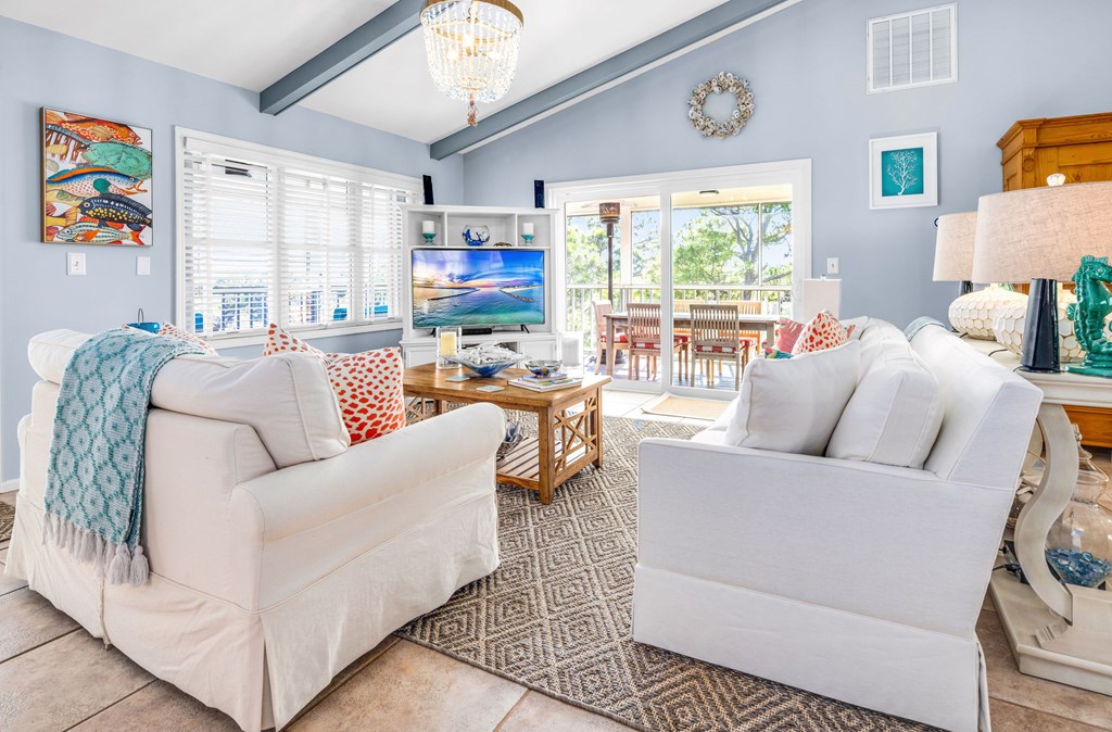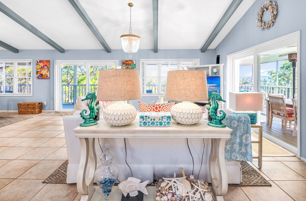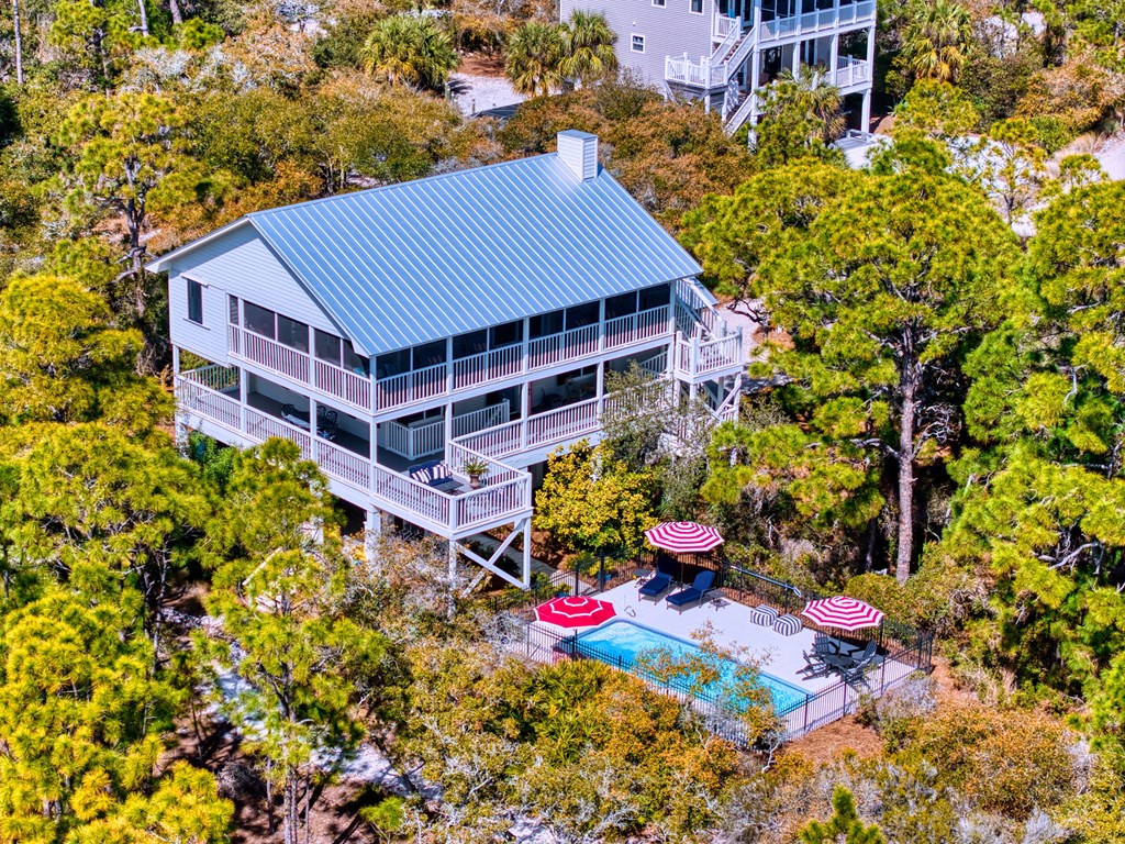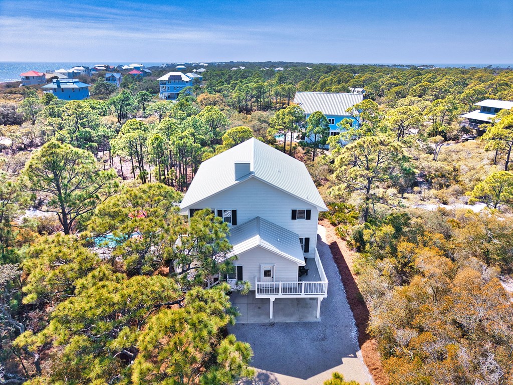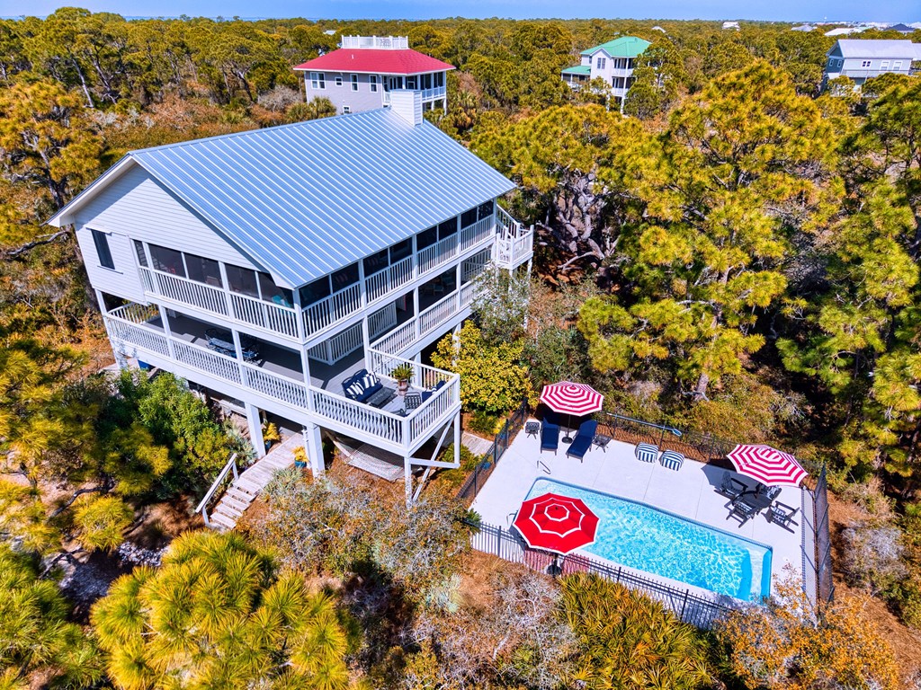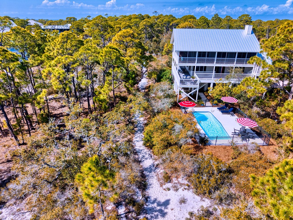 Second-tier St. George Island retreat just 225 steps from the beach, with the beach path only moments away. This private 3-bedroom, 4-bath home offers relaxed coastal living with a private pool, expansive decking, and peaceful wooded surroundings. The home features a newer roof and comes fully furnished with Regina Andrew lighting, Frontgate and Ballard Designs furnishings, and custom window treatments, making it move-in or rental ready. Inside, the open-concept living area flows into an updated kitchen with quartz countertops, double ovens, and a wine refrigerator—perfect for gathering after a day at the beach. The spacious primary bedroom includes a walk-in closet and room to unwind, while the second bedroom is currently set up as a kids' room with an attached flex space used as a sitting/TV area, offering versatility for a playroom, media room, or additional sleeping space. Multiple decks create inviting outdoor spaces, and the private pool provides the perfect place to cool off after a day in the sun. The property is professionally landscaped by Tallahassee Nurseries, enhancing the natural beauty and privacy of the setting. Ideal as a full-time residence, vacation getaway, or investment property, this home captures the best of island living. New Buyer fee .50% to be paid to SGPOA at closing.