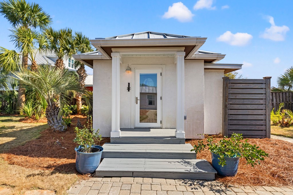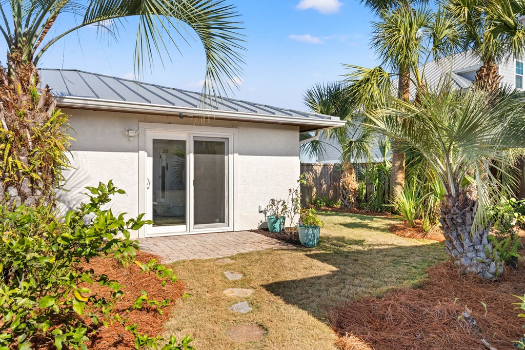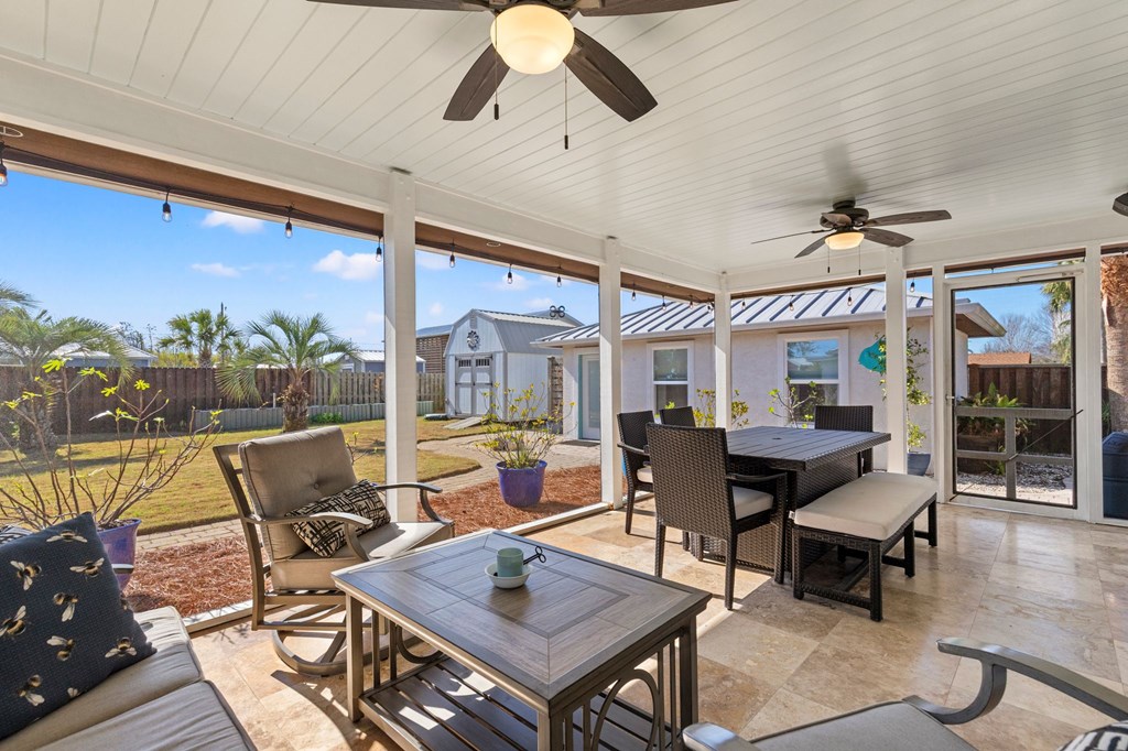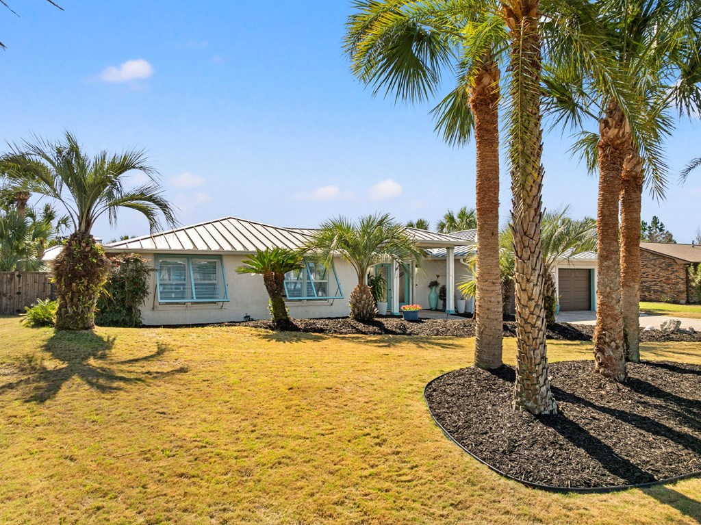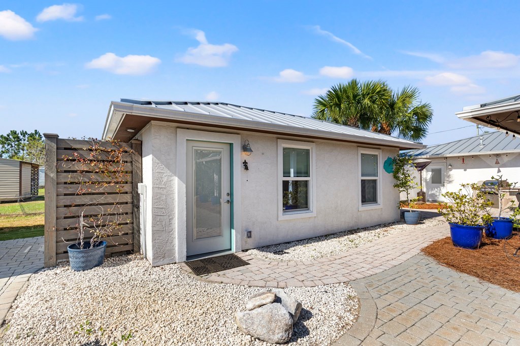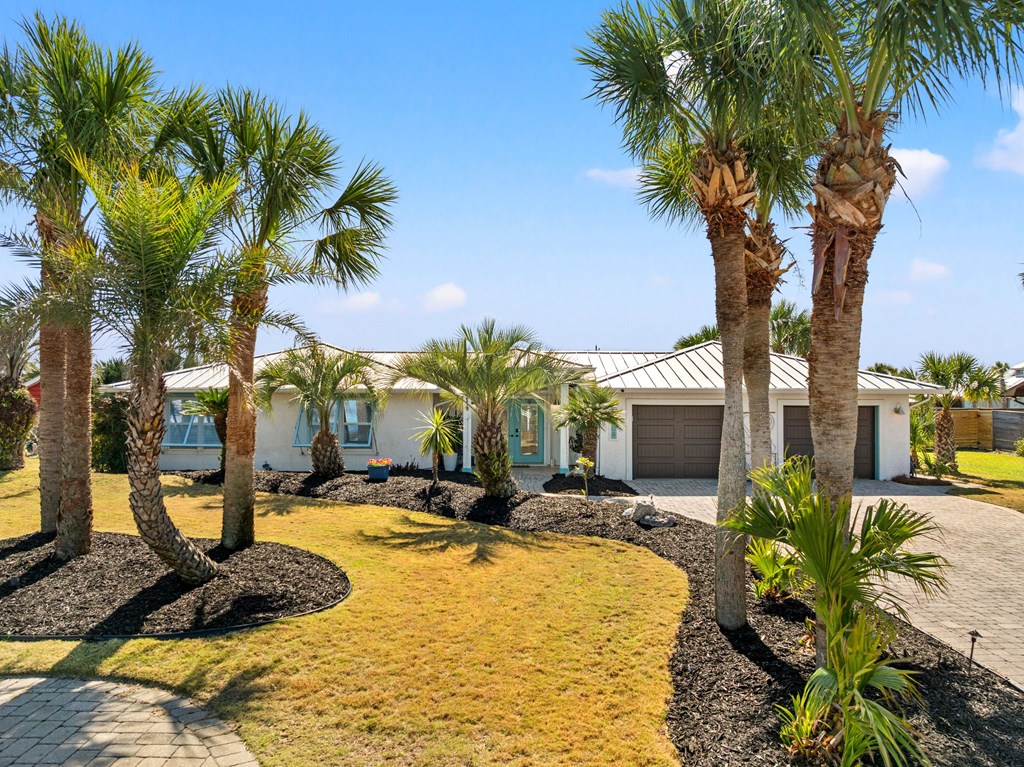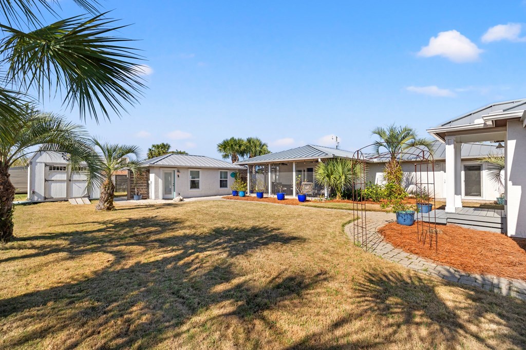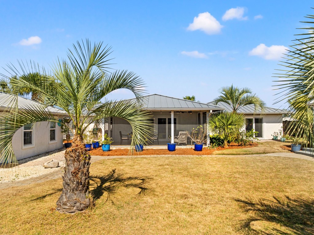 Welcome to Serenity on Seventh, a beautifully designed coastal retreat located just moments from the sugar-white sands of Mexico Beach. This thoughtfully designed property offers the perfect blend of comfort, privacy, and indoor-outdoor living with a unique courtyard-style layout. The main home features an inviting open floor plan with travertine flooring, crown molding, and abundant natural light throughout. The spacious living area is centered around a cozy fireplace with custom built-ins and a wet bar, creating an ideal setting for relaxing or entertaining. The kitchen flows seamlessly into the dining and living areas, enhancing the home's open and welcoming feel. Step outside to a beautifully landscaped courtyard-style backyard, where paver walkways, palm trees, and tropical landscaping create a private outdoor oasis. The large screened-in porch with ceiling fans and comfortable seating overlooks the courtyard and provides the perfect place to enjoy coastal breezes year-round. A rare and highly desirable feature of this property is the presence of two separate casitas, each offering private entrances and flexible living space. These guest suites provide excellent options for visiting family and friends, private home offices, or potential rental opportunities. Additional highlights include an outdoor shower, metal roof, paver patios and pathways, and a storage shed, all surrounded by well-maintained tropical landscaping that enhances the relaxed coastal atmosphere. Whether you're looking for a primary residence, a second home, or a property with income potential, Serenity on Seventh offers a unique opportunity to enjoy the laid-back lifestyle of Mexico Beach.