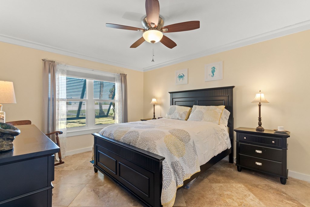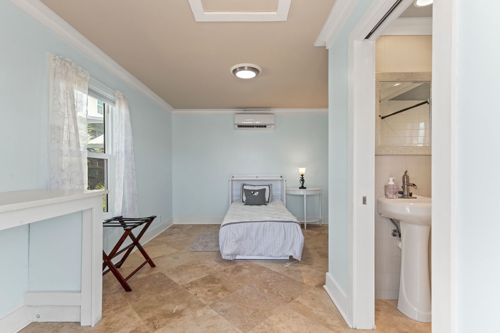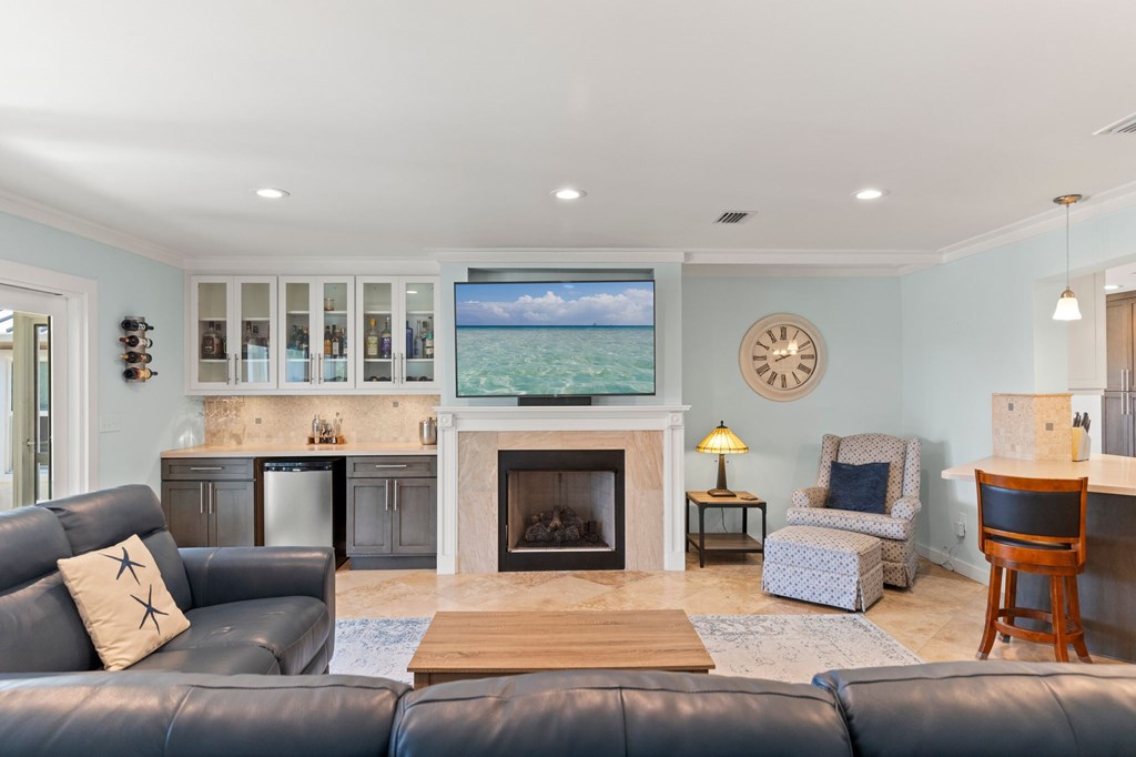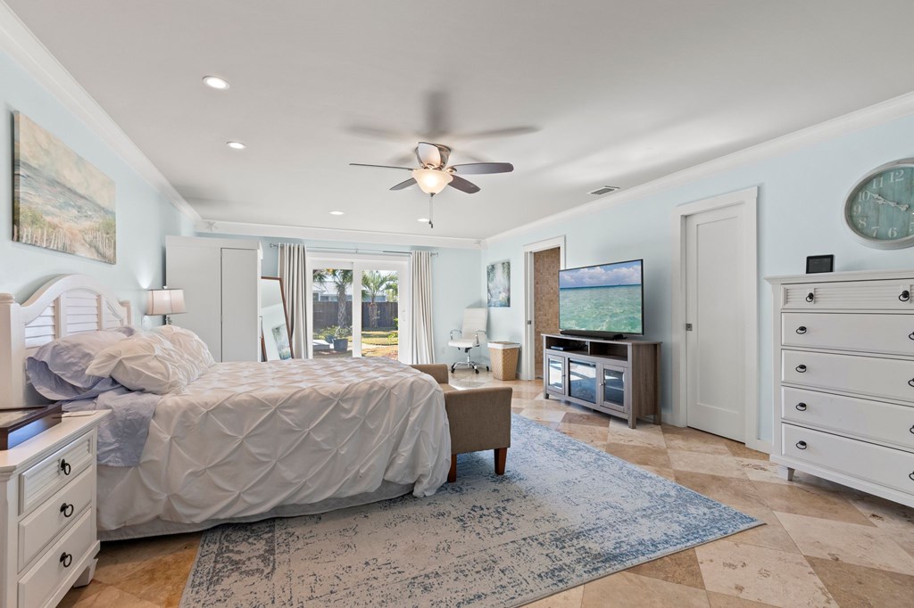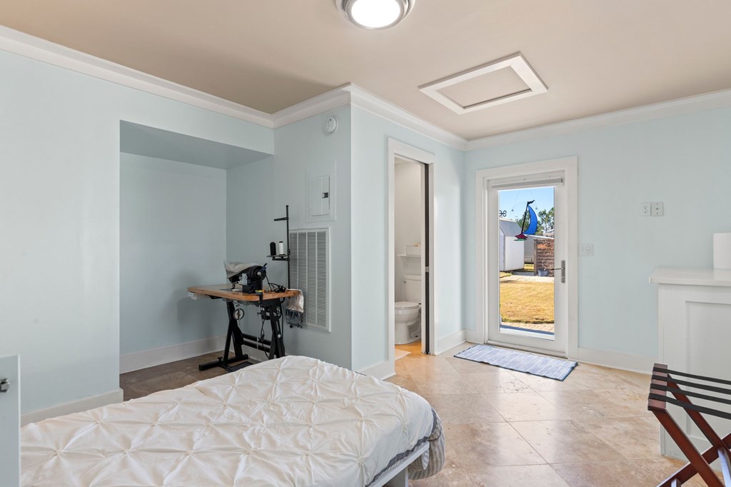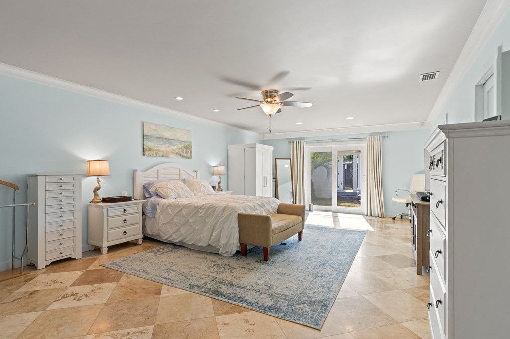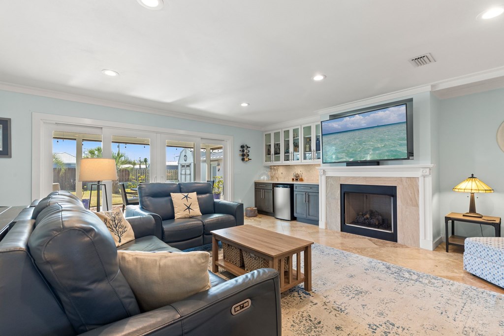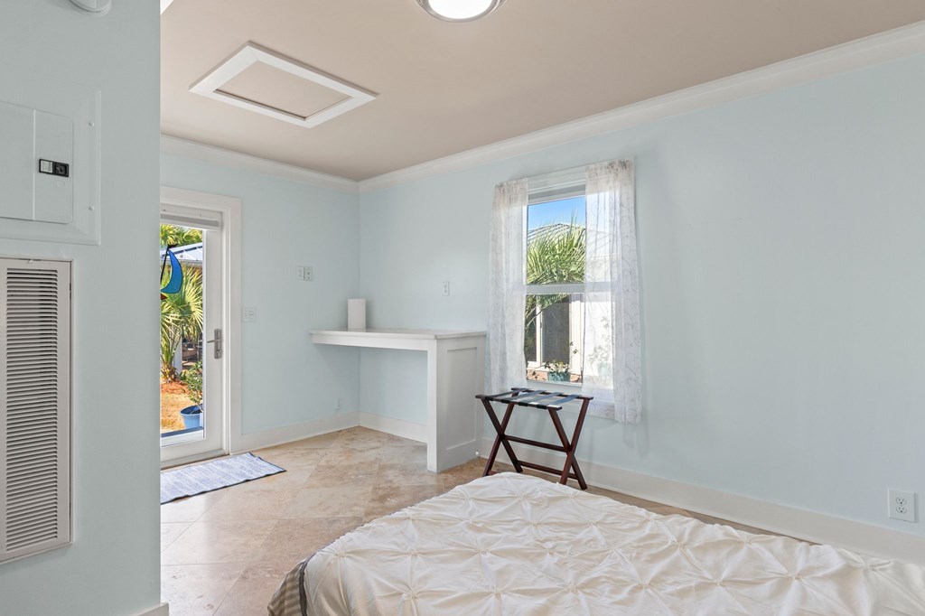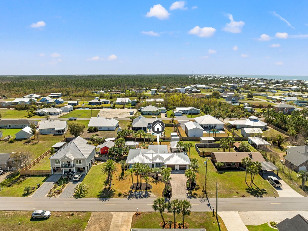 Welcome to Serenity on Seventh, a beautifully designed coastal retreat located just moments from the sugar-white sands of Mexico Beach. This thoughtfully designed property offers the perfect blend of comfort, privacy, and indoor-outdoor living with a unique courtyard-style layout. The main home features an inviting open floor plan with travertine flooring, crown molding, and abundant natural light throughout. The spacious living area is centered around a cozy fireplace with custom built-ins and a wet bar, creating an ideal setting for relaxing or entertaining. The kitchen flows seamlessly into the dining and living areas, enhancing the home's open and welcoming feel. Step outside to a beautifully landscaped courtyard-style backyard, where paver walkways, palm trees, and tropical landscaping create a private outdoor oasis. The large screened-in porch with ceiling fans and comfortable seating overlooks the courtyard and provides the perfect place to enjoy coastal breezes year-round. A rare and highly desirable feature of this property is the presence of two separate casitas, each offering private entrances and flexible living space. These guest suites provide excellent options for visiting family and friends, private home offices, or potential rental opportunities. Additional highlights include an outdoor shower, metal roof, paver patios and pathways, and a storage shed, all surrounded by well-maintained tropical landscaping that enhances the relaxed coastal atmosphere. Whether you're looking for a primary residence, a second home, or a property with income potential, Serenity on Seventh offers a unique opportunity to enjoy the laid-back lifestyle of Mexico Beach.