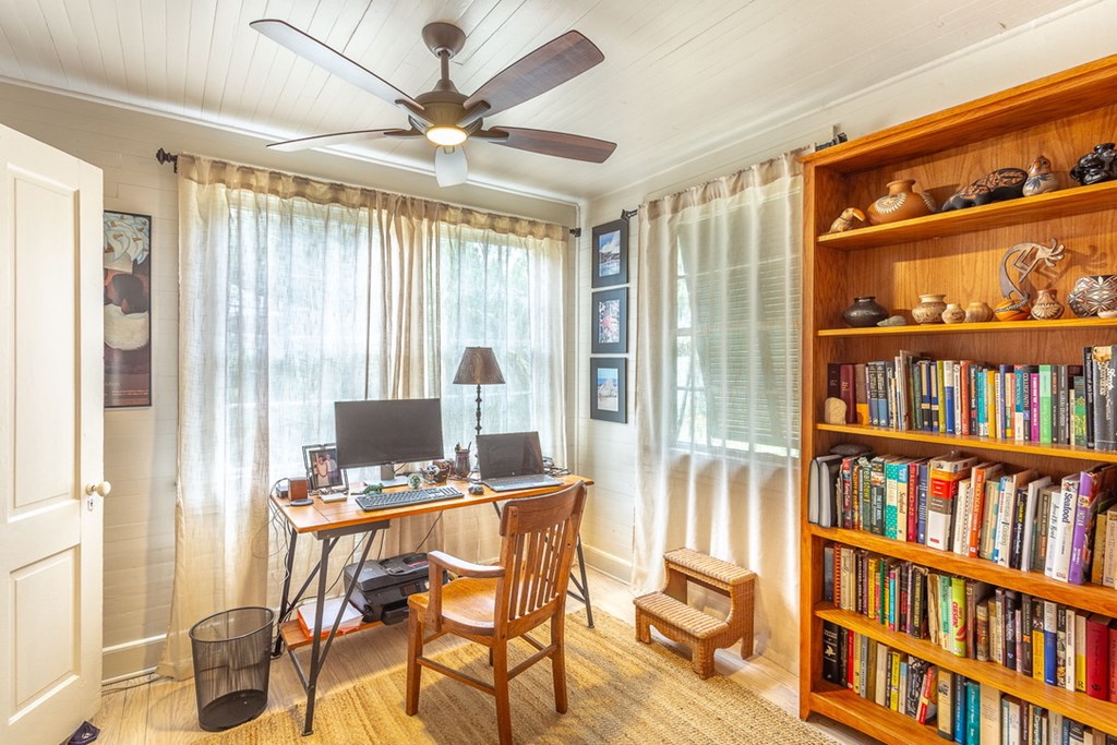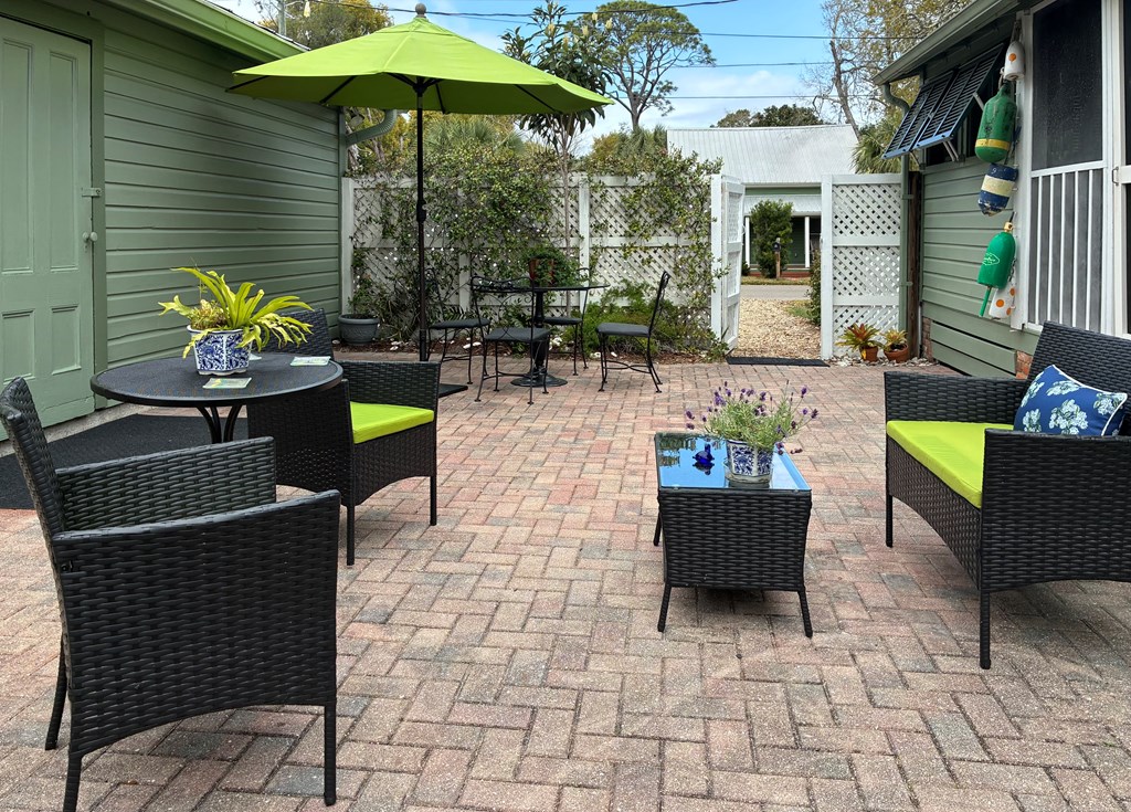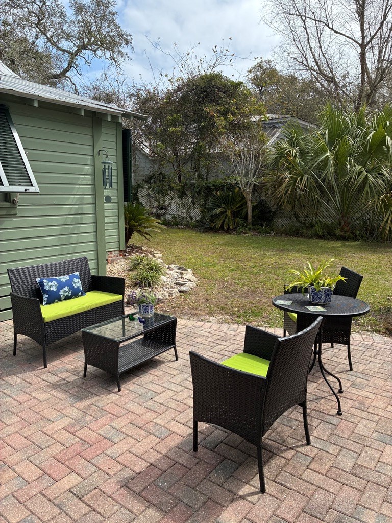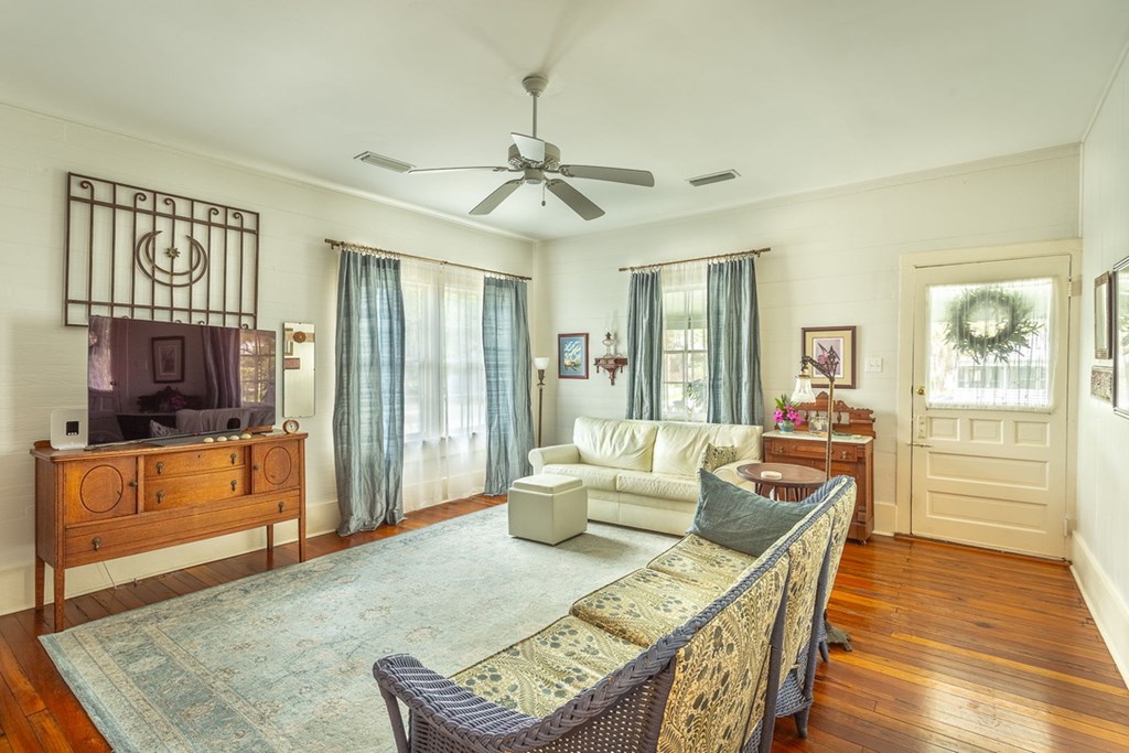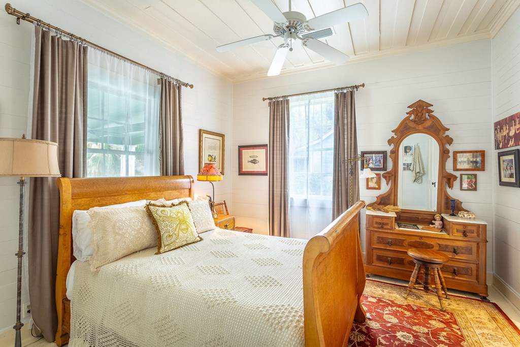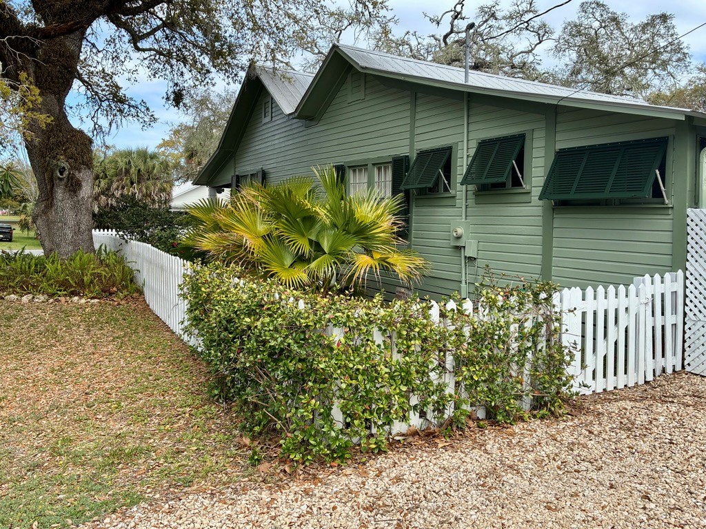 Step back in time with this charming 1840s Florida Cracker Cottage in Apalachicola's treasured Historic Southside. Situated on a corner lot just two blocks from Battery Park City Marina, this beautifully preserved 3BR/2BA home blends authentic historic character with thoughtful modern updates. Believed to date to the mid-1840s, the home is a classic example of Florida vernacular architecture, featuring heart pine floors, cypress fireplace mantels, wood walls and ceilings, and many original windows that reflect the craftsmanship of the era. The front of the home began as a traditional two-pin design with twin chimneys, and around 1900 an additional structure was incorporated, creating the larger home seen today while preserving elements of the historic dog-trot layout. Inside, historic warmth and character shine throughout the living and dining areas, anchored by the unique angled corner fireplaces that once served both rooms. The cottage kitchen is filled with natural light and efficient working triangle with gas stove and stainless appliances. The kitchen opens to the laundry room and back screened porch, then to the charming brick patio and fenced yard. The detached shed/garage offers flexible space for golf cart storage plus a studio ideal for writing, sewing, or a private office. Recent improvements provide peace of mind, including a new heat pump, tankless water heater, water softener system, attic insulation, and Miami-Dade rated hurricane shutters on all windows and doors. Additional updates include exterior painting, rebuilt fencing, upgraded plumbing, and newer appliances. Enjoy the best of Apalachicola living sitting on the shady front porch enjoying bay breezes, just two blocks from riverfront views at Battery Park, downtown shops and restaurants. Rarely does a property combine nearly two centuries of history, preserved architectural detail, and modern updates in such a walkable, historic location.