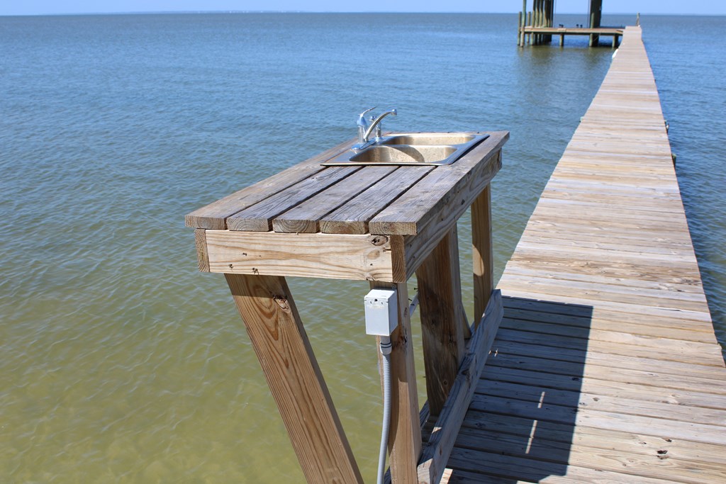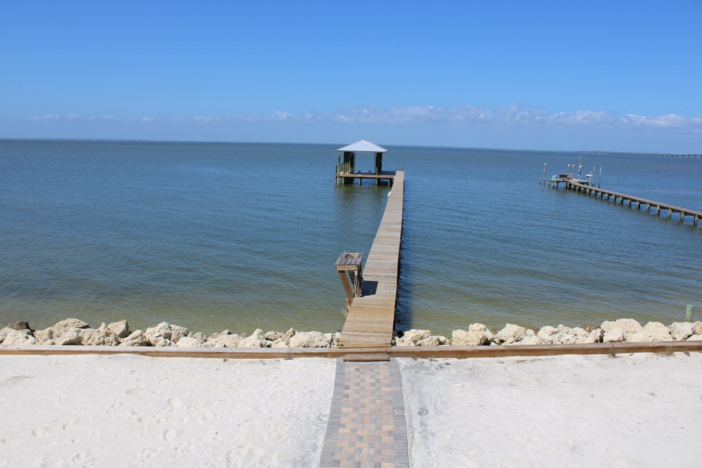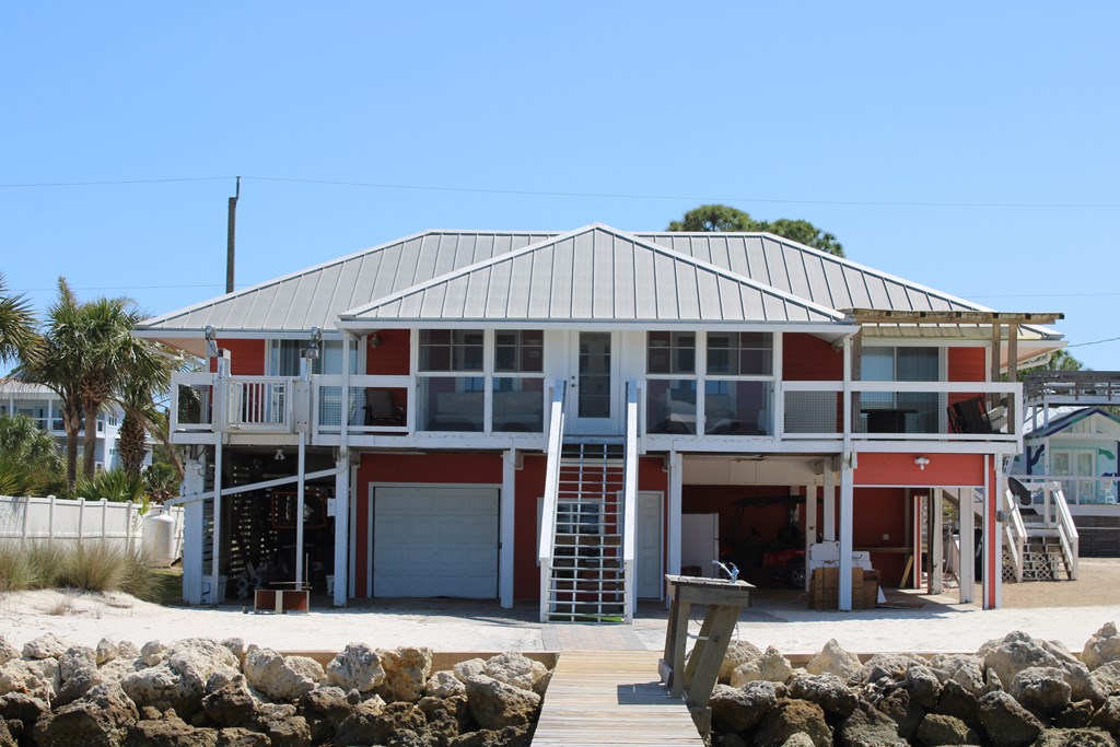 Enjoy breathtaking sunsets over the Bay from this well- maintained waterfront home located in a quiet, golf-cart-friendly neighborhood on St. George Island. Perfect for a family fishing retreat, full-time residence, or investment property, this home features a private dock with covered 15,000lb boat lift and and a fish cleaning station, making it ideal for anglers and boaters alike. A durable vinyl seawall with rip rap protects the shoreline, while your own sandy beach area offers the perfect place to relax and enjoy the water. Multiple outdoor living spaces—including two sun decks, and a large enclosed porch with window AC overlooking the bay. Inside, the home offers comfortable single-level living with granite countertops, tile flooring in the main living areas, and beautifully refinished pine floors in the bedrooms. The split-bedroom floor plan provides privacy, and the spacious primary suite features an en-suite bath and cedar-lined walk-in closet. The master and one guest bedroom open to sun porches with water views. Additional features include cedar-lined closets, a handy cargo lift, and two large storage areas underneath the home as parking space for a golf cart or small boat. Located just a short walk to beach access at 7th Street, this well-cared-for property has never been a rental but offers excellent potential as a vacation rental investment.