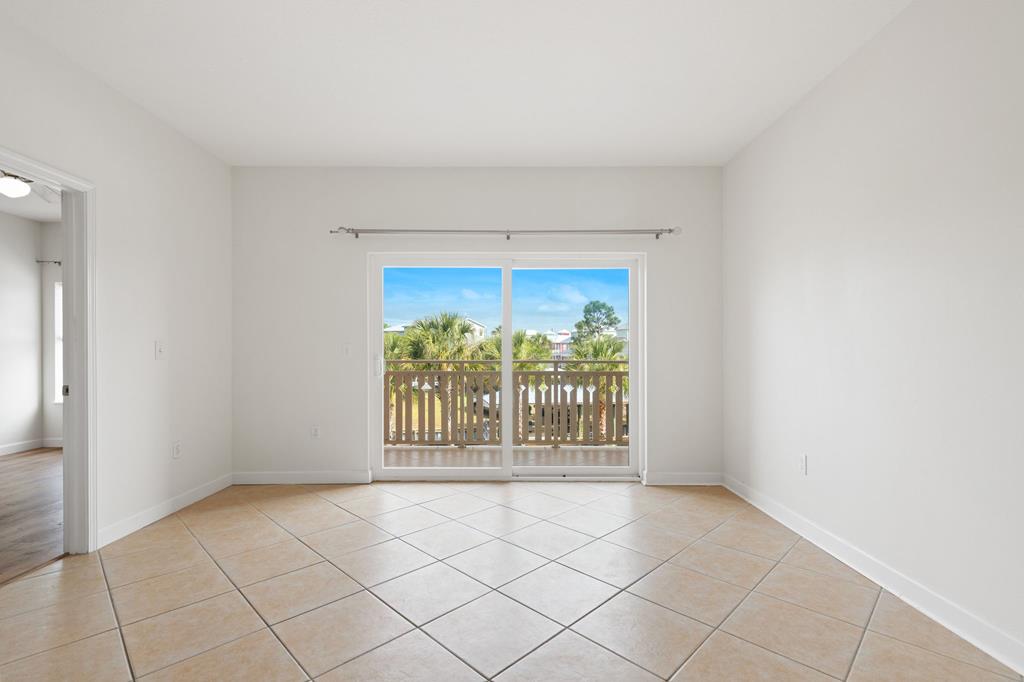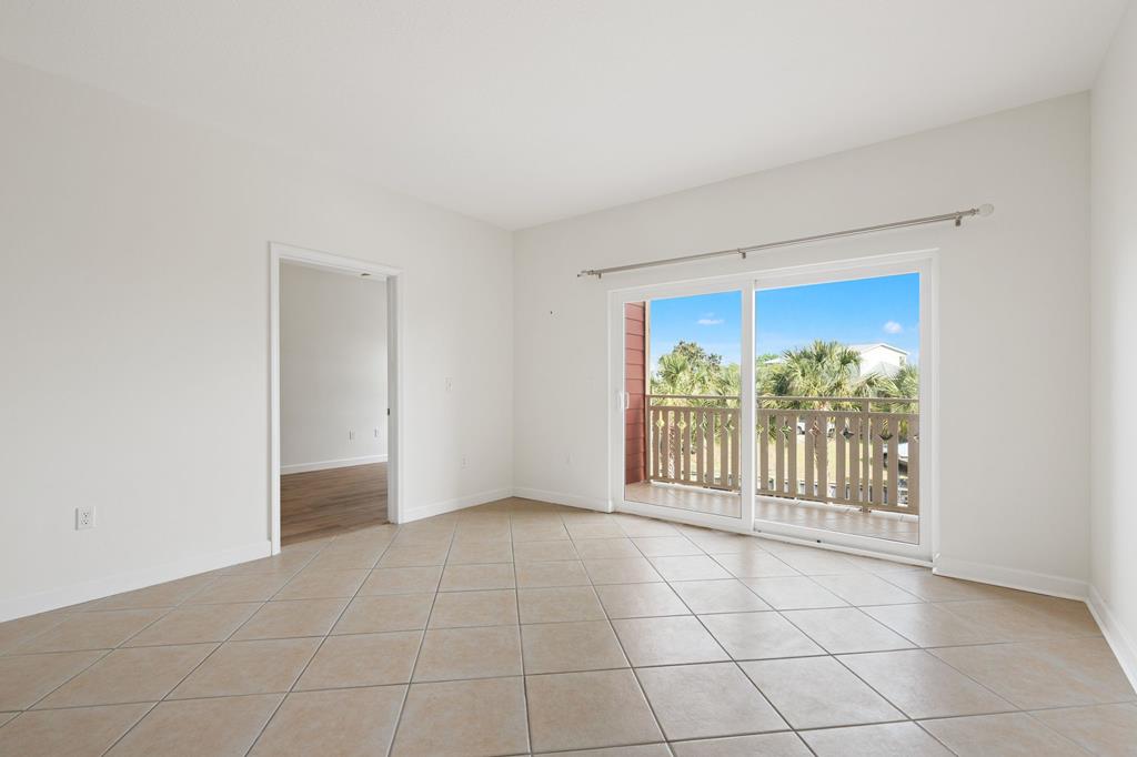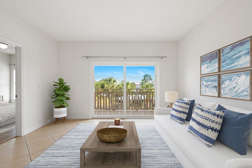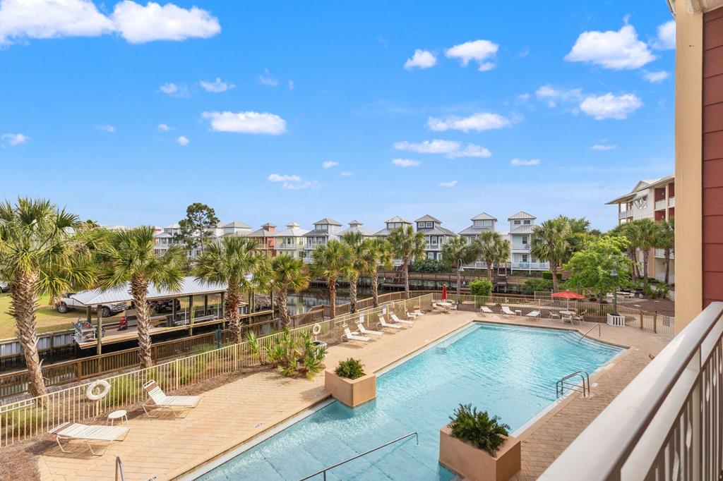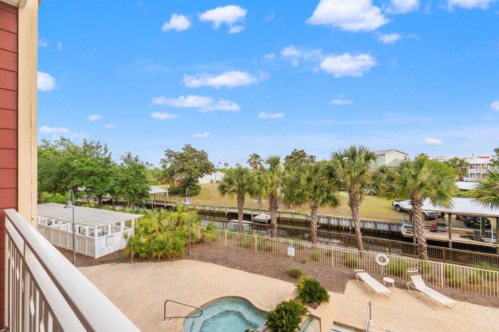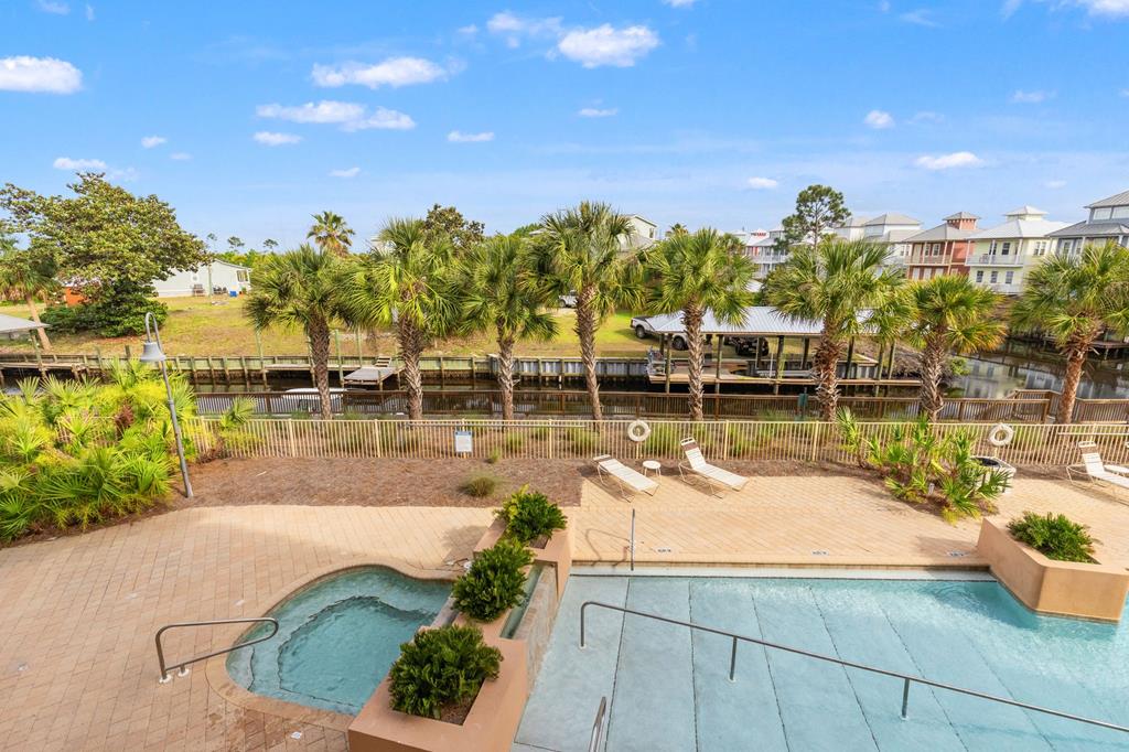 Welcome to Waterside Village-one of Mexico Beach's most desirable communities—where coastal charm meets easy, low-maintenance living. This vacant 2 bedroom, 2 bathroom condo offers a bright, open layout with soaring ceilings, abundant natural light, and a seamless flow from kitchen to living space. The kitchen is well-appointed with granite countertops, solid wood cabinetry, stainless appliances, and a breakfast bar that opens to the main living area—perfect for entertaining or casual coastal living. The space has been virtually staged to showcase its full potential, giving buyers an easy vision for furnishing and design. Step outside to your private covered balcony overlooking the resort-style pool, hot tub, and canal, framed by palm trees and coastal breezes—an ideal spot for morning coffee or evening relaxation. The spacious primary suite features a large closet and en-suite bath with dual vanities, while the second bedroom offers flexibility for guests, a home office, or rental use. Additional highlights include in-unit laundry, durable flooring throughout, and a functional split-bedroom layout. Waterside Village amenities include a beautifully maintained pool, hot tub, grilling area, and easy access to the canal. Located just a short walk or golf cart ride to the beach, dining, and local favorites, this property is perfectly positioned for full-time living, a second home, or a strong rental investment. Don't miss this opportunity to own a slice of the Forgotten Coast with water views and resort-style amenities.