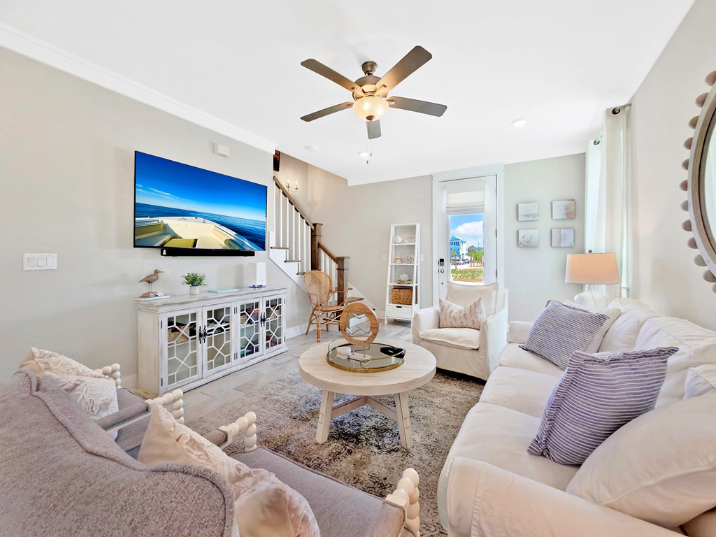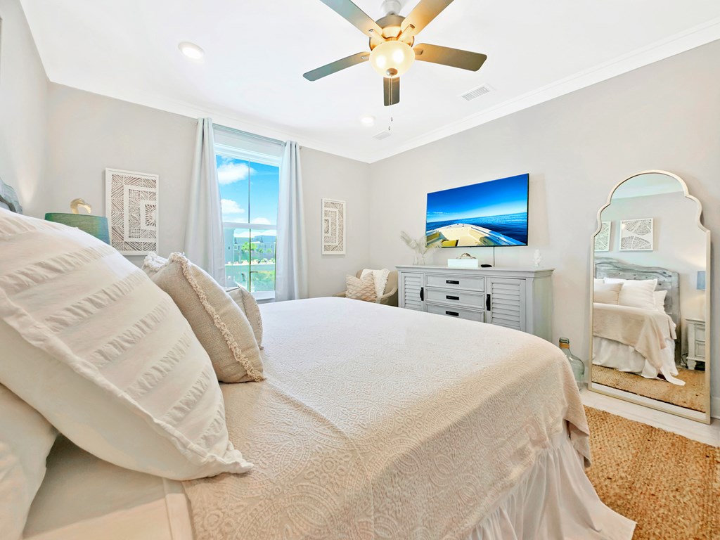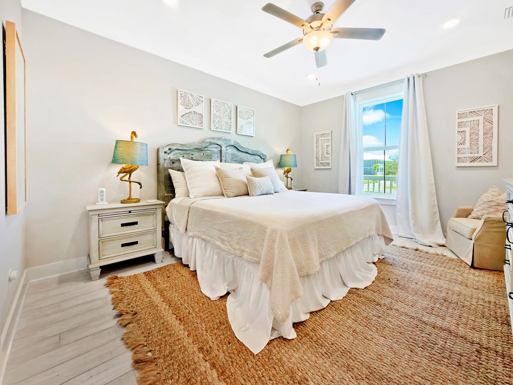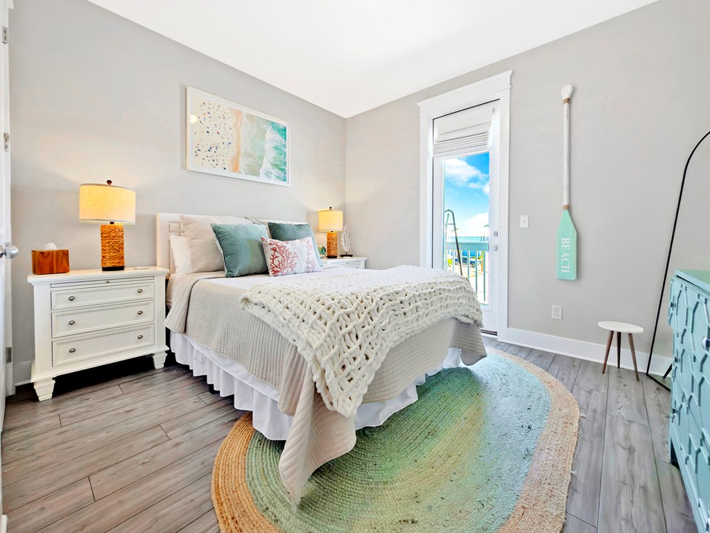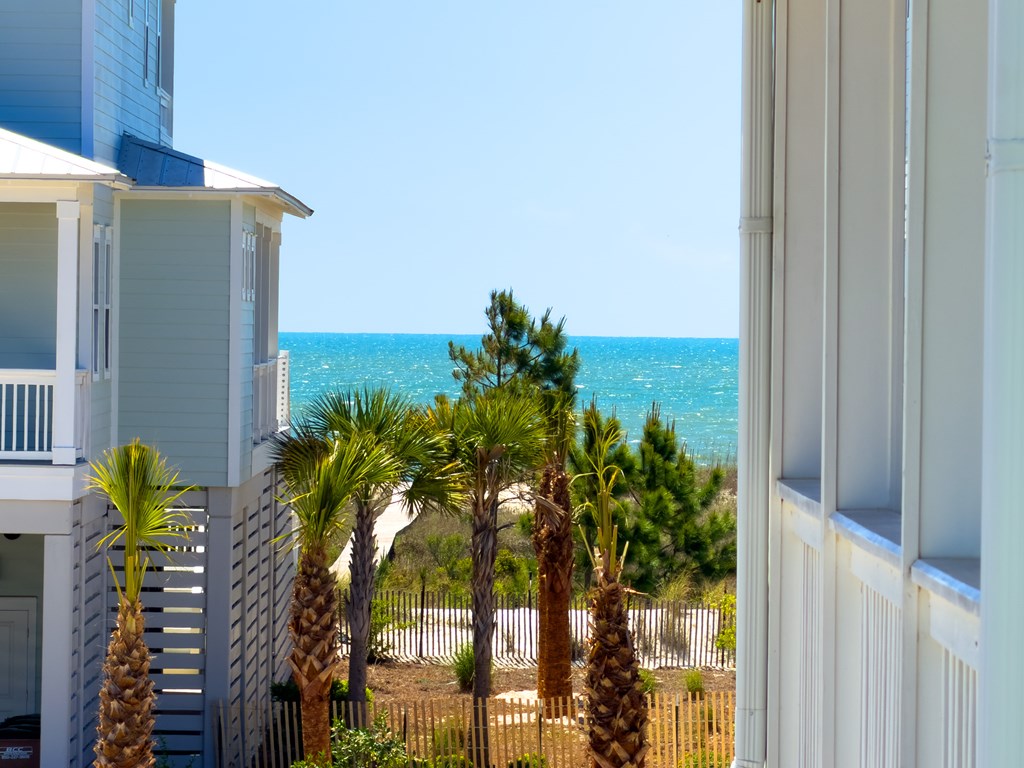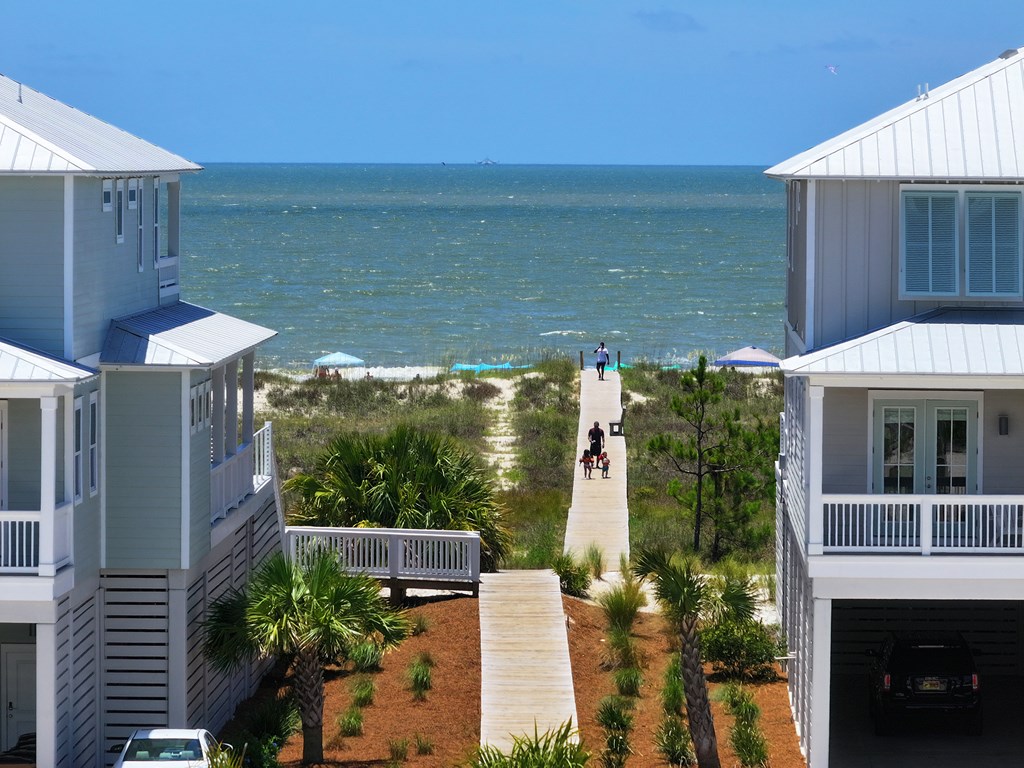 You'll quickly find yourself wanting to call this stunning two-story beach home your own. Welcome to Capecation, nestled in the highly sought-after Villa Del Sol community. The Gulf views from the second-floor covered porch immediately capture your attention, while the home's elegant interior—professionally designed with upscale furnishings and dcor—makes a lasting impression. The main level features a spacious primary suite with a beautifully designed walk-in shower, complete with tile surround and a stone floor. The kitchen is equally impressive, offering stainless steel appliances, quartz countertops, and a large island perfect for gathering. Just beyond the kitchen, you'll find a convenient laundry room and a generous pantry. The first floor also includes a bright, inviting living room, a dining area, and a guest half bath. Upstairs, two additional large bedrooms each feature their own private en suite, providing comfort and privacy for family or guests. Beyond its refined style, Capecation is thoughtfully equipped for beachside living. An outdoor storage enclosure holds beach chairs, toys, and accessories, along with an electric cart to make your short trip to the sand effortless. The property also includes a Tesla car charger for added convenience. As part of the Villa Del Sol community, you'll enjoy access to amenities such as a pool, pickleball courts, and direct beach access—everything you need for the perfect coastal retreat. Call and schedule your showing today.