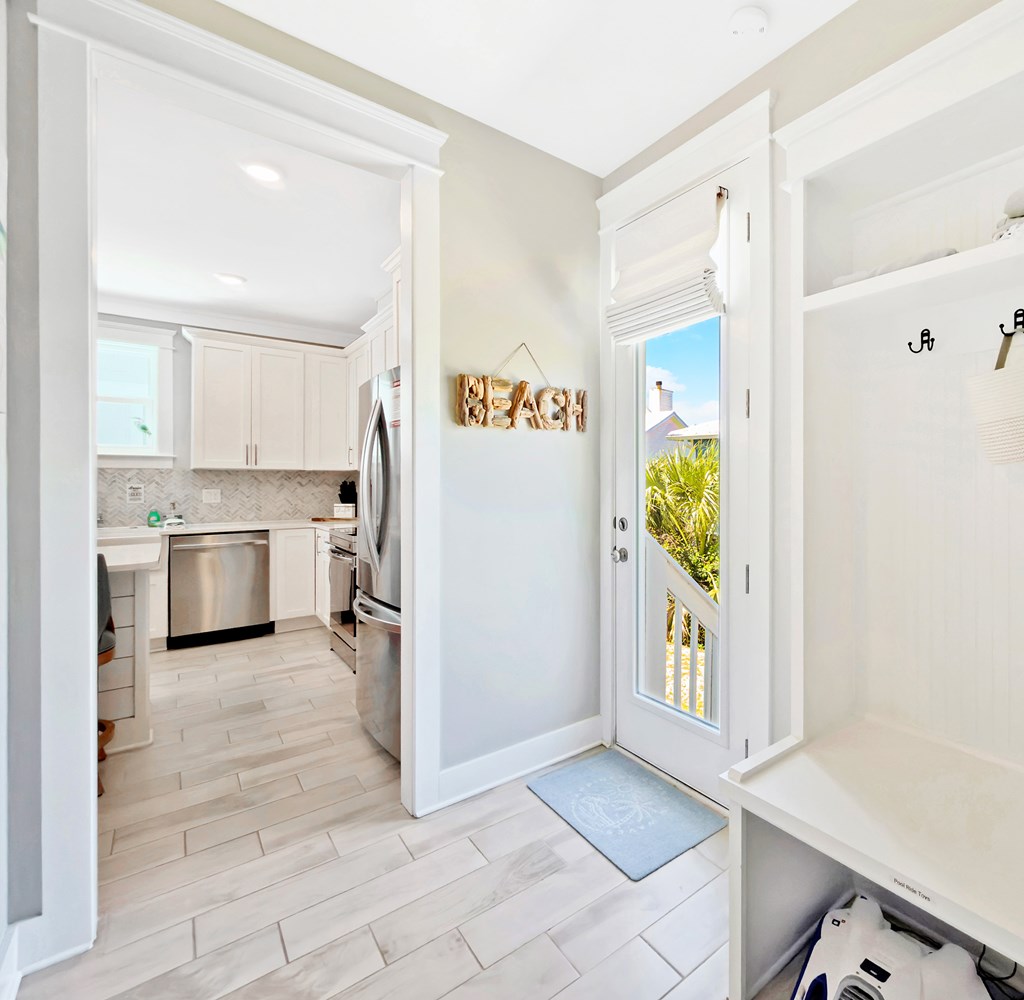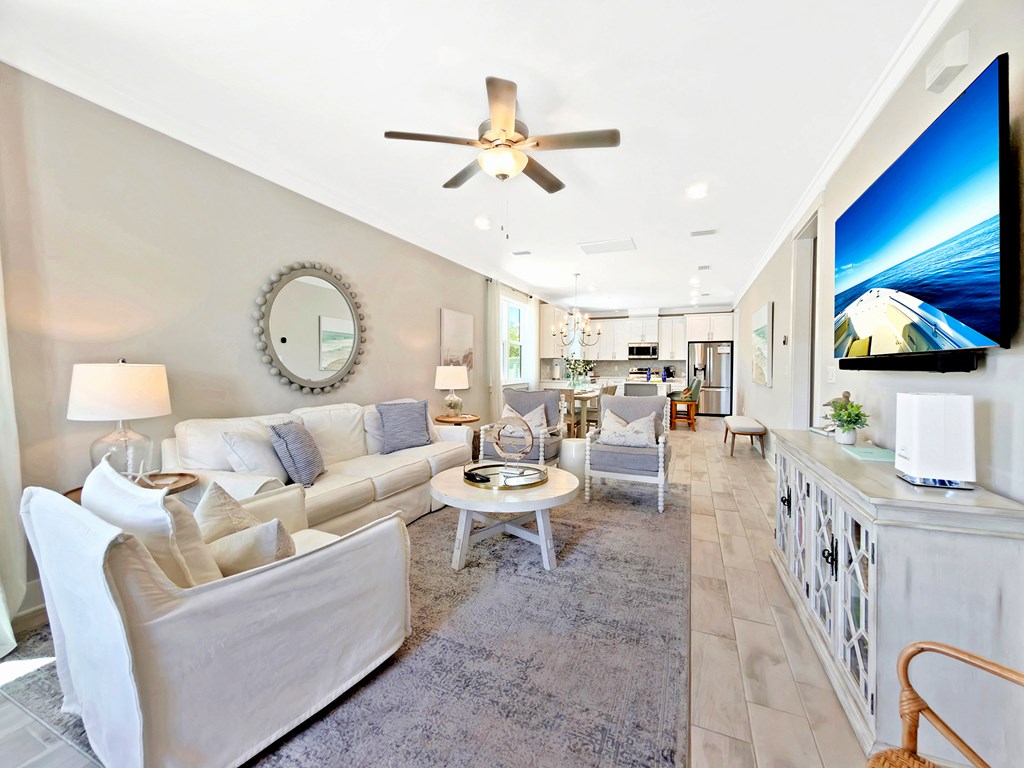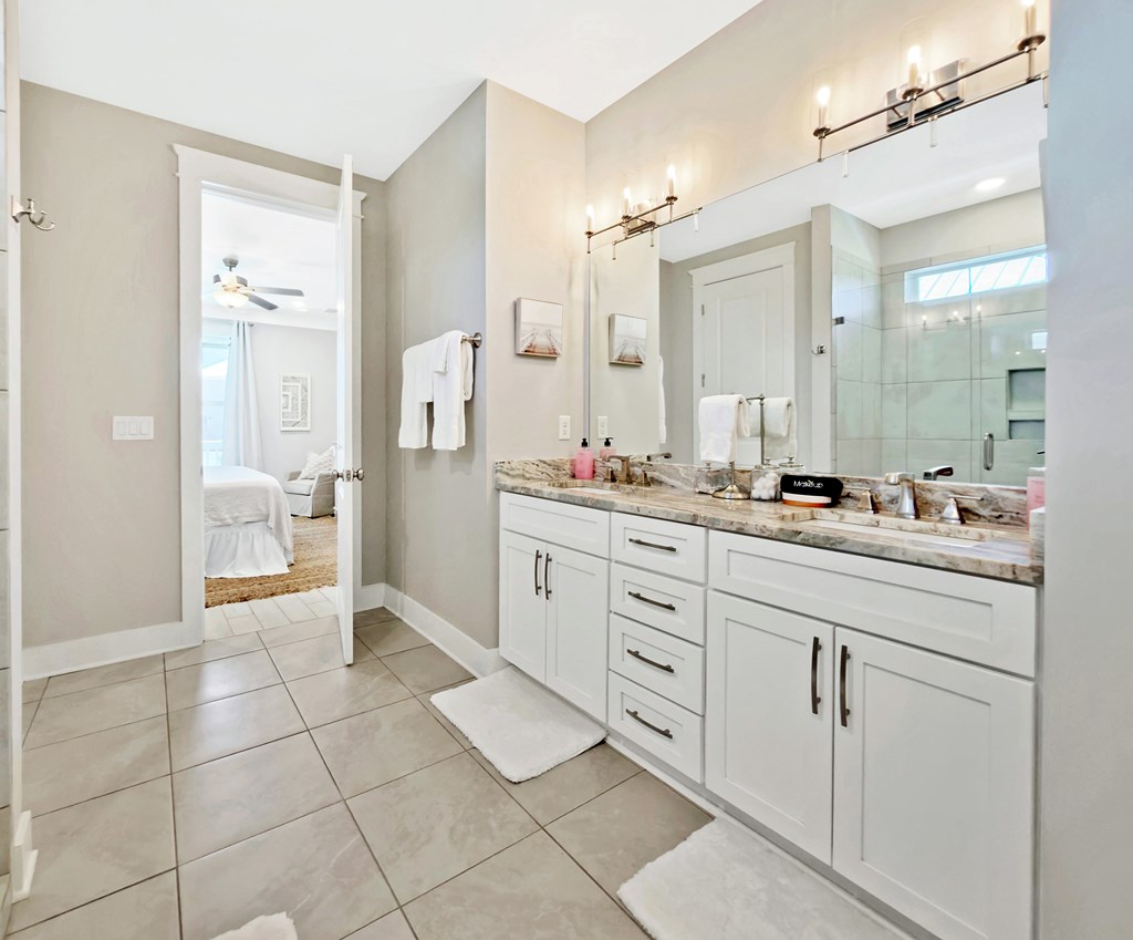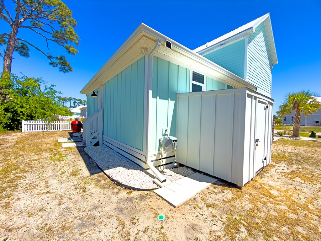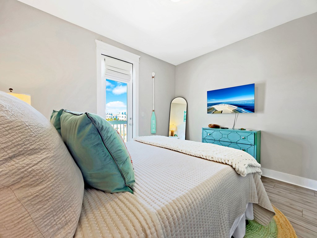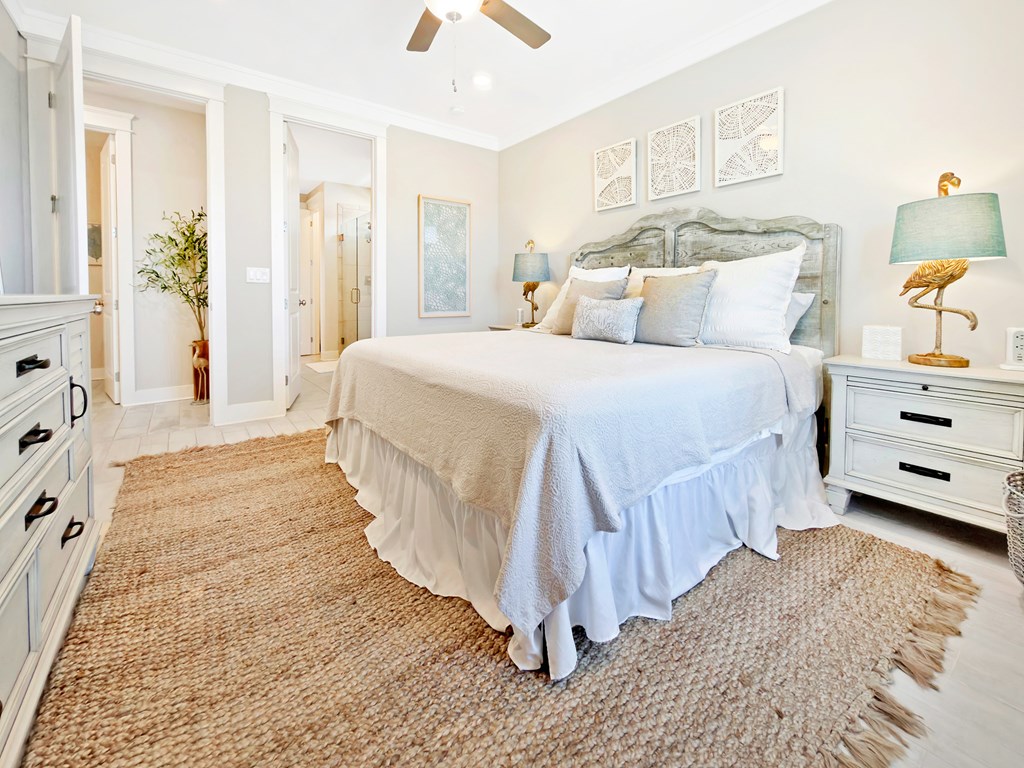 You'll quickly find yourself wanting to call this stunning two-story beach home your own. Welcome to Capecation, nestled in the highly sought-after Villa Del Sol community. The Gulf views from the second-floor covered porch immediately capture your attention, while the home's elegant interior—professionally designed with upscale furnishings and dcor—makes a lasting impression. The main level features a spacious primary suite with a beautifully designed walk-in shower, complete with tile surround and a stone floor. The kitchen is equally impressive, offering stainless steel appliances, quartz countertops, and a large island perfect for gathering. Just beyond the kitchen, you'll find a convenient laundry room and a generous pantry. The first floor also includes a bright, inviting living room, a dining area, and a guest half bath. Upstairs, two additional large bedrooms each feature their own private en suite, providing comfort and privacy for family or guests. Beyond its refined style, Capecation is thoughtfully equipped for beachside living. An outdoor storage enclosure holds beach chairs, toys, and accessories, along with an electric cart to make your short trip to the sand effortless. The property also includes a Tesla car charger for added convenience. As part of the Villa Del Sol community, you'll enjoy access to amenities such as a pool, pickleball courts, and direct beach access—everything you need for the perfect coastal retreat. Call and schedule your showing today.