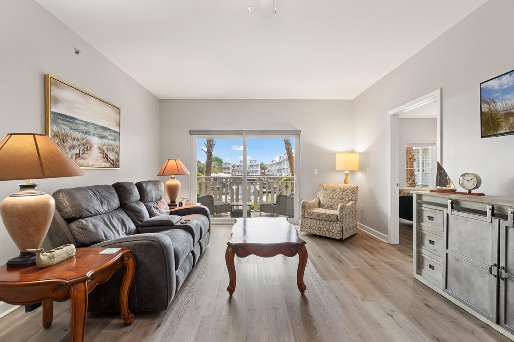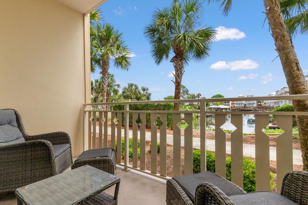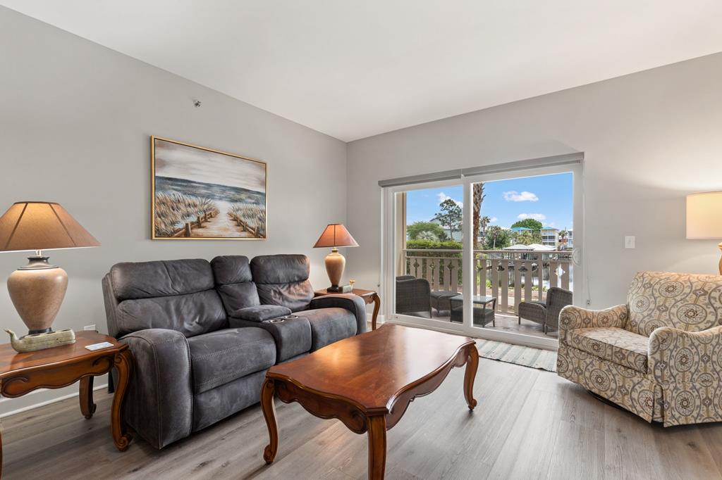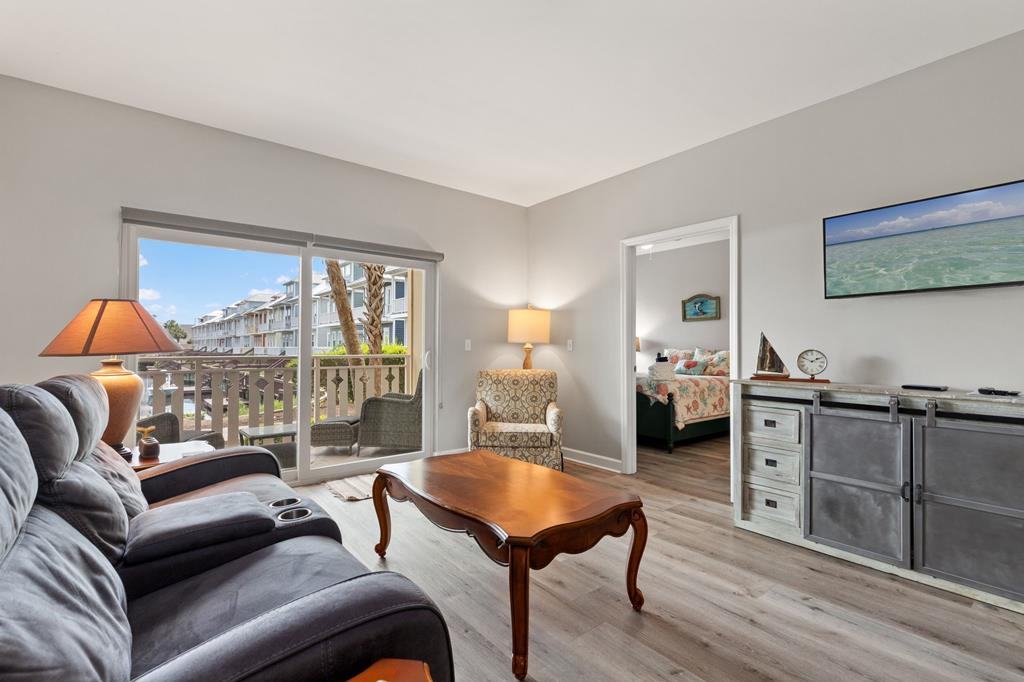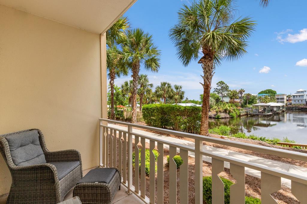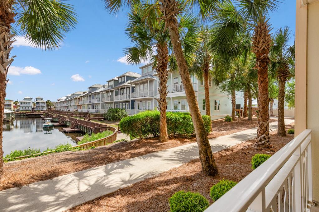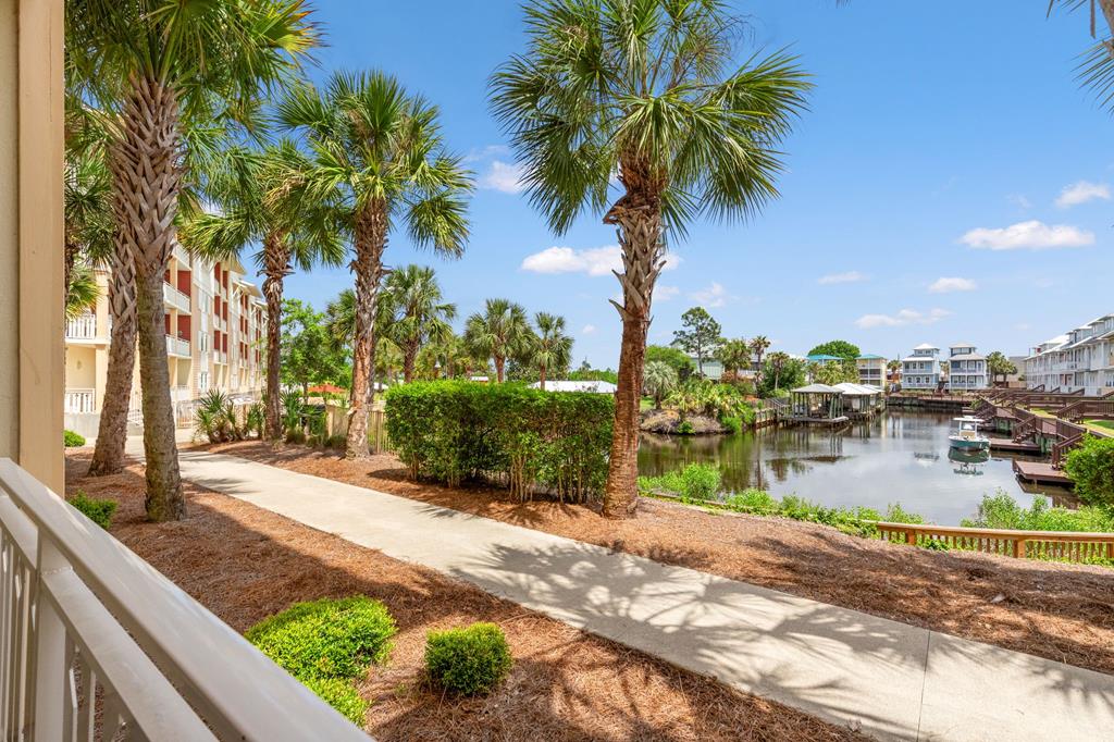 Welcome to coastal living at its finest in Waterside Village! This beautifully maintained 2 bedroom, 2 bathroom first-floor condo—no waiting on an elevator—offers the perfect blend of comfort, convenience, and waterfront lifestyle. Step inside to an open-concept layout featuring a bright kitchen with ample cabinetry, breakfast bar, and seamless flow into the spacious living and dining areas—ideal for entertaining or relaxing after a day on the water. Enjoy easy ground-level access and take in peaceful canal views from your private covered patio. Perfectly positioned just steps from the water, this unit is surrounded by palm-lined walkways and coastal charm. The primary suite offers a private bath and generous space, while the guest bedroom is well-appointed for family or visitors. Additional features include in-unit laundry and tasteful finishes that make this property move-in or rental ready. Waterside Village amenities include a community pool, hot tub, and day docks along the canal—perfect for boating, fishing, or simply enjoying the waterfront lifestyle. Located in the heart of Mexico Beach, you're just a short walk or golf cart ride to the beach, dining, and local attractions. Whether you're looking for a full-time residence, vacation getaway, or investment opportunity, this condo checks all the boxes.