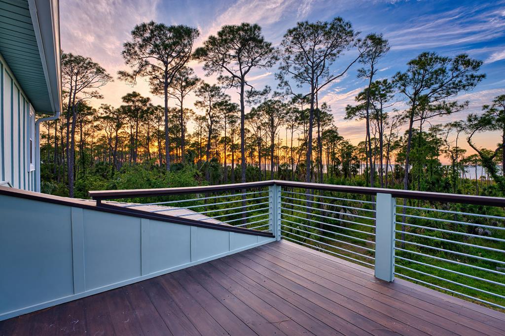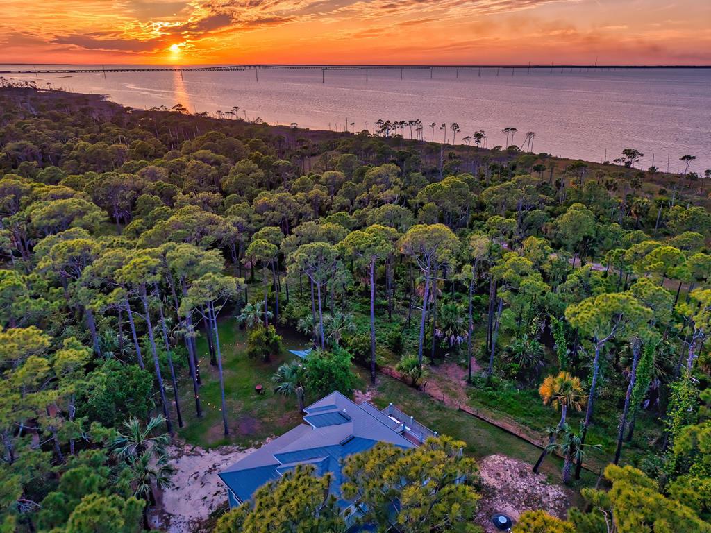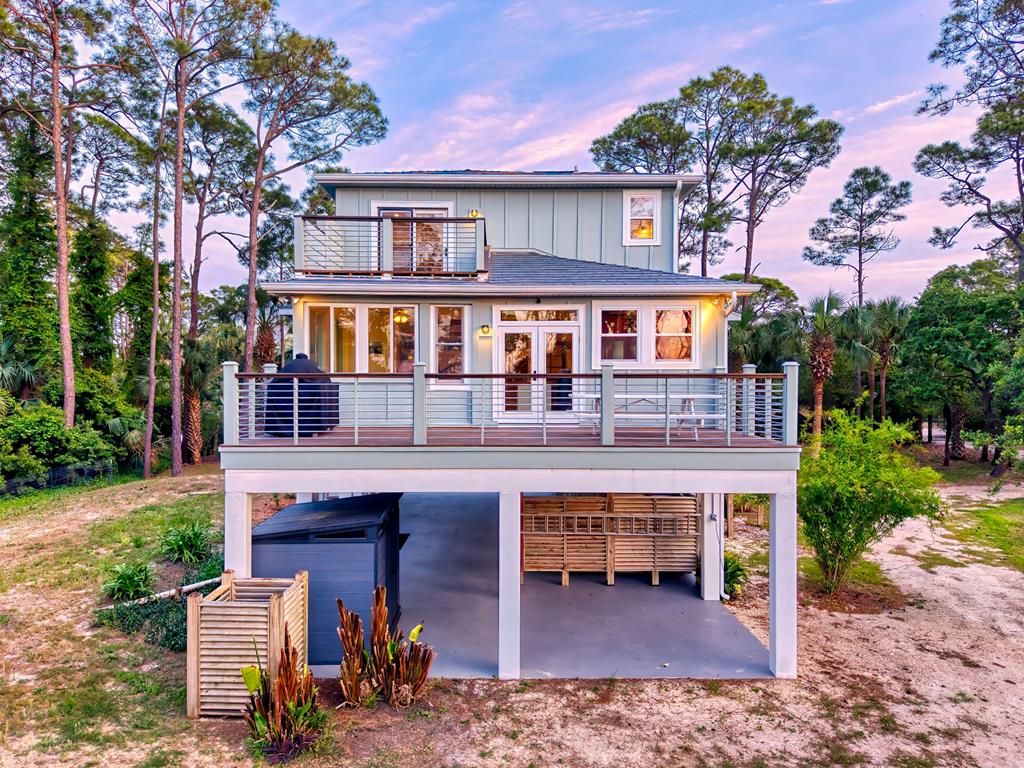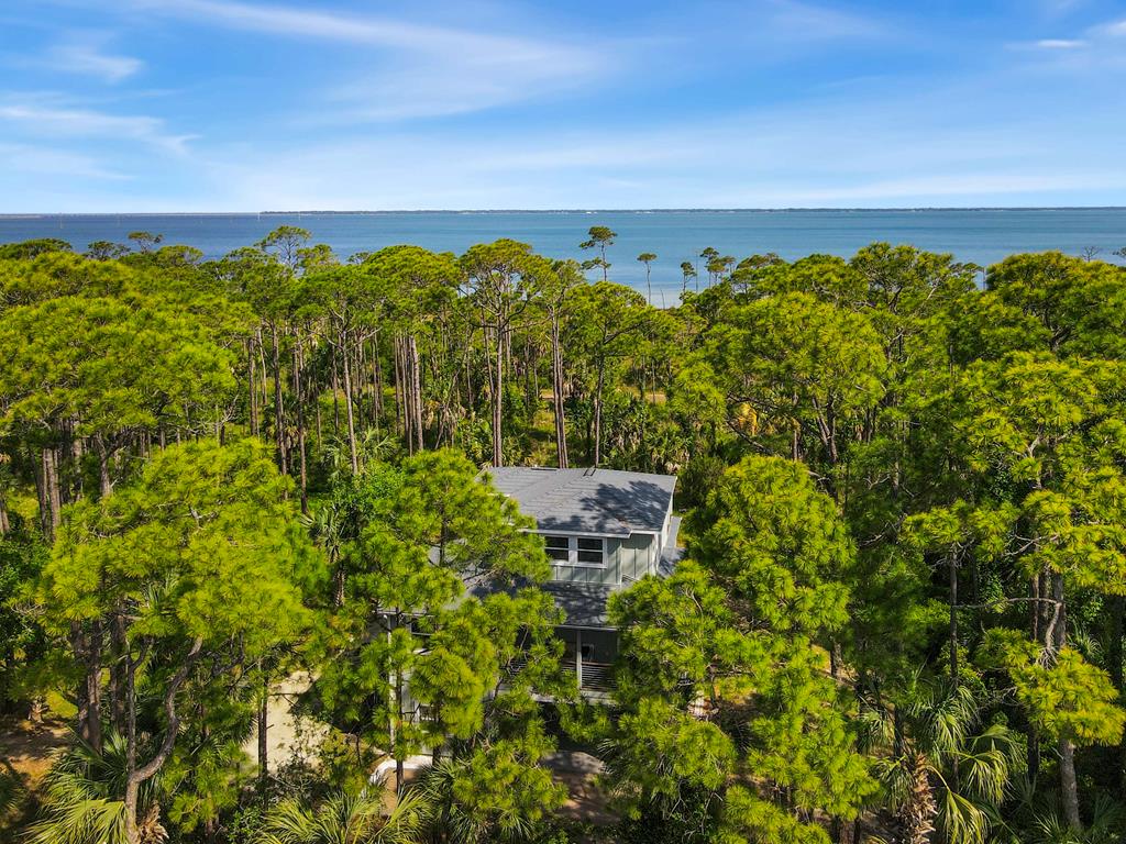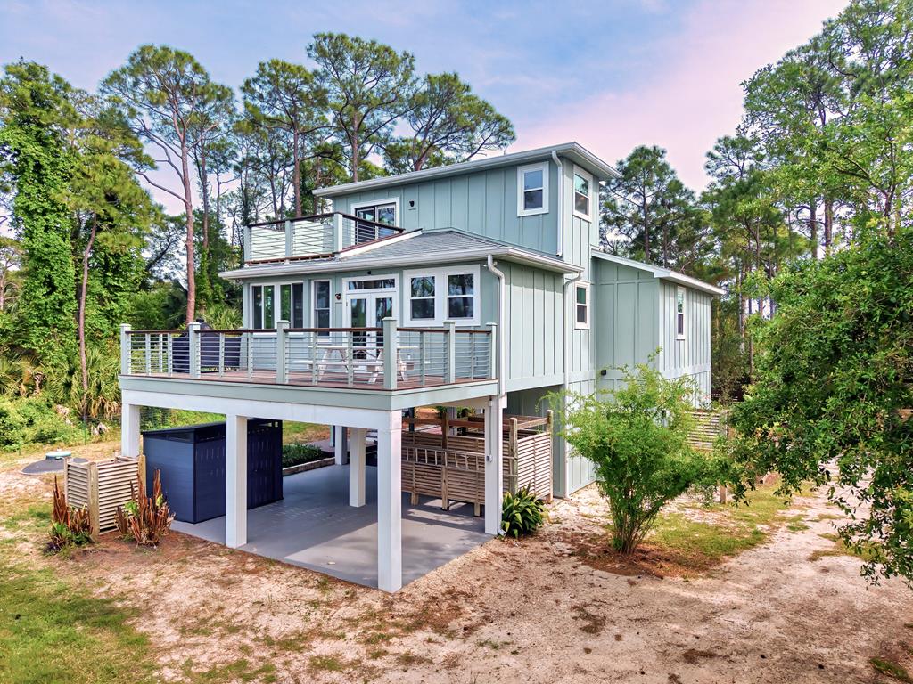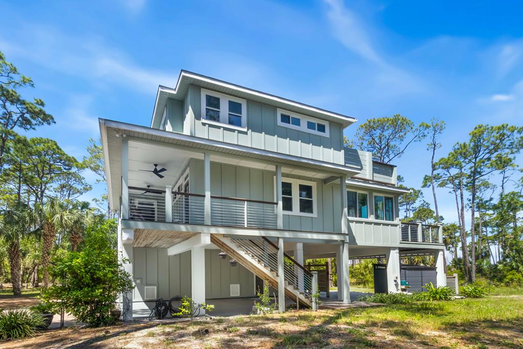 Stunning panoramic bay views from this jewel box custom home on St. George Island. This 2BR/2BA home looks out over protected state-owned land, so your view stays wide open—sunsets included—and access to the bay or beach is an easy stroll from your front door. Inside and out, there are many updates fit for modern living. Hardwood oak floors run throughout, and the layout is simple, bright, and easy to maintain whether you're here full time or using it as a second home. Both bedrooms offer privacy with loads of natural light, while the top-floor primary suite opens to its own deck—ideal for enjoying bay breezes with your morning coffee or winding down at the end of the day. Substantial updates have been recently completed: Hardie siding, impact-rated doors and windows, HVAC, hot water heater, gutters, new bathrooms, kitchen appliances and fresh paint inside and out. Two new rear decks—one on the main level and one off the primary suite—expand your outdoor living space without the upkeep, adding meaningful value and peace of mind. The property includes the adjacent lot, bringing the total to approximately .66 acres. The fenced yard with dual gates allows for easy drive-through access, with plenty of room for boat parking, gear storage, or future plans to build a neighboring house and create a family compound. Native landscaping and citrus trees keep maintenance low while attracting local wildlife—eagles, osprey, owls, peregrine falcons, red shouldered hawks, egrets, herons are regular visitors. Additional features include a ground-level storage room, outdoor shower, and outdoor shed. Having had only 2 owners and never used as a rental, this home has been carefully maintained as a full-time residence, however rentals are allowed. Being just 2.5 blocks to the Gulf beach and five blocks to favorite island restaurants and shops, this is an immaculate, updated coastal property with room to grow and views that will make you never want to leave!
