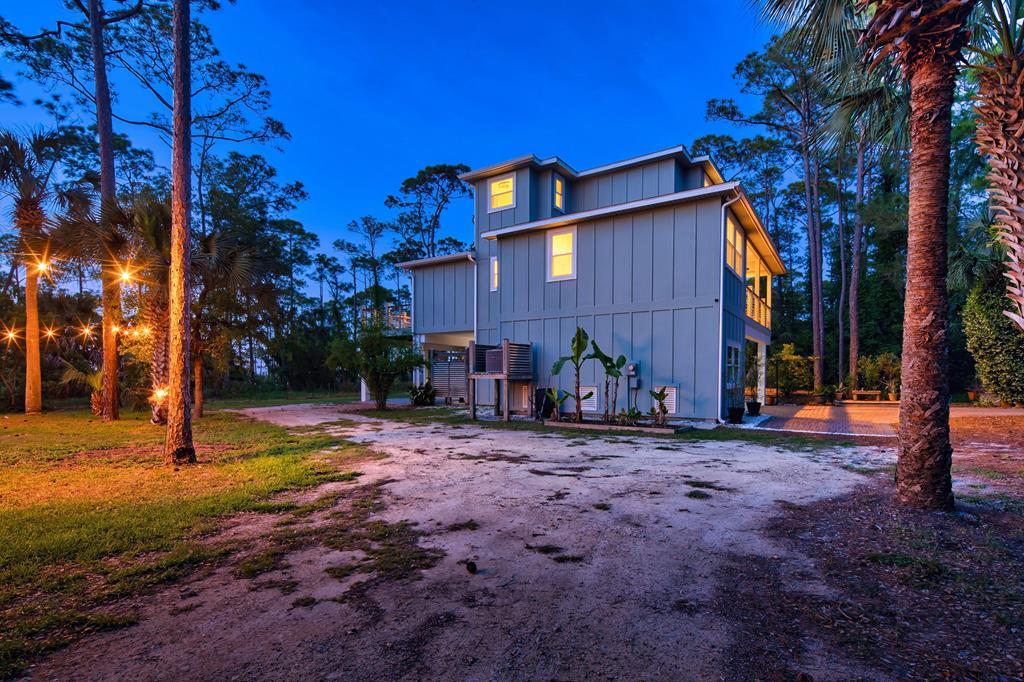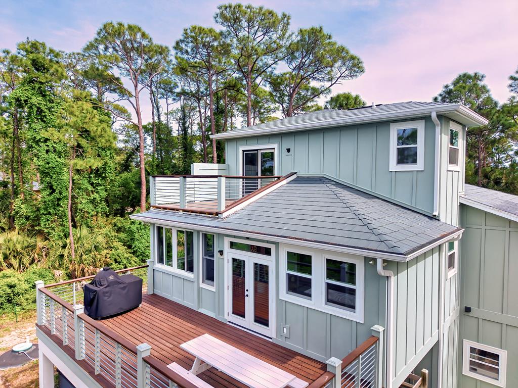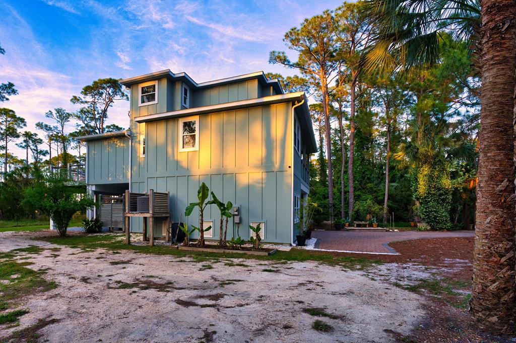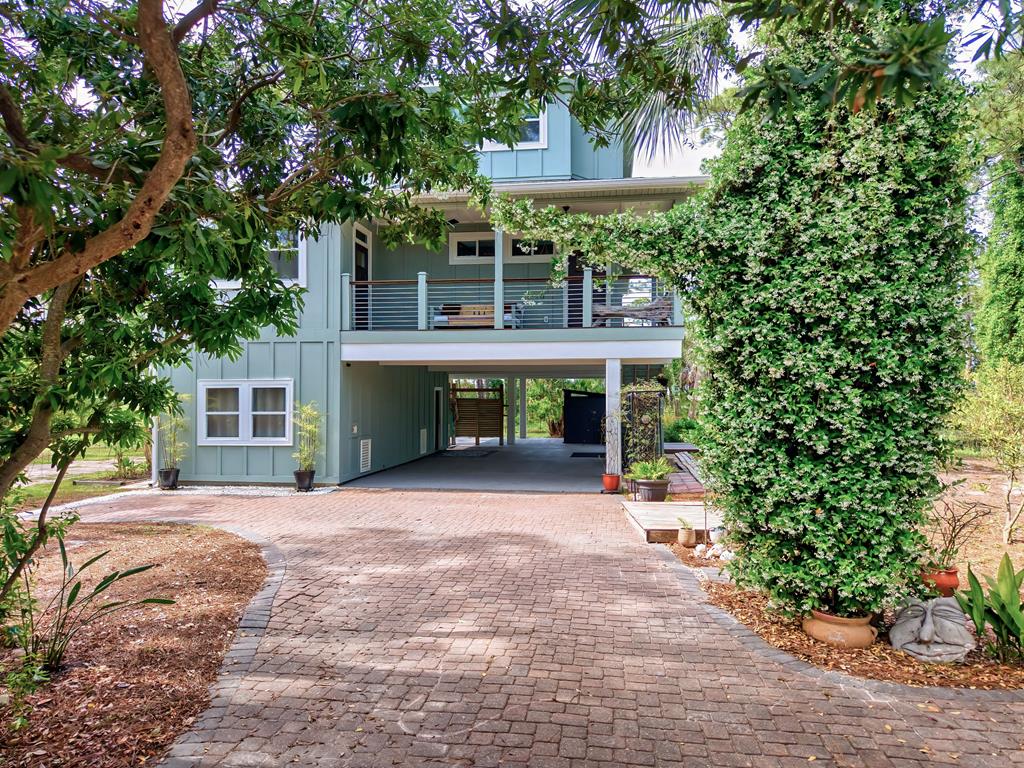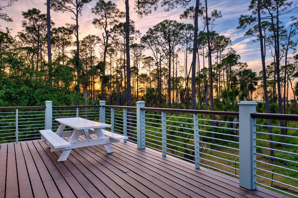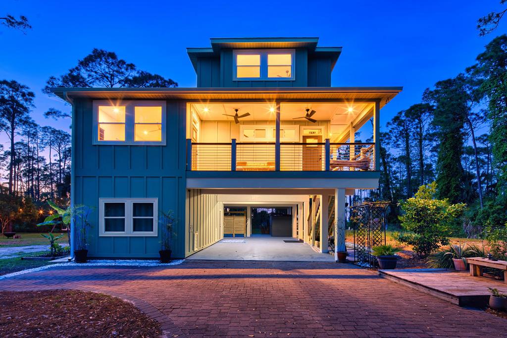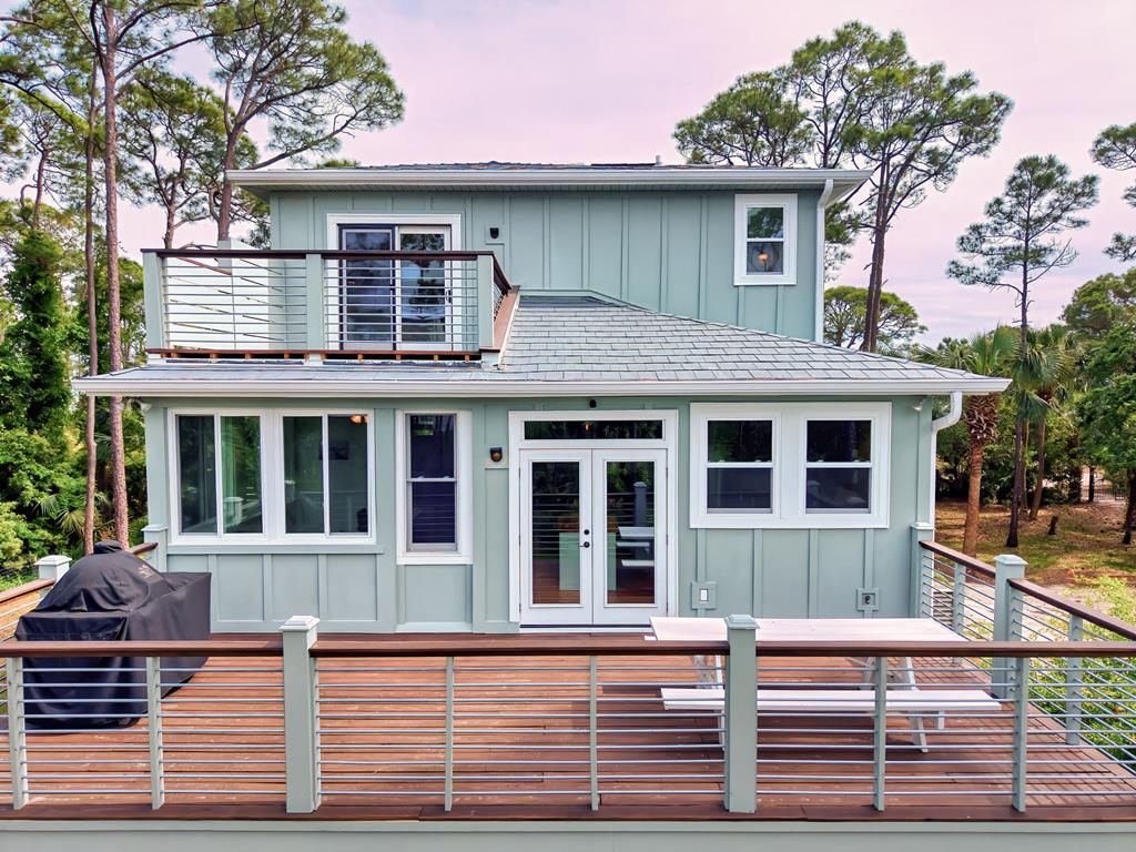 Stunning panoramic bay views from this jewel box custom home on St. George Island. This 2BR/2BA home looks out over protected state-owned land, so your view stays wide open—sunsets included—and access to the bay or beach is an easy stroll from your front door. Inside and out, there are many updates fit for modern living. Hardwood oak floors run throughout, and the layout is simple, bright, and easy to maintain whether you're here full time or using it as a second home. Both bedrooms offer privacy with loads of natural light, while the top-floor primary suite opens to its own deck—ideal for enjoying bay breezes with your morning coffee or winding down at the end of the day. Substantial updates have been recently completed: Hardie siding, impact-rated doors and windows, HVAC, hot water heater, gutters, new bathrooms, kitchen appliances and fresh paint inside and out. Two new rear decks—one on the main level and one off the primary suite—expand your outdoor living space without the upkeep, adding meaningful value and peace of mind. The property includes the adjacent lot, bringing the total to approximately .66 acres. The fenced yard with dual gates allows for easy drive-through access, with plenty of room for boat parking, gear storage, or future plans to build a neighboring house and create a family compound. Native landscaping and citrus trees keep maintenance low while attracting local wildlife—eagles, osprey, owls, peregrine falcons, red shouldered hawks, egrets, herons are regular visitors. Additional features include a ground-level storage room, outdoor shower, and outdoor shed. Having had only 2 owners and never used as a rental, this home has been carefully maintained as a full-time residence, however rentals are allowed. Being just 2.5 blocks to the Gulf beach and five blocks to favorite island restaurants and shops, this is an immaculate, updated coastal property with room to grow and views that will make you never want to leave!