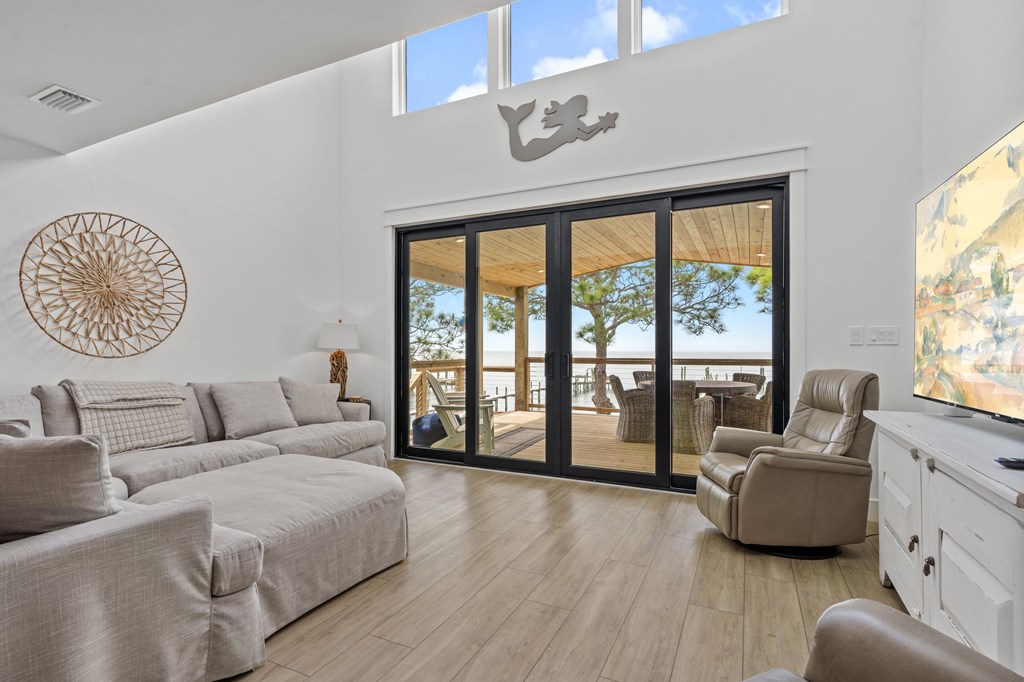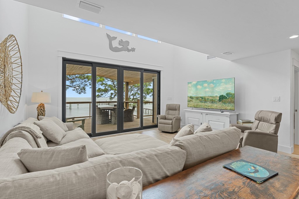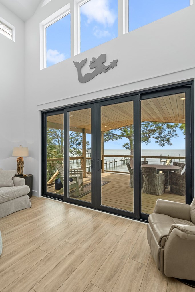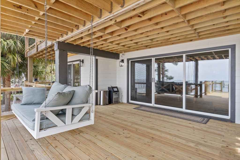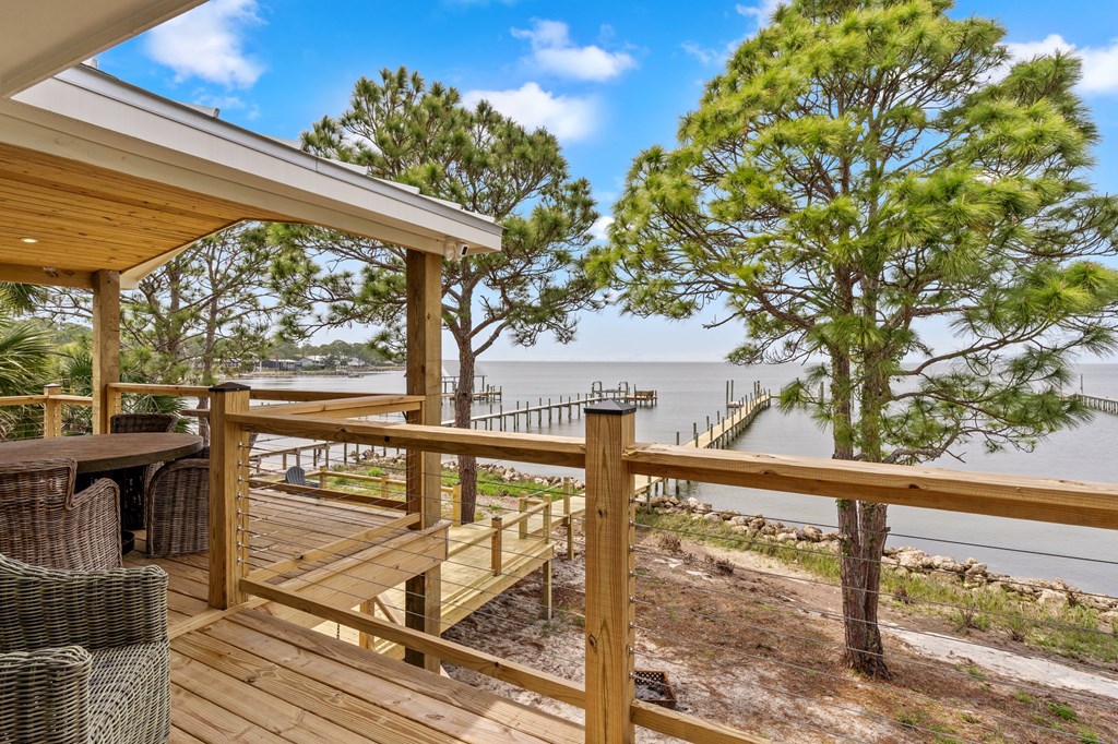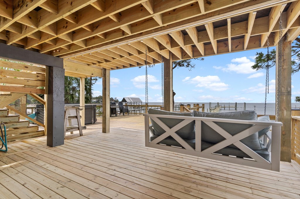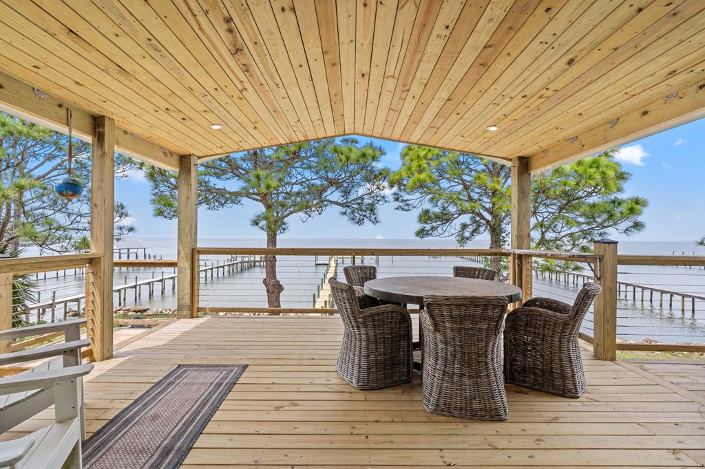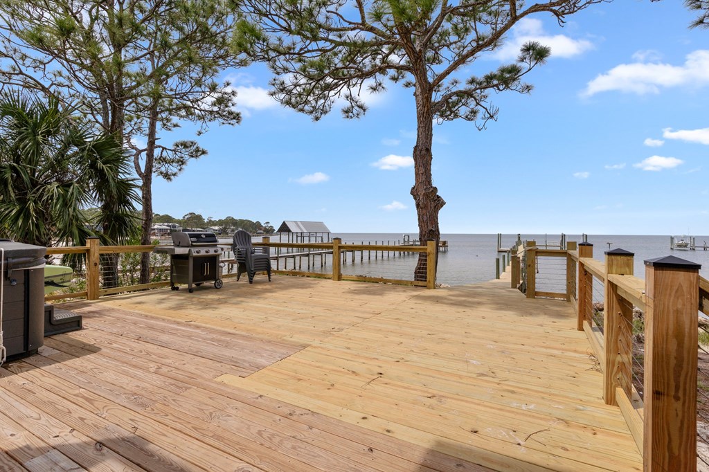 Completely renovated in 2024. New Hardie board siding, new custom cabinets, new lighting, Quartz countertops, new plank flooring, new sinks, doors, windows, faucets, 17x16 covered porch added, exterior stairs added, huge deck, new dock and boat lift, new sheetrock and paint, 3 new HVACs, new ductwork and 2 dehumidifiers, hottub. Wonderful floorplan set up for multiple families, Bedroom, kitchenette, and family room on first floor, main kitchen, primary bedroom on the second floor, two bedrooms, and loft on the third floor. Amazing view on the bay, deep water dock, perfect for entertaining! See associated docs for complete list and specs. Sq footage approximate Buyer to verify all info.