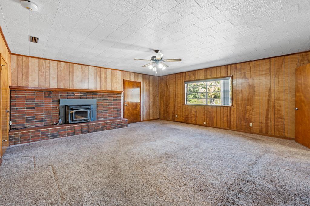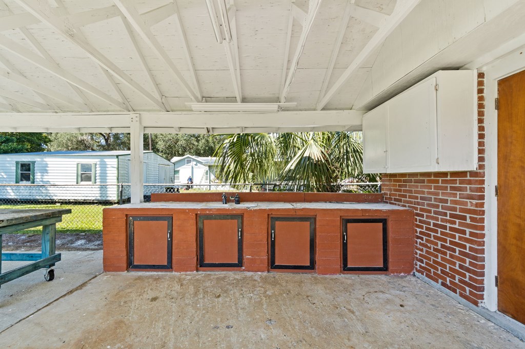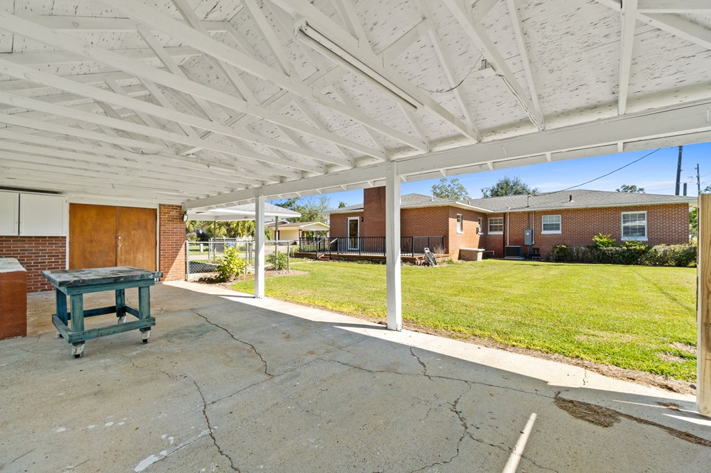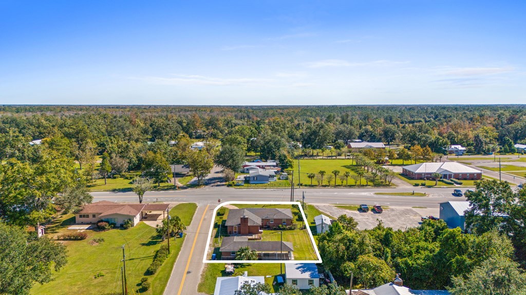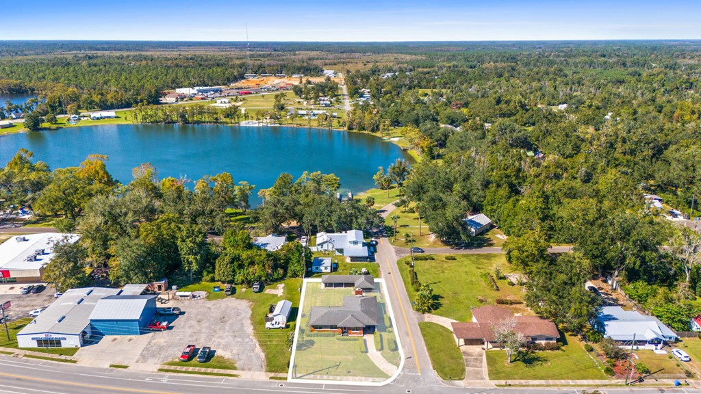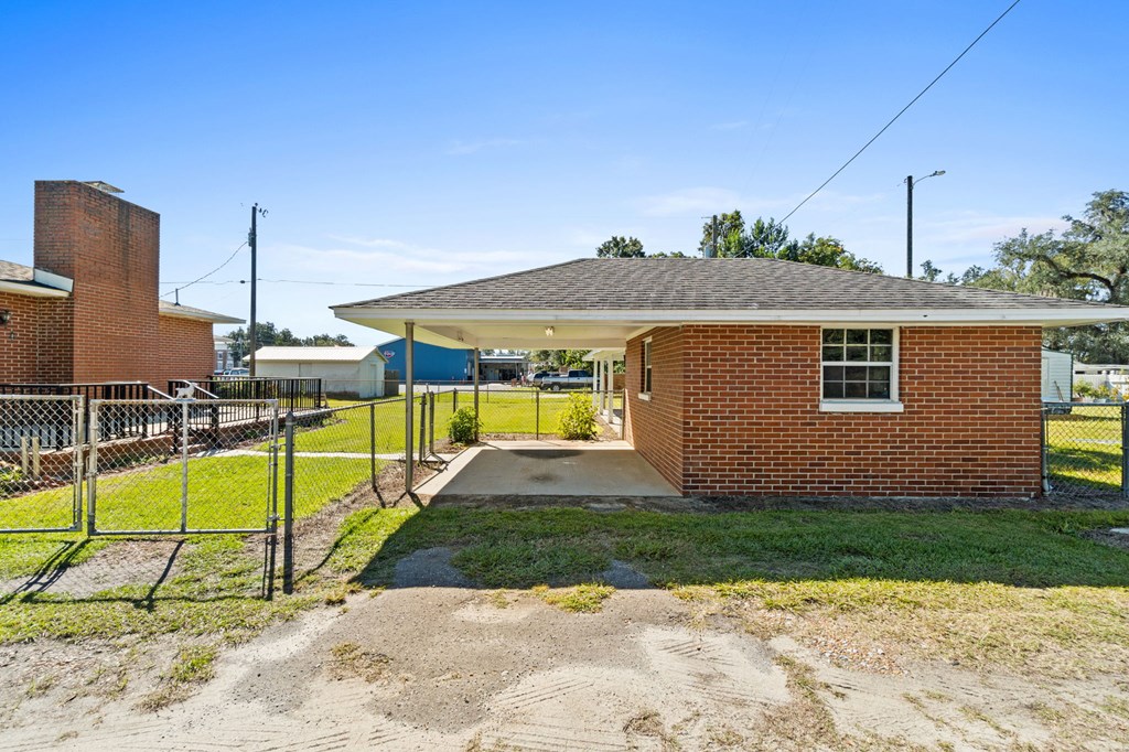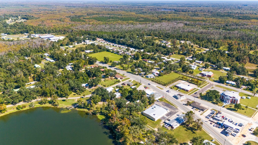 Welcome home to this single owner 3 bedroom, 2 bath brick residence in the heart of downtown Wewahitchka, offering tranquil views of Lake Alice. Comfortably set on just over a quarter of an acre, this solidly constructed home features concrete block walls and timeless details throughout. Classic oak hardwood floors (under carpet) and tongue-and-groove walls lend warmth and character to much of the interior, creating a welcoming sense of nostalgia. The kitchen offers ample workspace and connects seamlessly to the laundry area, which provides a large pantry space and additional storage. An expansive living room addition serves as the perfect gathering spot, featuring a cozy wood-burning fireplace and direct access to the open patio, ideal for relaxing or entertaining. A versatile office or hobby room extends the home's functionality, allowing room for creative pursuits or remote work. Outdoors, the chain-link fenced backyard offers plenty of space for pets or gardening, complemented by an additional carport, workshop, and outdoor kitchen setup. From its enduring craftsmanship to its convenient downtown location, this home captures the charm of small-town living with room to make it your own.