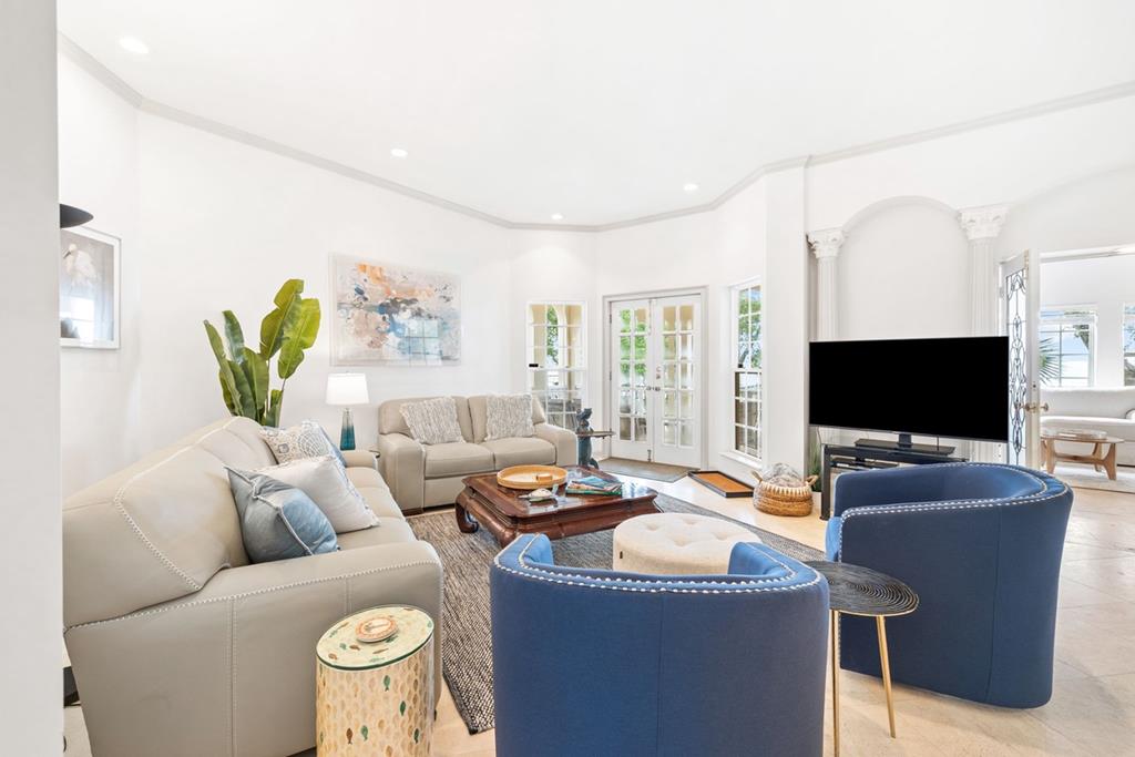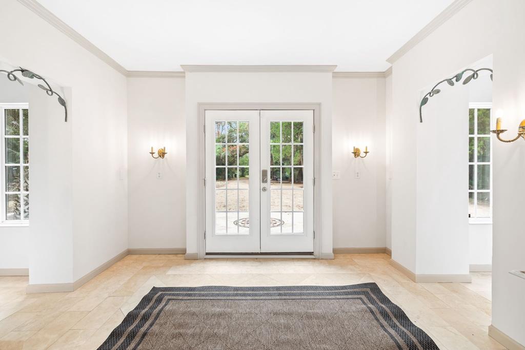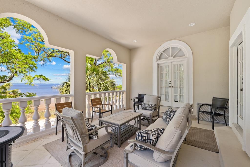 "Maison Rose" Exquisite Bayfront French Chateau nestled in enchanting tropical surroundings in St. George Plantation. 100' Private Beach frontage with Boat Dock on Apalachicola Bay and the Inter-Coastal Waterway. This extraordinary home features ornate carvings, elegant balconies, and tall arched windows. Enter Maison Rose through a spacious foyer adorned by a curved staircase with artisanal metal railing. The first floor features a gracious living area with French doors leading to a waterfront veranda offering breathtaking sunset views. A stately study with custom bookcases and cabinetry complements the living space or can privately extend the Master BR suite. The well-appointed Chef's kitchen is a culinary dream with a Wolf gas range, generous counter and cabinetry space, and Butler's Pantry. Choose to dine in the elegant open dining room or casual Bayfront breakfast room.The top floor entertainment room offers a kitchenette, Billiards, game tables, TV space and reading nooks. Sleeping accommodations on the 2nd floor include 2 BRs, 2 BAs, and bunk room. A ground level Guest Suite opens to a serene waterfront terrace complete with stylish seating areas, al fresco dining, hot tub, fire pit and outdoor shower. Air-conditioned 3-car garage/recreation space offers motorized doors. Enjoy easy access to Gulf of Mexico beaches, miles of coastal bike paths, pickleball and tennis, 2 community pools, Clubhouse with fitness center and a 3300' runway. HOA New Buyer Fee of .05%. Call for your private showing of this remarkable turnkey estate!