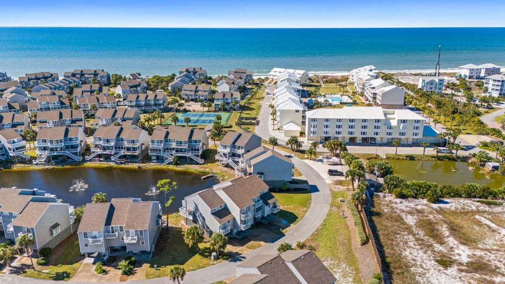 Beautifully maintained 2BR/2BA townhome located within the gated coastal community of Barrier Dunes on Cape San Blas. This inviting property offers serene pond views and is just steps from the neighborhood's smaller pool. Both exterior decks have been recently updated for years of enjoyment. Strong rental history and the option to convey furnished make this an excellent turnkey opportunity. The main level features an open and bright living/dining area with a charming bay window and access to the updated outdoor deckâperfect for relaxing or entertaining. The kitchen includes a breakfast bar with seating for three. A guest bedroom with private balcony and a full bath complete this level. Upstairs, the spacious primary suite offers vaulted ceilings, a second private deck overlooking the pond, walk-in closet, double vanity, garden tub, and separate shower. A full-size washer and dryer are conveniently located on this floor. Barrier Dunes provides exceptional community amenities including gated entry, two swimming pools, tennis/pickleball courts, playground and several stocked fishing pond. Enjoy easy access to the renowned white-sand beaches with three community access points. Whether you're seeking a full-time residence, vacation retreat, or rental investment, this townhome offers comfort, convenience, and coastal charm.
