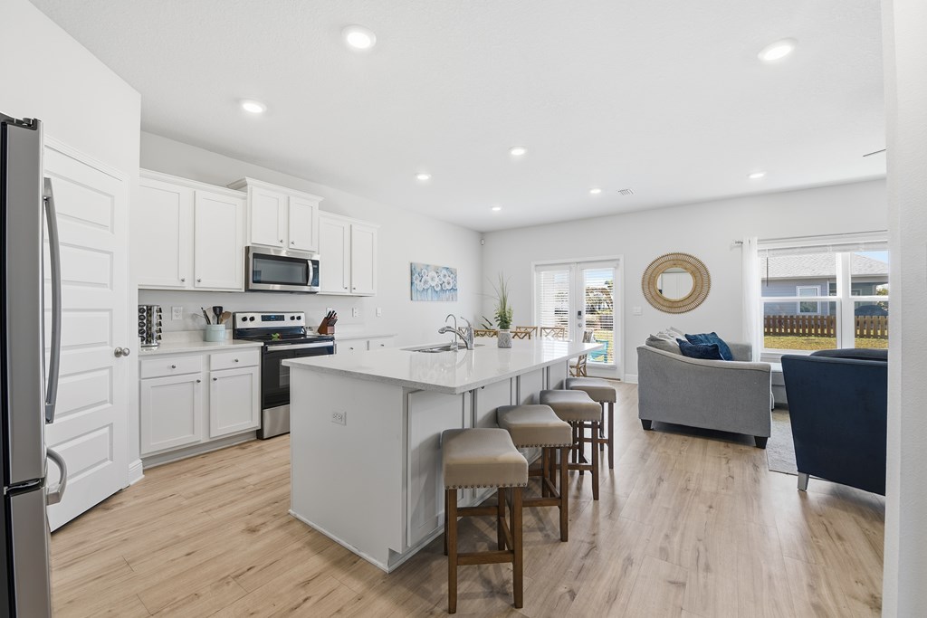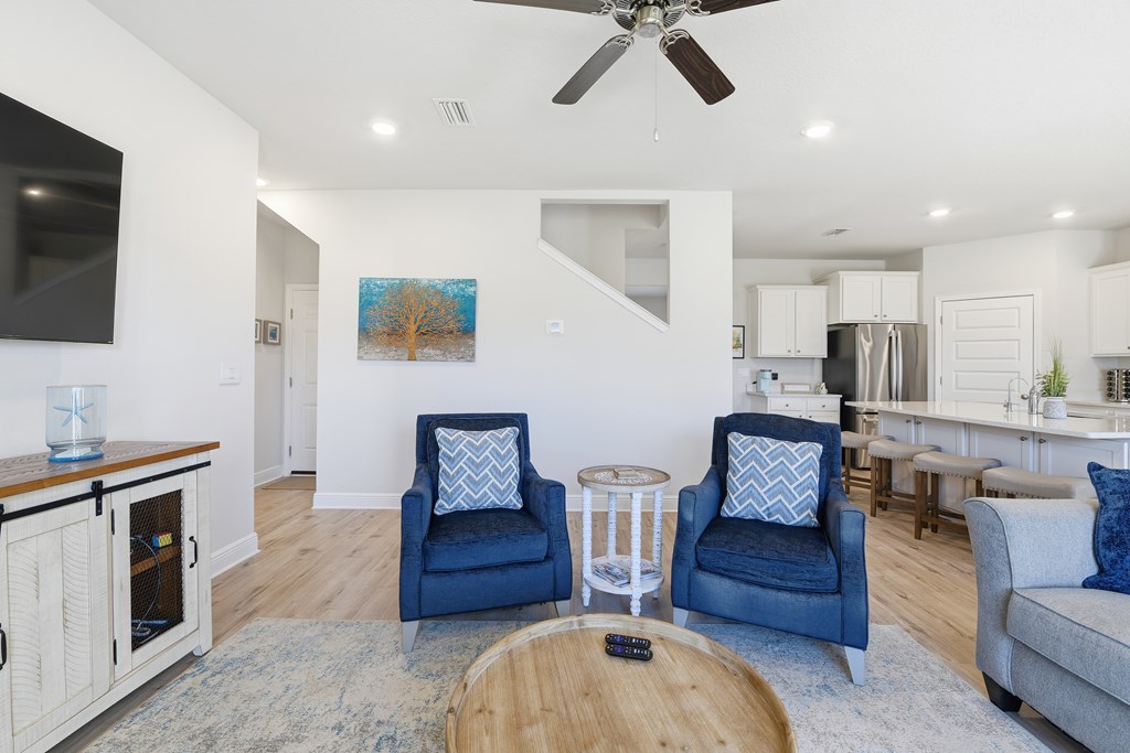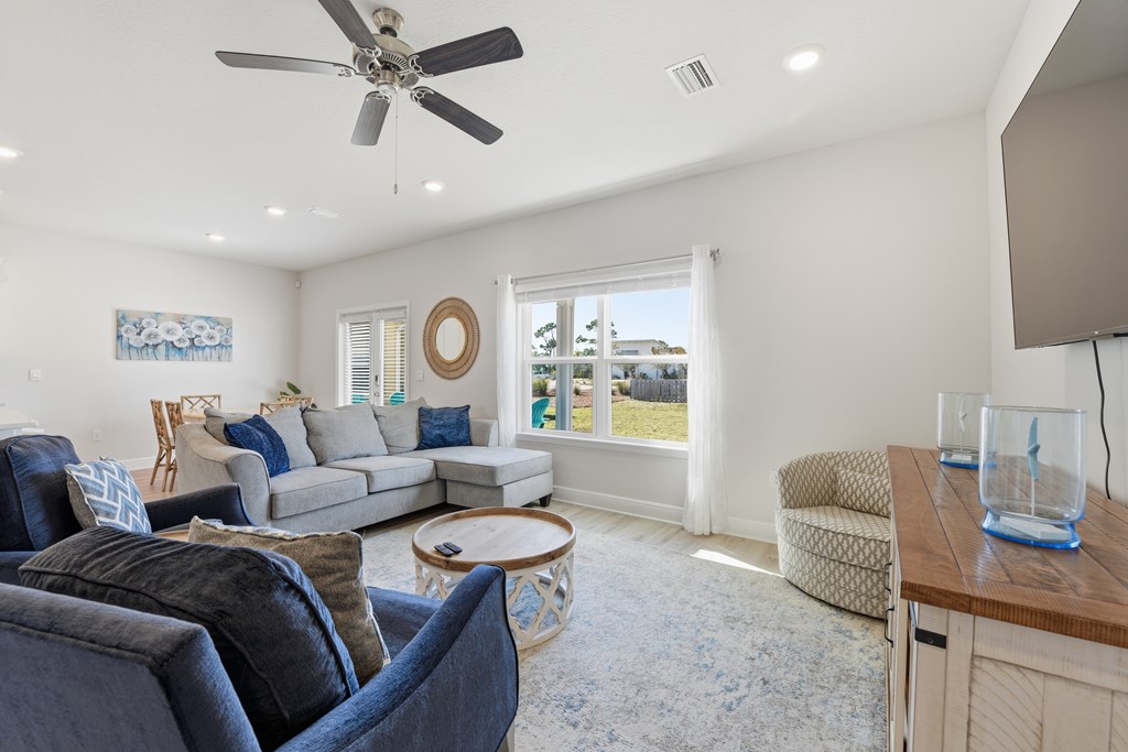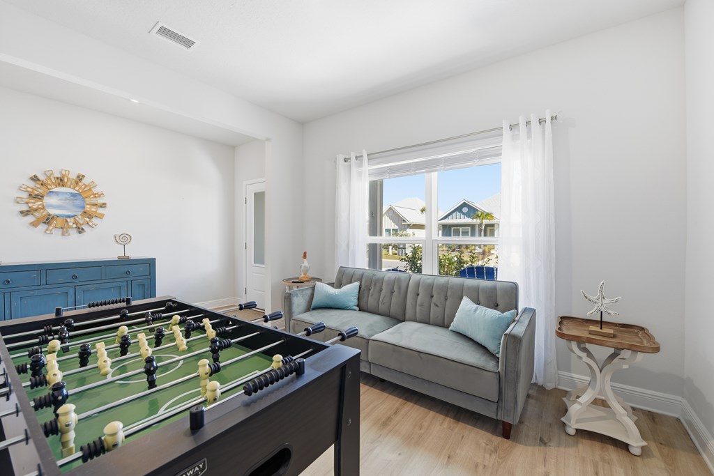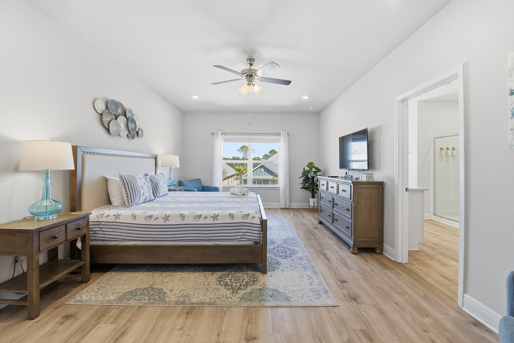 Luxury Coastal Living in WindMark Community - Welcome to 138 Pond Cypress Cove, a rare opportunity to own a fully furnished, turnkey coastal masterpiece in the highly sought-after WindMark Beach community. Perfectly positioned on a quiet cul-de-sac, this five-bedroom, three-bath Carol floorplan redefines coastal living with generous spaces, refined finishes, and effortless charm. Just beyond the backyard, residents can enjoy a short stroll along the boardwalk leading directly to the beach or spend sunny afternoons at the gorgeous community pool, located just steps away. From the second-floor bedrooms and bonus flex space, you'll enjoy peaceful, picturesque views of the water, creating the perfect backdrop for relaxation. Designed to comfortably accommodate up to twelve guests, this spacious retreat is ideal for personal enjoyment, a second-home getaway, or a profitable short-term rental investment. The main level welcomes you with an open-concept living area filled with natural light, enhanced by 9-foot ceilings that create an airy, spacious atmosphere and elevate the home's sense of openness throughout. The heart of the home is the beautifully appointed kitchen, featuring white cabinetry, quartz countertops, stainless steel appliances, and an island with seating—perfect for entertaining family and friends. A versatile multi-purpose room on the first floor offers the option of a private office, media room, music room or formal dining space, while a guest bedroom and full bath provide comfort and convenience for visitors. Ascend the stairs to the second level, where you'll find four additional bedrooms, including the luxurious primary suite, which features a private sitting area, spa-inspired ensuite bathroom, and an expansive walk-in closet. A shared bath and a spacious upstairs flex or lounge area offer plenty of room for everyone to unwind and take in the serene water views from above.