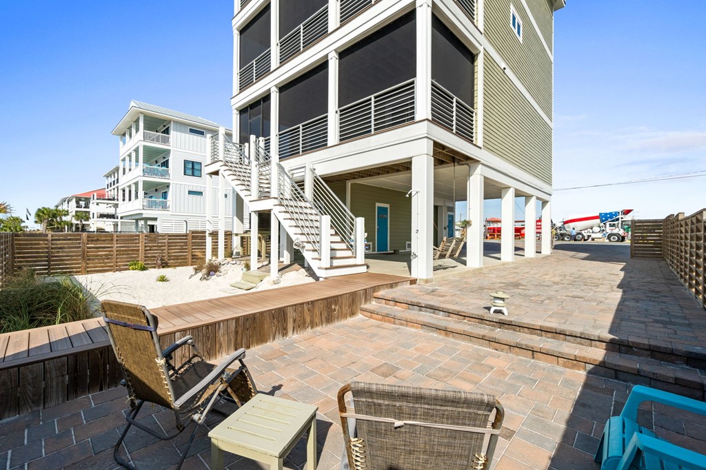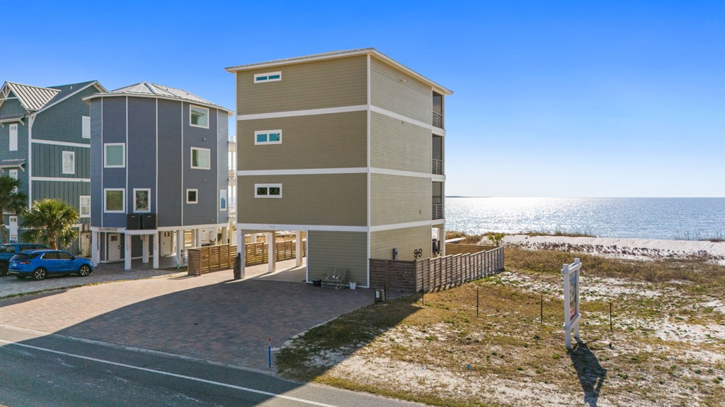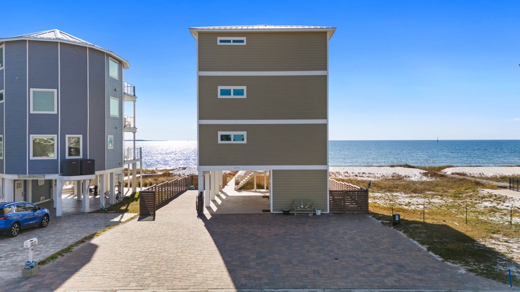 Welcome to 8133 W Hwy 98, a beautifully designed Gulf-front home offering over 3,000 sq ft of comfortable coastal living with private beach access directly out your back door. Built in 2022, this 3BR/2.5BA home was thoughtfully planned with durability and convenience in mind, featuring LVP flooring throughout, hurricane-impact windows and doors, composite boardwalk and decking, and an elevator accessing all floors. The main living level offers an open, bright layout with a spacious kitchen and living area designed for gathering, complete with granite countertops, soft-close cabinetry, stainless steel appliances, a large island with seating, and an oversized walk-in pantry with charming saloon doors. Just off the dining area, a screened-in balcony with a natural gas hookup provides the perfect place to relax or grill while enjoying the breeze off the Gulf. The private top-floor master suite is truly a retreat, offering panoramic Gulf views, a screened private balcony for catching sunsets, multiple closets, a laundry chute, and a large bathroom with dual vanities and toilets, and a shared walk-in shower. The first floor features two guest bedrooms, a shared bath, and a second living area/wet bar that opens to another screened-in balcony with access down to the beach boardwalk. The oversized lot provides space rarely found along the beach, including paver boat parking beside the home, covered parking underneath, a workshop featuring a refrigerator near a fish cleaning station, perfect for fishermen, an outdoor shower, and an additional ground-level storage room for all your beach gear. The best part is that it comes turnkey for the owners, creating a seamless transition to enjoying your new beach house. This house has only had one owner and has never been rented. Call today!