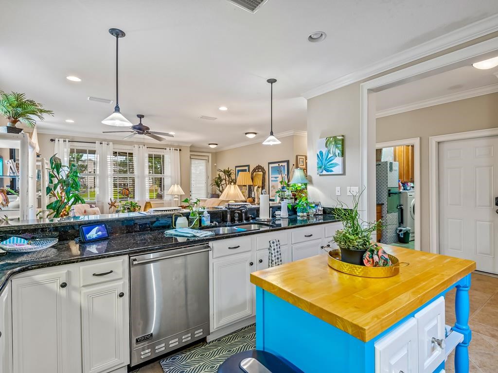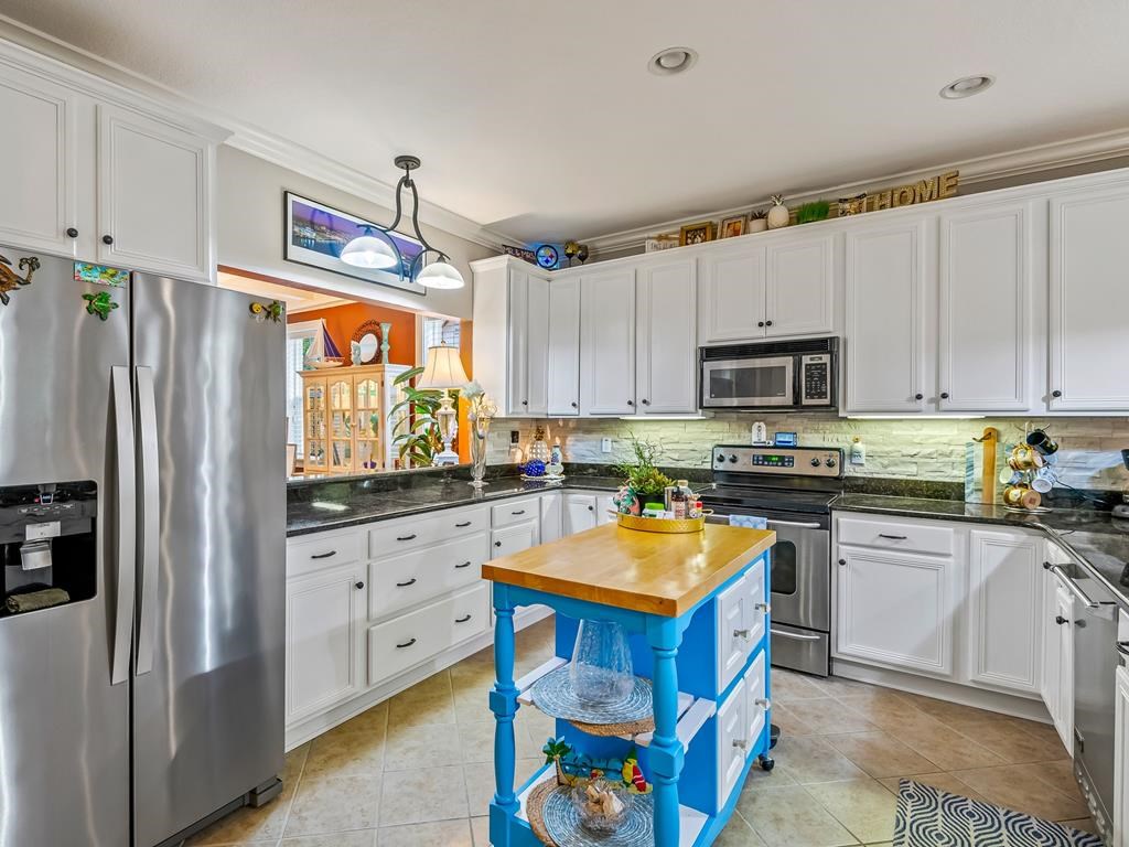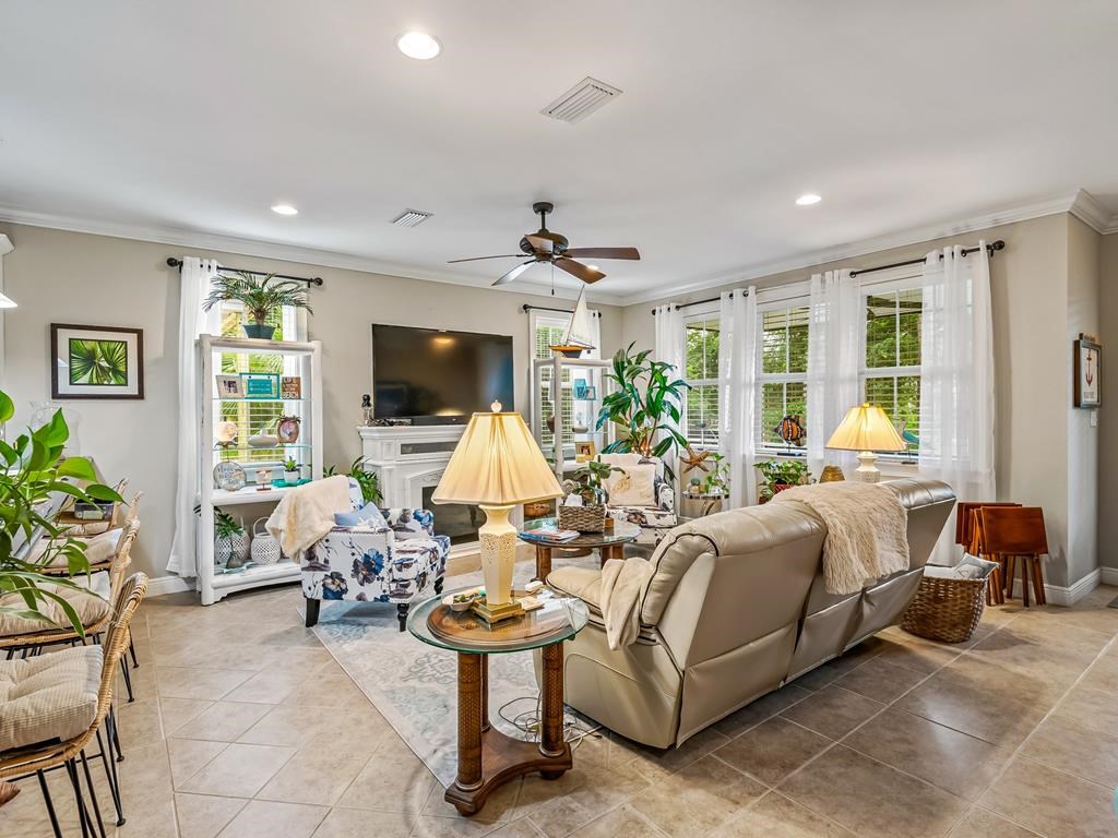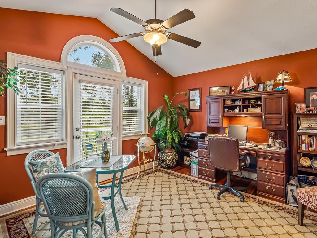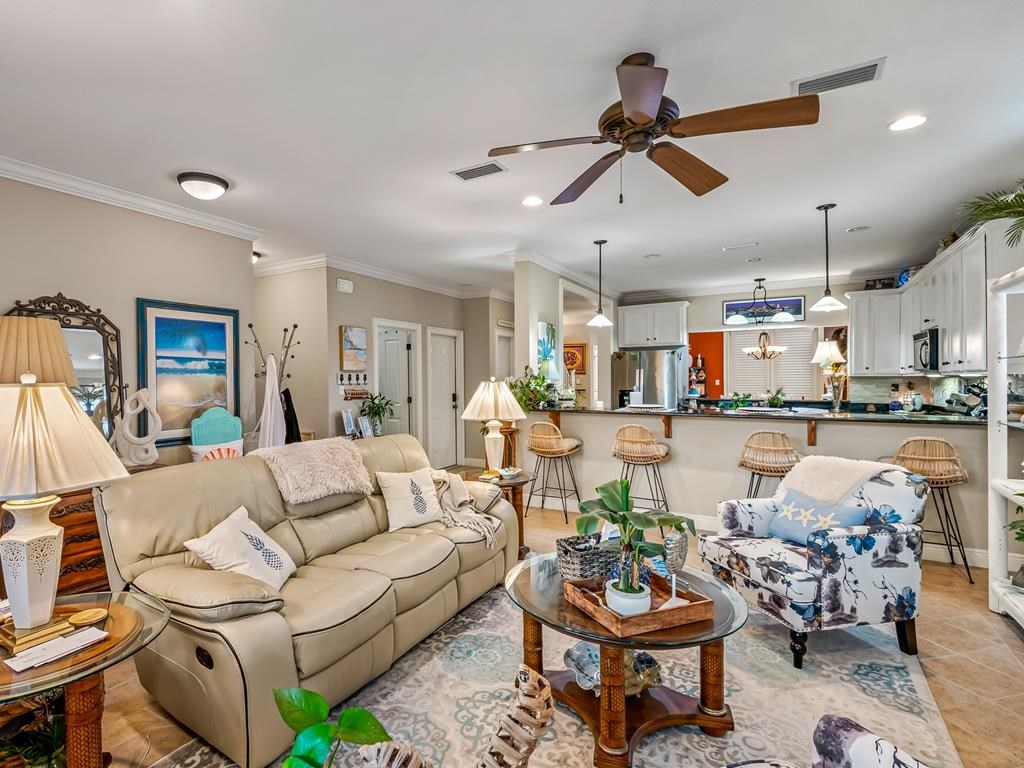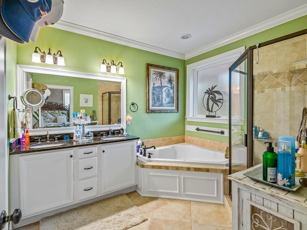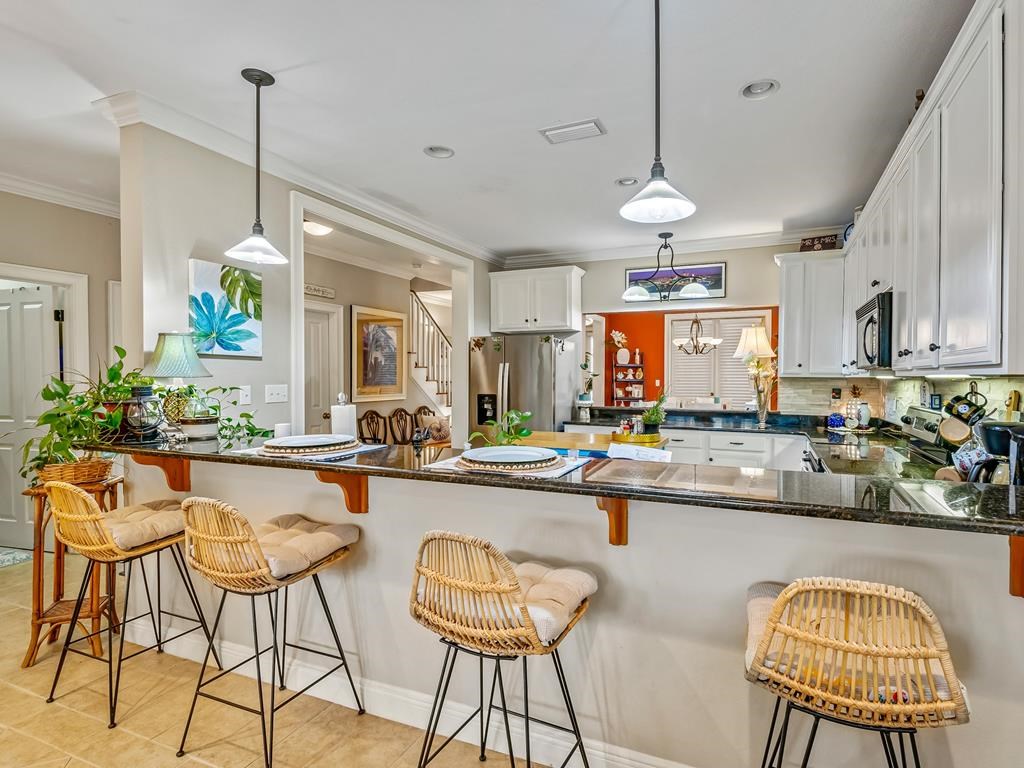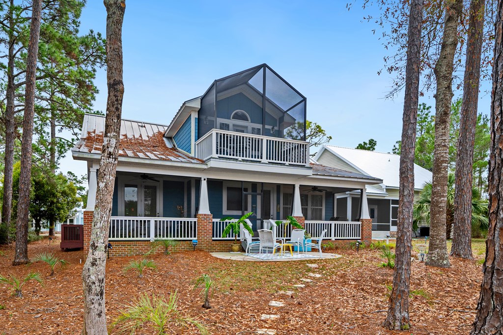 Beautiful Craftsman style custom designed and built home, located in the award-winning St. James Bay Golf & Pickleball Resort Community. This home offers an outdoor paradise with stunning views of the 14th green from both the large screened in back porch and the upstairs screen enclosed balcony. Features of this home include a welcoming covered screened front porch for entertaining guests and a downstairs master suite with dual sinks and granite countertops with a large walk in closet. Immaculate interior with crown molding, coffered ceilings, tile and cherry wood floors throughout living areas. Upstairs flex room for work at home office, craft space, or fourth bedroom. Stainless steel appliances complement the custom kitchen island and granite countertops. The finished attic is perfect for tons of additional storage. Recent updates include: HVAC(2025), stainless steel refrigerator(2024), exterior home painted(2023), second floor screened balcony(2024), professionally painted kitchen cabinetry & new stone backsplash(2023), custom screened front porch blinds(2024). You'll also enjoy private bay access to Bayfront Park owned by the POA with pavilions and dock, only 1/4 mile from your new home, and a stunning community beach with full amenities only a short 15 minute drive away. You will also have full use of a fenced in storage area owned by the POA, for all your recreational toys. St James Bay offers full and social memberships to the club amenities, including, golf course, community pool, pickleball courts, fitness center, etc. This is truly coastal living at its finest. Call today for your private tour.