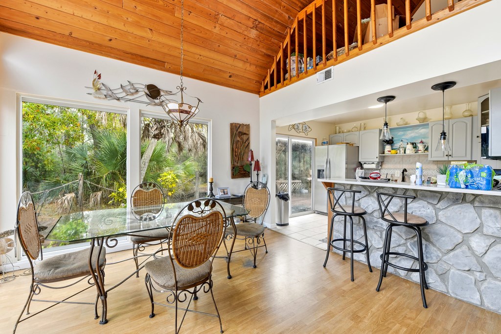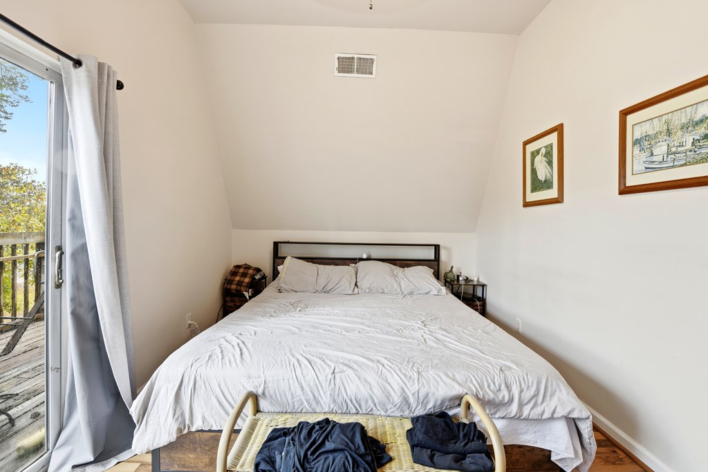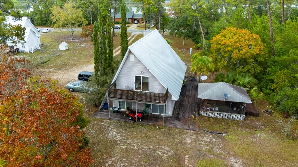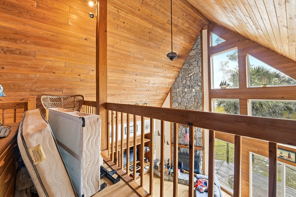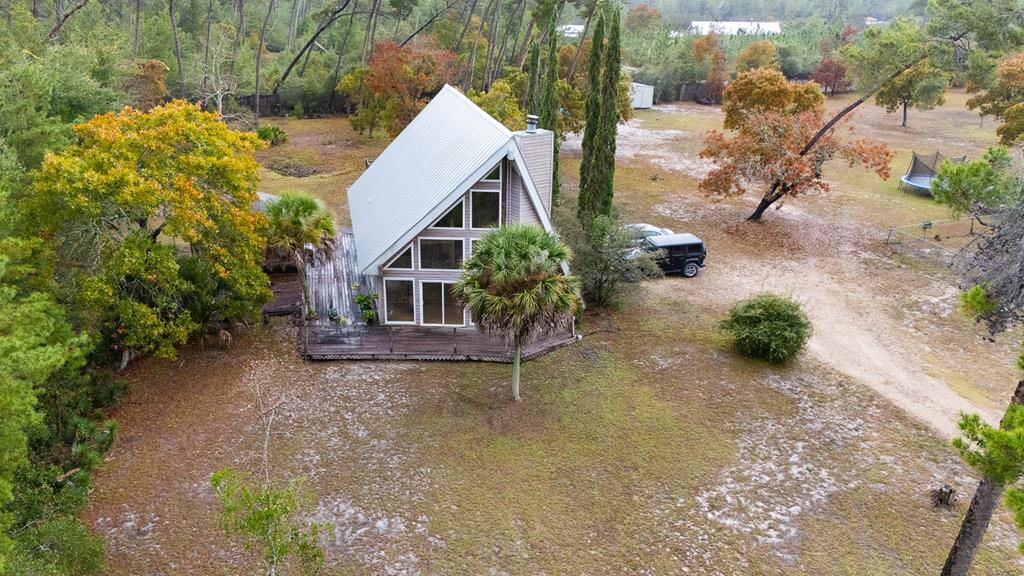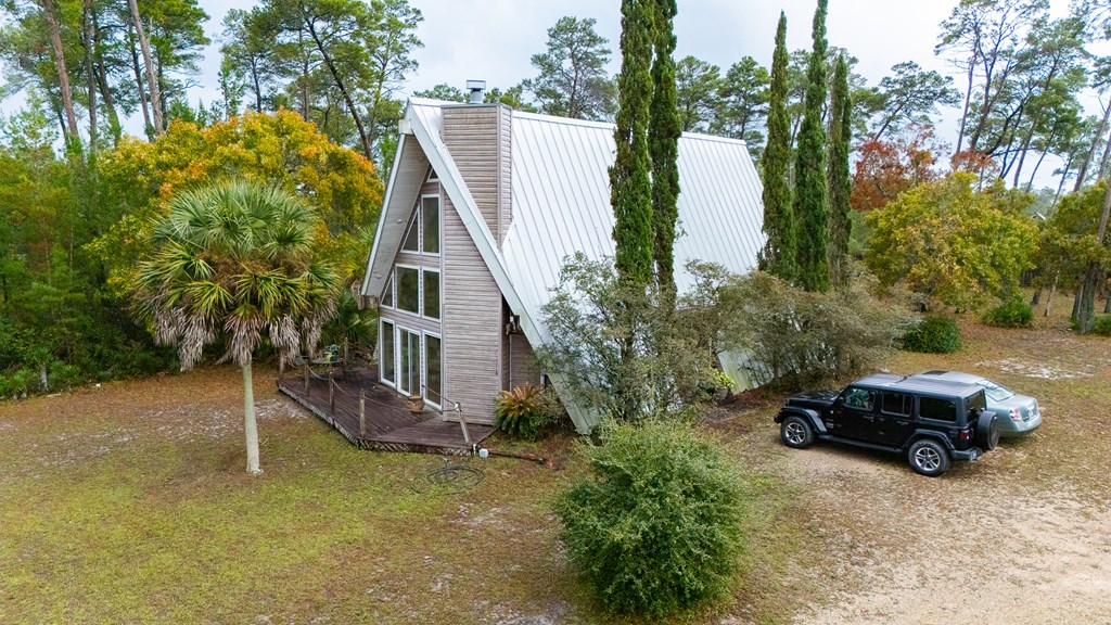 This inviting A-frame home combines a cozy cabin-style feel with subtle views of the Carrabelle River and a warm interior highlighted by stained woodwork, a striking stone fireplace, and floor-to-ceiling windows that fill the living and dining areas with natural light. Situated on a full acre, the property offers space, privacy, and excellent proximity to the Carrabelle public beach and nearby boat launch ramps, making it ideal for coastal living or short-term rental use, as the zoning allows STRs if desired. The main level features an open-concept living, kitchen, and dining area along with two bedrooms, a full bathroom, and a dedicated laundry area, with both downstairs bedrooms offering sliding glass doors that lead directly to the backyard. Upstairs, a loft-style landing overlooks the main living space and leads to the primary suite, which includes a full bathroom, a large closet, and a private balcony accessed through sliding doors. The home is connected to city sewer and currently on a well, with access to city water available if preferred. While full of character and charm, this property will need some remodeling to bring it to its full potential, offering a great opportunity for customization or investment. With its unique A-frame architecture, river glimpses, spacious lot, and close proximity to the coast, this home presents a versatile option for full-time living, rental income, or a peaceful getaway in the heart of Carrabelle.