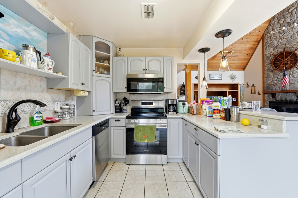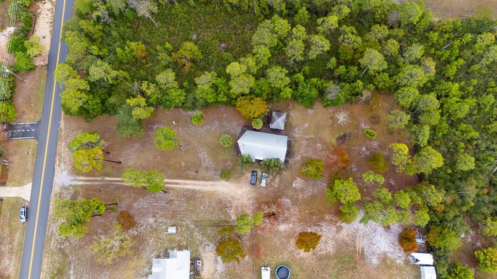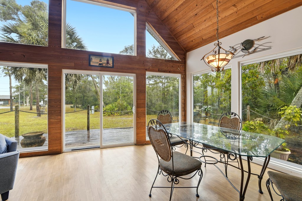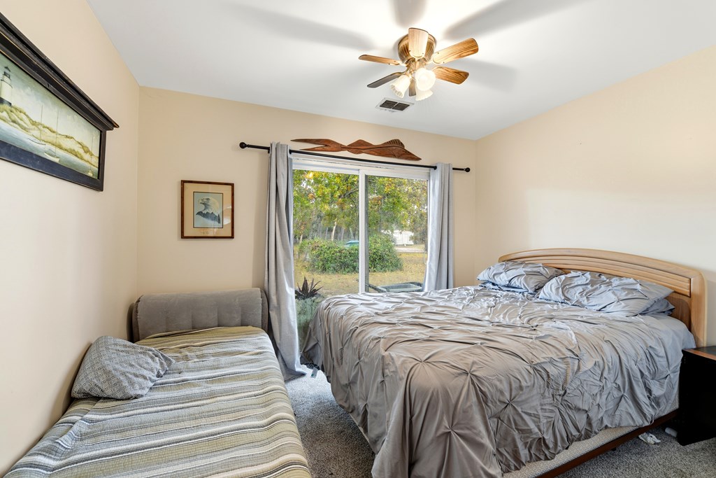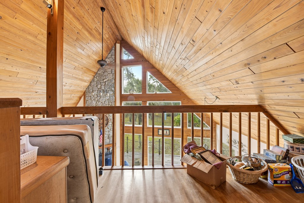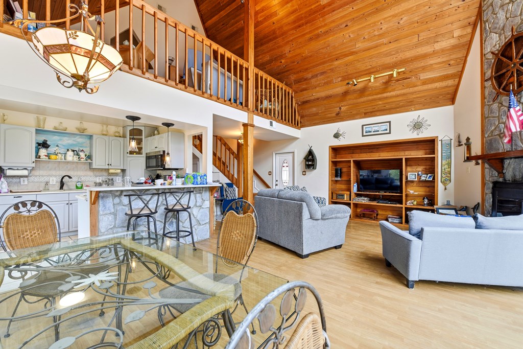 This inviting A-frame home combines a cozy cabin-style feel with subtle views of the Carrabelle River and a warm interior highlighted by stained woodwork, a striking stone fireplace, and floor-to-ceiling windows that fill the living and dining areas with natural light. Situated on a full acre, the property offers space, privacy, and excellent proximity to the Carrabelle public beach and nearby boat launch ramps, making it ideal for coastal living or short-term rental use, as the zoning allows STRs if desired. The main level features an open-concept living, kitchen, and dining area along with two bedrooms, a full bathroom, and a dedicated laundry area, with both downstairs bedrooms offering sliding glass doors that lead directly to the backyard. Upstairs, a loft-style landing overlooks the main living space and leads to the primary suite, which includes a full bathroom, a large closet, and a private balcony accessed through sliding doors. The home is connected to city sewer and currently on a well, with access to city water available if preferred. While full of character and charm, this property will need some remodeling to bring it to its full potential, offering a great opportunity for customization or investment. With its unique A-frame architecture, river glimpses, spacious lot, and close proximity to the coast, this home presents a versatile option for full-time living, rental income, or a peaceful getaway in the heart of Carrabelle.