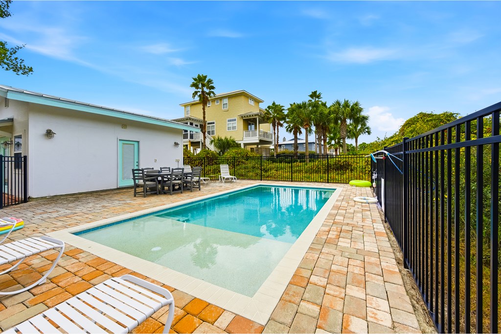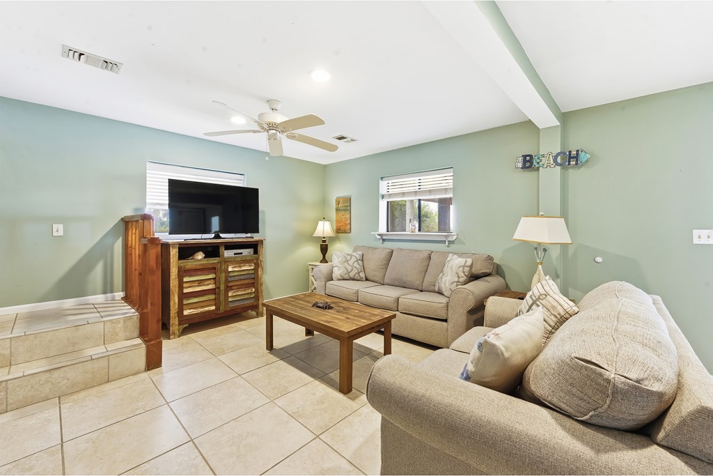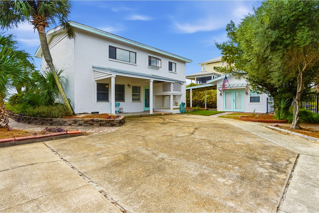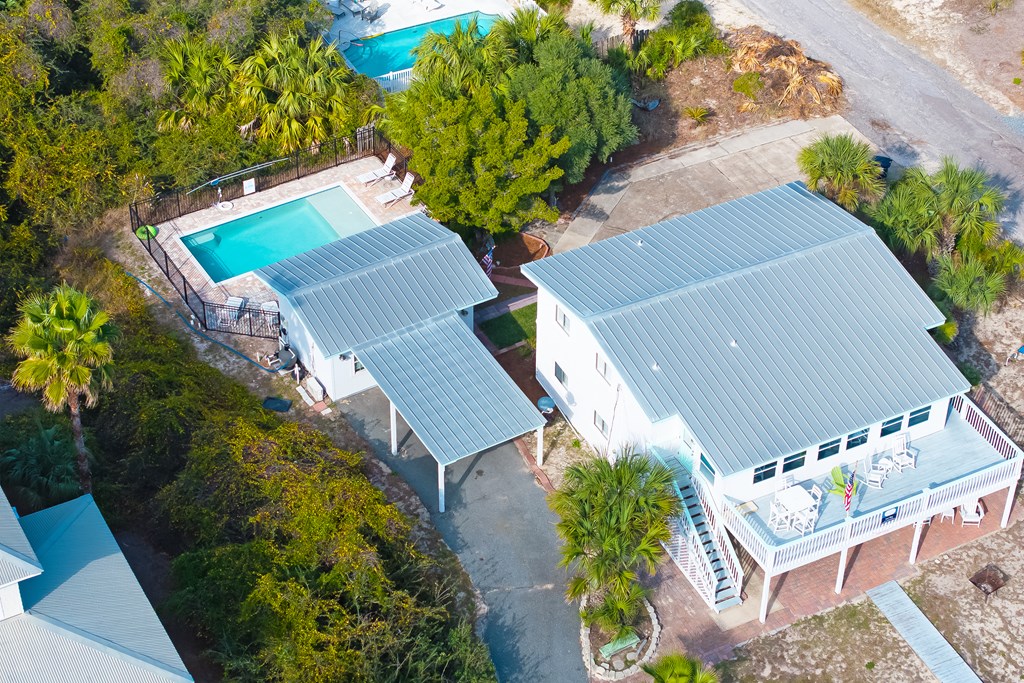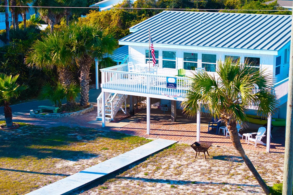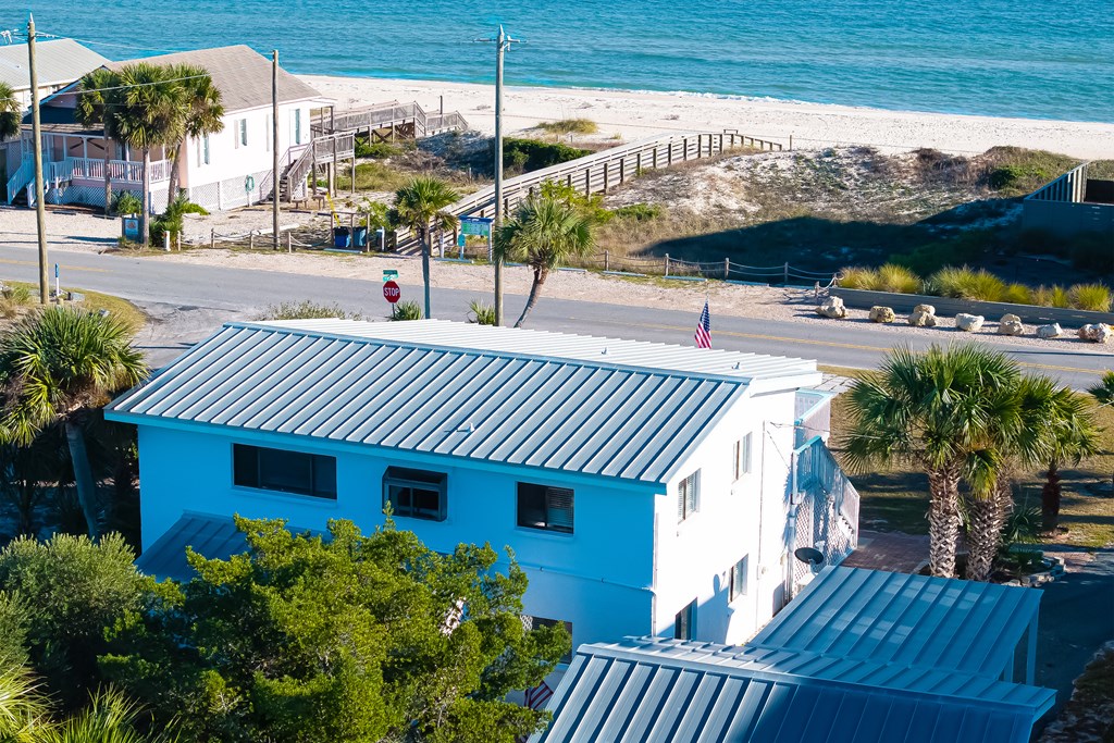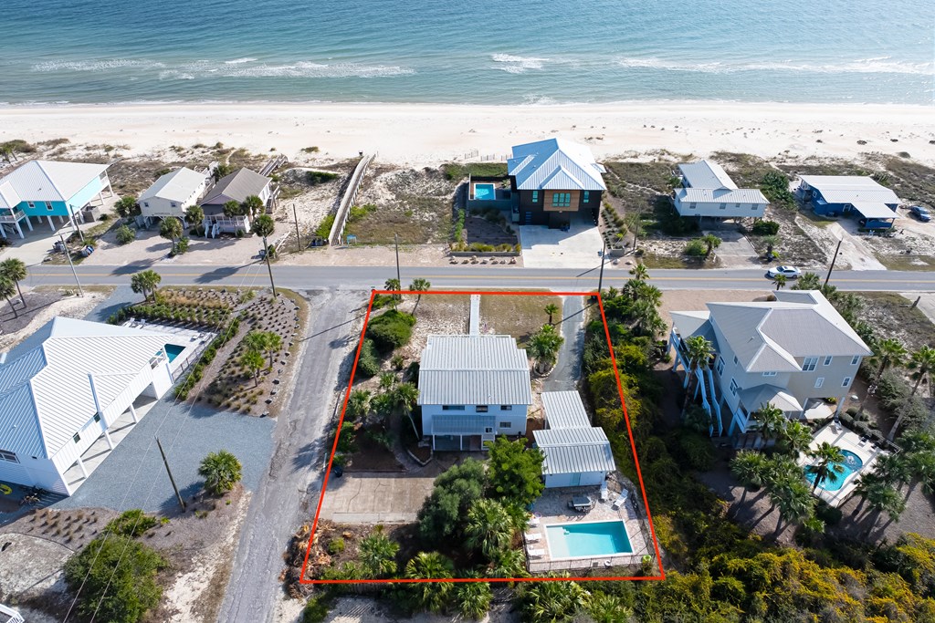 Low Key – A Relaxed Beach Cottage with Big Views Welcome to Low Key, a warm and inviting beach cottage perfectly positioned on a CORNER LOT to enjoy easy beach days just across the street via the community beach boardwalk. The community access provides 100 feet of UNOBSTRUCTED BEACH AND GULF VIEWS. Additionally, the home on the Gulf, directly across the street, is built on the West side of their lot expanding the view further. Designed for laid-back coastal living, this home offers four bedrooms in the main house with two of those on the ground level that share a 2nd living room. Take the interior staircase upstairs to the great room with warm wood floors and beamed ceilings. Perfect for gathering family and friends, the kitchen offers electric appliances and granite countertops. Panoramic views of the Gulf are available through an abundance of Southern facing windows. Access to the deck and 2 additional bedrooms are also on this floor. The cozy pool house with pine walls and ceilings serves as a studio style 5th bedroom, currently equipped with a twin bed and sleeper sofa. Outdoor living shines here with an in-ground pool, sundeck, and covered patio area—perfect spots for morning coffee, afternoon swims, and sunset relaxation. The home is built on a block foundation and features a new roof installed within the last five years, adding peace of mind to its coastal charm. Low Key is currently enjoyed by family and friends of the owner for several weeks per year, contributing to lower-than-average gross rental income. Whether you're looking for a personal beach retreat, an investment opportunity, or both, this easygoing cottage delivers the true island lifestyle—simple, comfortable, and effortlessly coastal.