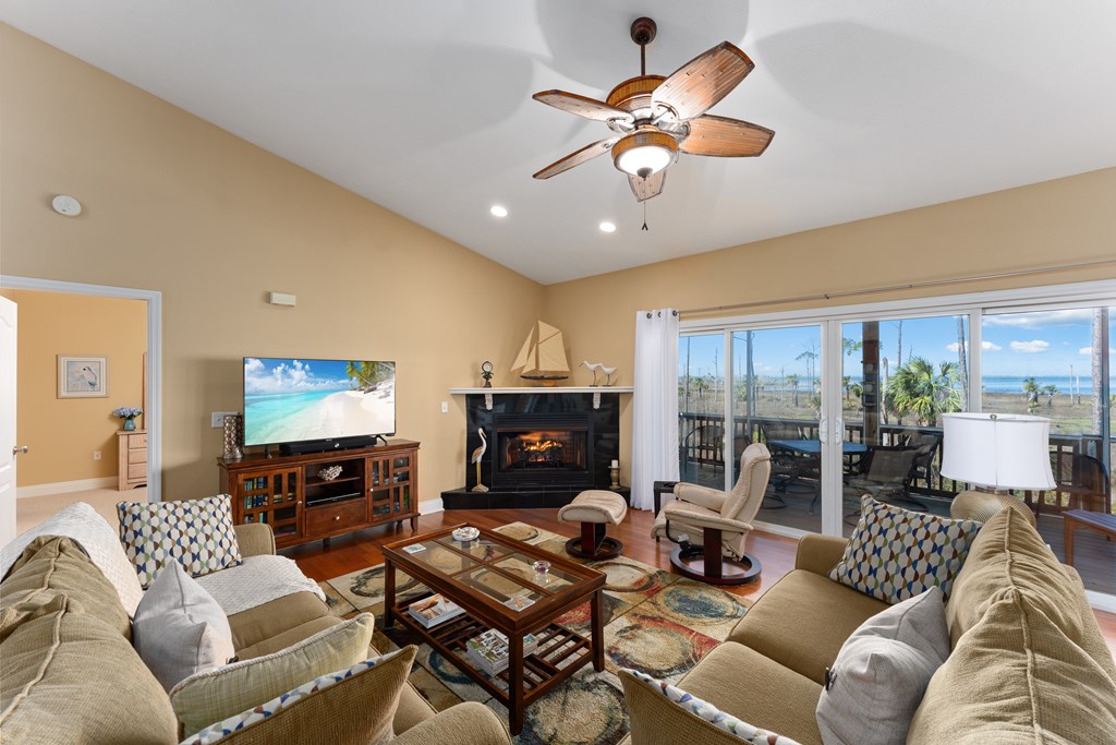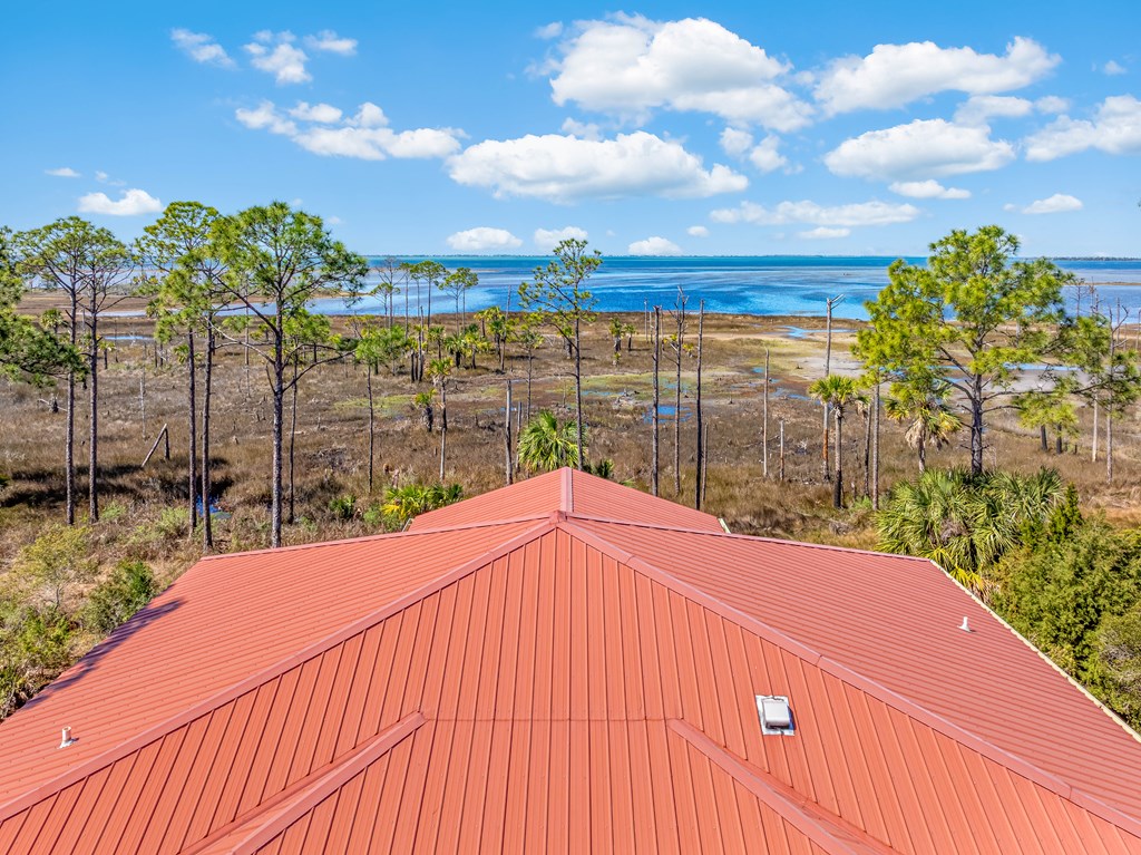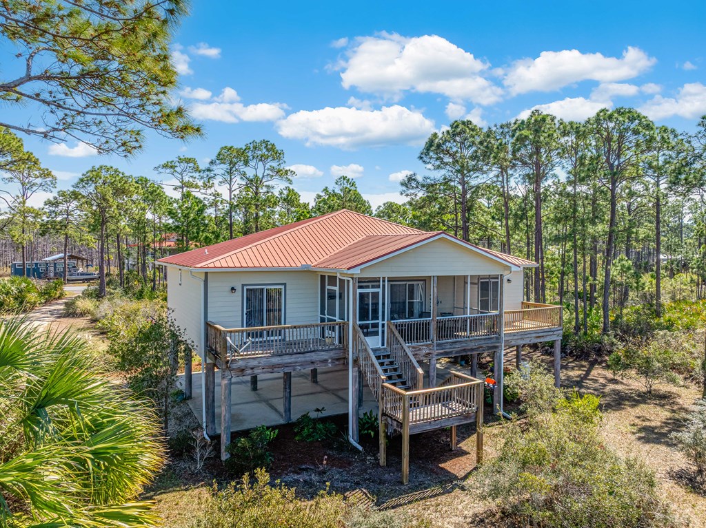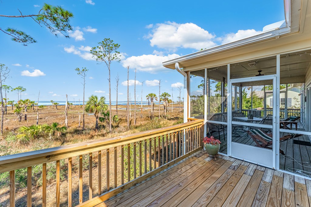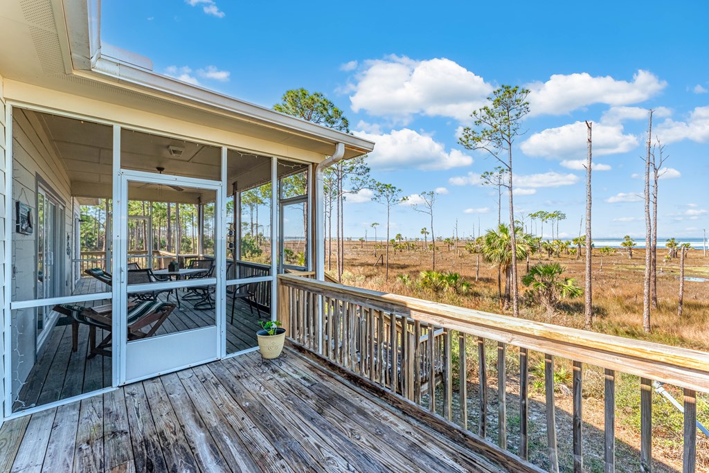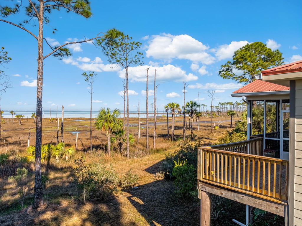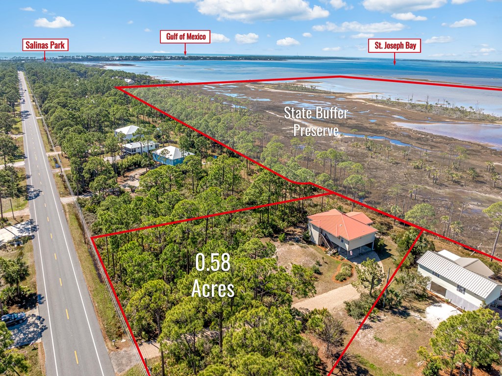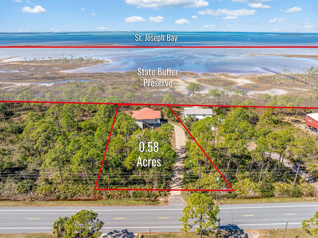 BAYFRONT BEAUTY situated on the head of St. Joseph bay bordering state-owned buffer preserve property, this residence offers incredible unobstructed west-facing bayfront views. Sunsets over St. Joseph Bay every evening from the comfortable screened porch will never disappoint, and the home features an open floorplan with vaulted ceilings in the great room area with a gas fireplace, 3 bedrooms and 2 full bathrooms. The warm and inviting interior promotes natural light and rich wood tones from the engineered hardwood floors and custom cabinets which compliment the home's relaxed and peaceful vibe. Plenty of ground-level storage area (including a built-in shaft for a future elevator if needed) and a large 0.58 acre yard, great for projects and gardens. Meticulously maintained, fully furnished and move-in ready, this is a great opportunity to own a slice of paradise in one of the most serene and sought-after locations on the Gulf Coast. Don't miss your chance - schedule a private tour today!
