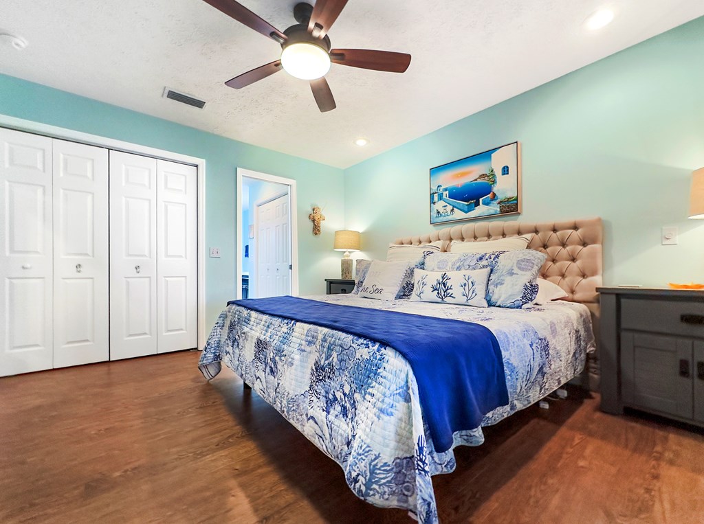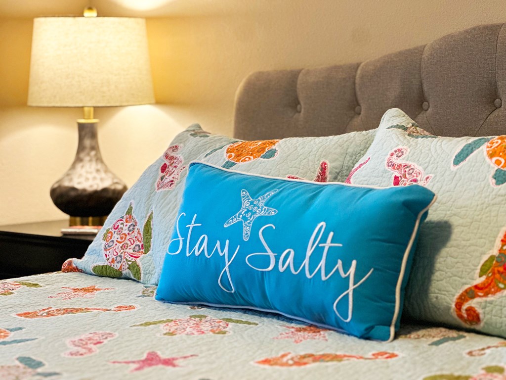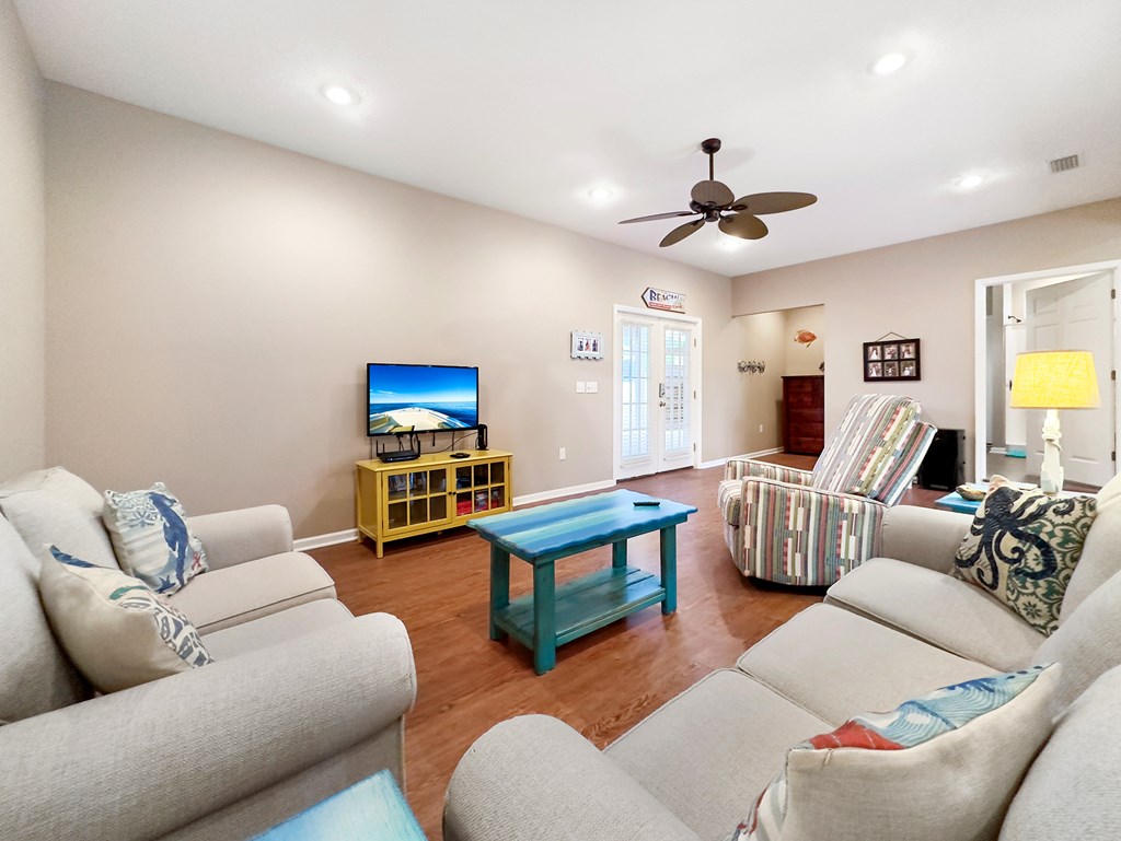 Welcome to your inviting South Cape retreat—just a short stroll to the beach and moments from Salinas Park. This beautifully maintained and thoughtfully updated home offers warmth, comfort, and room for the entire family. The spacious screened front porch, now upgraded with all-new Trex decking, sets the tone for coastal living, with plenty of space to enjoy morning coffee on the bed swing or unwind in the evening gulf breeze. Inside, the open-concept layout ensures everyone feels connected, whether cooking in the kitchen or relaxing in the living room. The shiplap accented wall brings in that fresh, on-trend coastal vibe, while the kitchen impresses with granite countertops, a coastal tile backsplash, crown-molded cabinetry, and a generous breakfast bar—perfect for casual meals or entertaining. Crisp white appliances, most updated in 2023, provide a clean, modern feel. The main level features three spacious bedrooms and two full baths. The primary suite is set apart for privacy and boasts a custom-tiled shower with dual showerheads, plus laundry conveniently located in the en suite bath. Natural light fills every room, especially the guest bedroom that overlooks the screened porch. Downstairs feels like a retreat of its own with approximately 1,150 square feet of additional living space, including a bunk room, a full bath, a dedicated work area, and French doors that welcome in the light. This level also offers a separate entrance and exterior storage—ideal for guests, rental potential, or multi-generational living. The exterior is designed for low maintenance with a pebble rock yard, natural landscaping, vinyl siding, and a fenced backyard perfect for kids or pets. Additional highlights include an outdoor shower, a shallow well for irrigation, public sewer connection, and extra storage. This coastal gem is ready for full-time living, a beach escape, or your next investment.