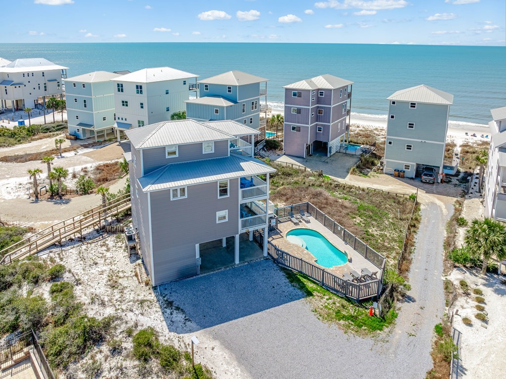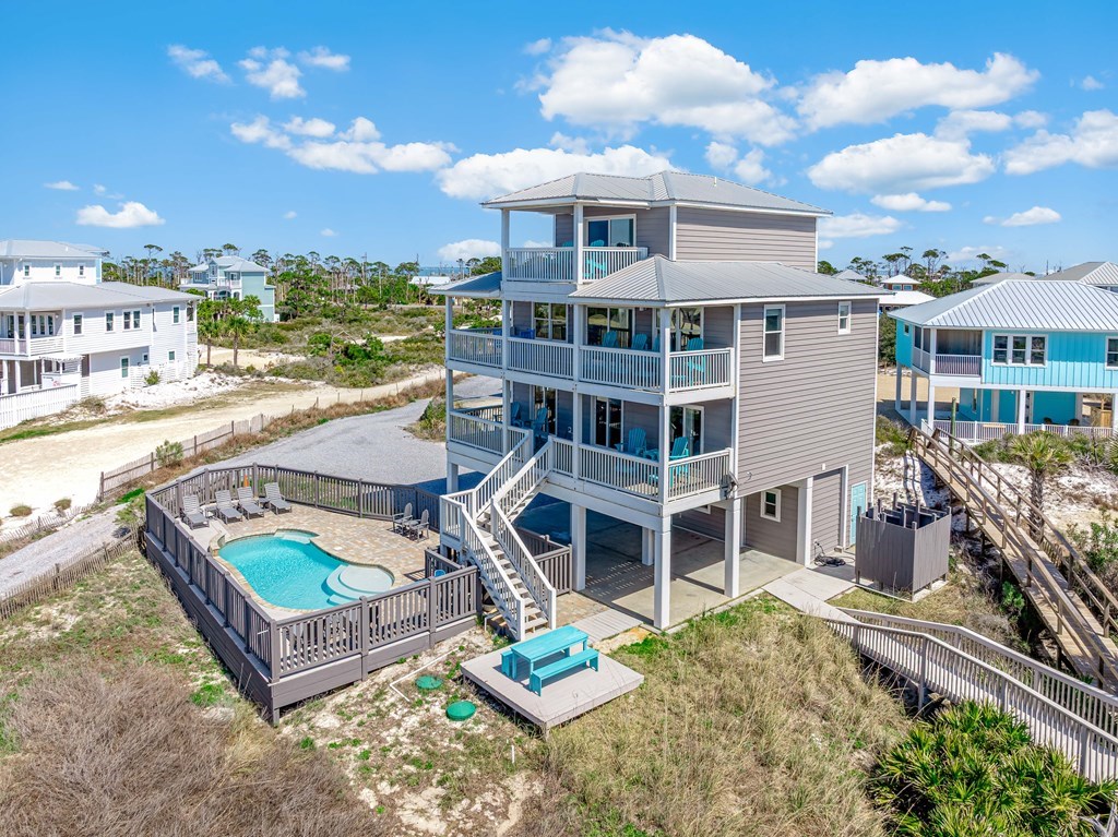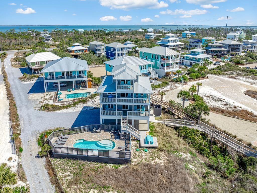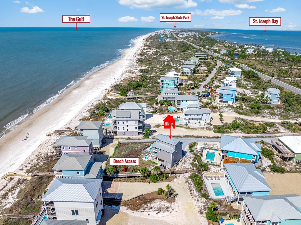 UNOBSTRUCTED GULF VIEWS from this 1ST-TIER BEACH HOUSE featuring a PRIVATE POOL, ELEVATOR, STRONG RENTAL HISTORY, AND LOCATED IN AN X FLOOD ZONE (NO FLOOD INSURANCE REQUIRED). Just steps from the sugar-white sands and emerald waters, this well-maintained coastal retreat offers spectacular Gulf views, private beach access, and miles of unspoiled shoreline. Designed for both relaxation and entertaining, the open-concept layout includes 4 bedrooms and 4.5 bathrooms, with a bright, airy living space that flows seamlessly into the fully equipped kitchen and dining area. Step outside to your private pool, perfect for cooling off after a beach day or soaking up the coastal sunshine. Thoughtful upgrades provide peace of mind, including hurricane-rated CraneBoard insulated siding installed in 2020, a roof approximately five years old, two HVAC units approximately six years old, and a septic system pumped and inspected in 2022 with the leach bed and drain field replaced the same year. An elevator adds everyday convenience, making all levels easily accessible. Enjoy an active coastal lifestyle with nearby bike path, kayaking, fishing, local shops and restaurants, and St. Joseph Peninsula State Park just minutes away. SHORT-TERM RENTAL FRIENDLY WITH A PROVEN, STRONG RENTAL HISTORY, this property is perfectly suited as a luxury second home or a high-performing income-producing investment.