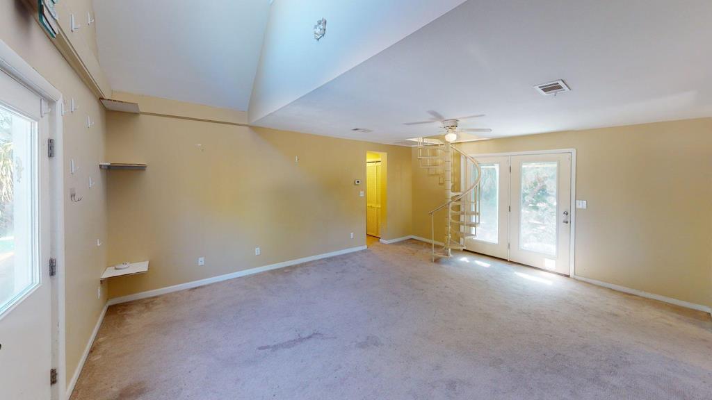 Rare opportunity to own this unique property in a quiet neighborhood. This 3-bedroom, 3-bath home features a loft accessed by spiral stairs overlooking the living room, a barn door to the kitchen, and a split-bedroom layout. The covered back porch opens to a large backyard with a workshop, offering plenty of potential for future updates or improvements. The property sits on a .40-acre lot (100' x 175') with a large circular driveway, providing ample room for a boat, RV, or extra parking. Its central location makes it easy to reach local shops, restaurants, the St. George Lighthouse, and the bike path. St. George Island Beach continues to be recognized as one of the top beaches in the country, making this an excellent opportunity for those looking to enjoy island living with room to make the home their own. Priced to sell! Check out the video tour!!