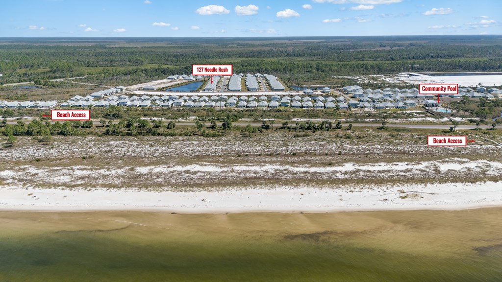 From Port St Joe travel west on Hwy 98 for 5.6 miles to Flat Water St West. Turn left on Needle Rush. House is on left.