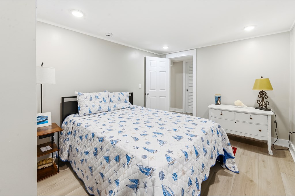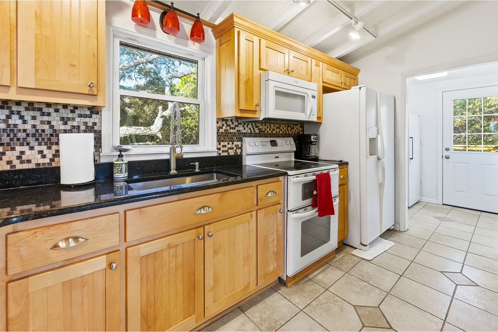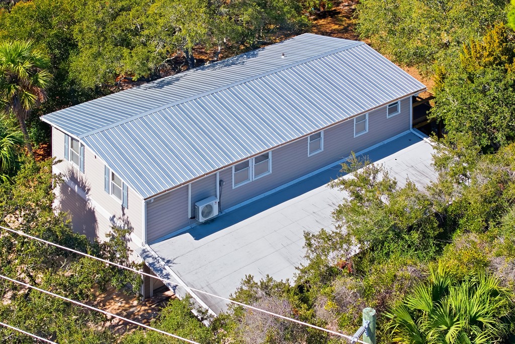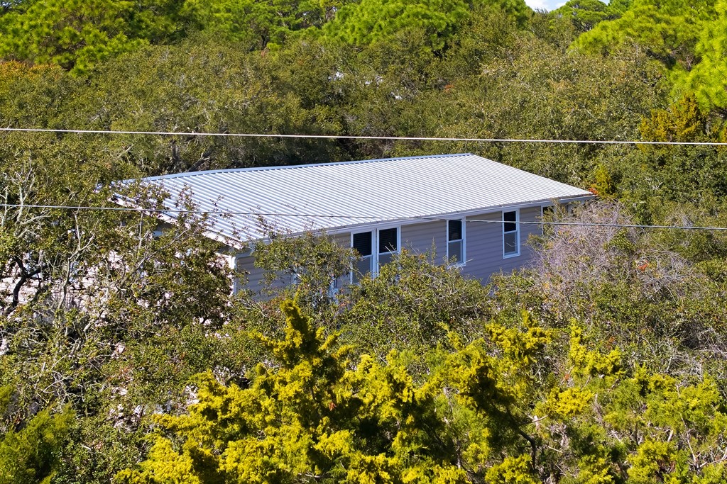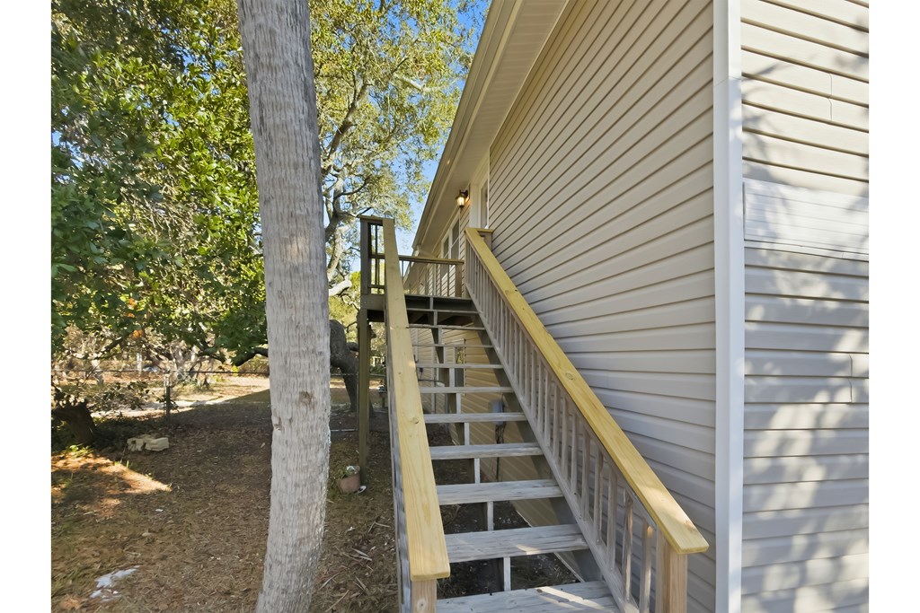 Step into a piece of island history thoughtfully updated for modern coastal living. Originally a Jim Walter home ferried to the island in the 1960s, this unique 4-bedroom, 3-bath residence blends timeless character with extensive recent improvements and flexible living spaces ideal for full-time living, second home enjoyment, or vacation rental potential. The top floor serves as the heart of the home, featuring three bedrooms, two baths, and an open living area centered around a renovated kitchen. Just beyond, a brand-new 288-square-foot deck provides the perfect setting for morning coffee or evening gatherings while overlooking the fenced backyard shaded by sculpted, mature oak trees. The ground level offers exceptional versatility with a private master bedroom, additional living room, laundry area, and generous storage—ideal for guests, extended family, or a separate retreat space. The outside of the property is designed for both privacy and convenience. The circular gravel drive winds through the trees, creating a natural sense of privacy, with the home positioned so there is no view of the road from the living areas. The fenced yard further enhances the peaceful setting, while covered parking and generous storage areas provide convenience for vehicles, beach gear, and outdoor equipment. The home's close proximity to the beach and bike path makes it easy to enjoy the island lifestyle. Recent infrastructure upgrades provide peace of mind and long-term value, including a new Galvalume roof (2026), central HVAC system (2024), additional mini-split systems for enhanced comfort (2021), ground level renovation and mini split (2025), complete interior rewiring (2025), underground electrical service, and a 400-amp meter base. Rich in history yet fully prepared for the future, this distinctive property offers the rare opportunity to own a thoughtfully improved island home in a highly desirable location near the beach, nature, and recreation.