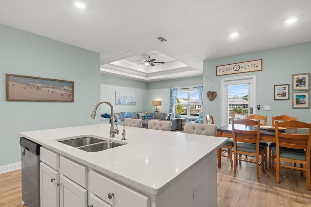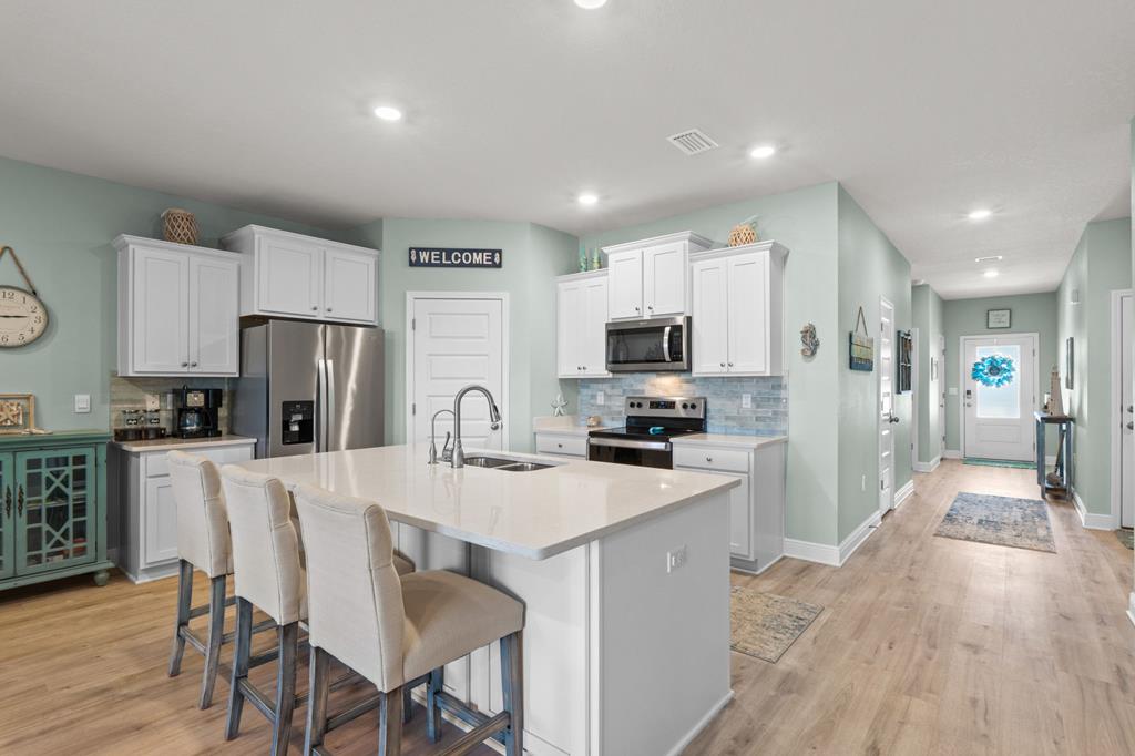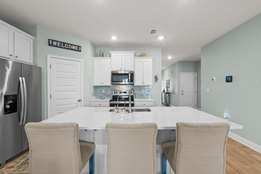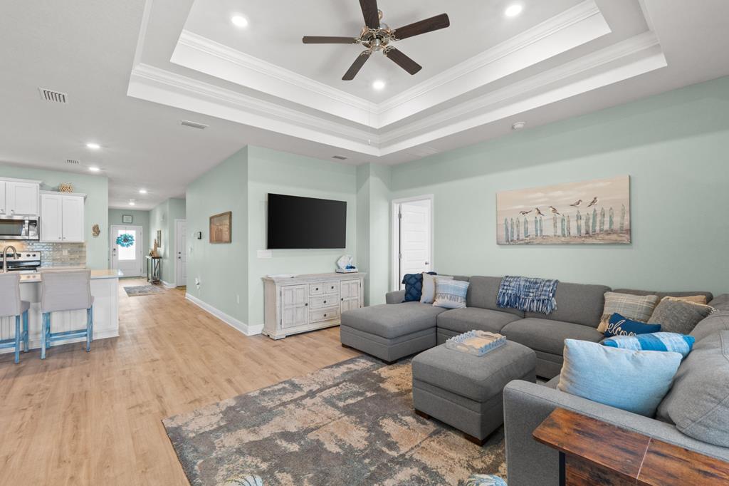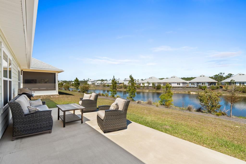 Welcome to 459 Sea Grove Way in the sought-after WindMark Beach community of Port St. Joe, where coastal elegance, comfort, and turnkey convenience come together in this beautifully maintained 4-bedroom, 2-bath furnished home. Ideal as a full-time residence, second home, or investment property along Florida's Forgotten Coast, this move-in-ready home offers stylish finishes, functional living space, and a prime location near the beach, walking and biking paths, dining, and shopping. Inside, the open-concept floor plan is designed for relaxed coastal living and effortless entertaining. The spacious living area features a striking tray ceiling, abundant natural light, and seamless flow into the kitchen and dining areas. The kitchen is both attractive and functional, showcasing quartz countertops, stainless steel appliances, tile backsplash, new interior paint, and a new kitchen sink and faucet. The laundry room adds convenience with built-in cabinets and a drying rack. The private primary suite offers a peaceful retreat with a spacious bath featuring a garden tub, TILED shower, dual-sink vanity, and a thoughtfully designed layout. Three additional bedrooms provide flexibility for guests, family, or a home office. Outdoor living is just as inviting with a screened back porch overlooking the pond, creating a peaceful setting for morning coffee, outdoor dining, or relaxing after a day at the beach. Additional features include a sprinkler system, gutters, and attractive landscaping that enhance curb appeal and simplify upkeep. Located in WindMark Beach in Port St. Joe, this fully furnished coastal home offers convenient access to the beach, scenic community paths, and nearby dining and shopping. With its turnkey condition, upscale finishes, and pond-front setting, this property is ready to enjoy as a primary residence, second home, or coastal investment on the Forgotten Coast.