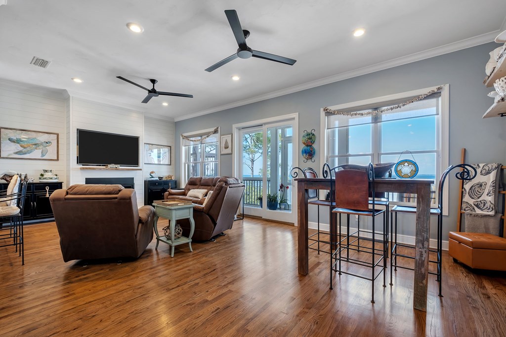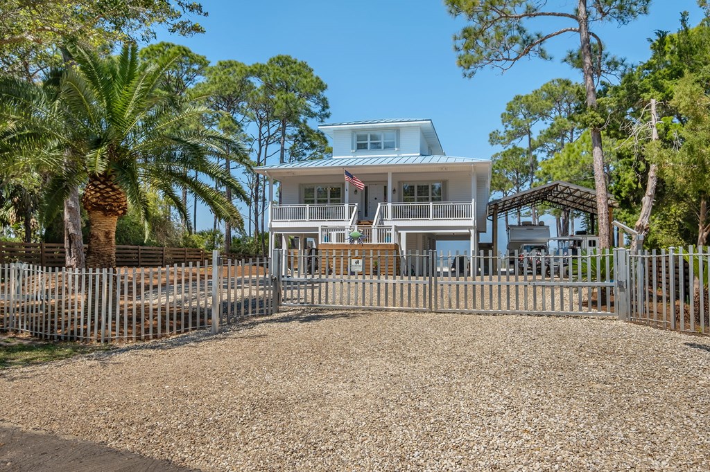 A private bayfront retreat designed for boating, sunsets, and elevated coastal living. Located in Watkins Cove on St. George Island, this gulf coast home offers 3 bedrooms, 2.5 baths, and 2,512 sq ft of heated and cooled space on a 0.67 acre homesite. Built in 2001 on concrete pilings, the property combines structural durability with refined waterfront design. Plenty of parking! The private dock is built for full-day water use, featuring a boat lift, water, electric, fish cleaning station, sandy beach entry, and space to accommodate jet skis and additional watercraft. Southwestern exposure delivers uninterrupted sunset views across the bay. Inside, the main living space is defined by 12 ft ceilings, real oak hardwood floors, and wide bay-facing sightlines. The kitchen is equipped with upgraded stainless appliances and bar seating for six, flowing into a living area with gas fireplace and direct access to a full-width screened porch. A cargo and passenger elevator connects all levels. The primary suite is positioned for privacy and views, with a full bay-facing picture window, walk-in closet, and bath with double vanity, garden tub, and separate shower. Two additional upstairs bedrooms include walk-in closets, with one offering a private balcony overlooking the water. The ground level includes a concrete slab, workshop, and storage area. A 20x40 pole barn with RV hookup supports boat and recreational storage. Covered parking, gated entry, aluminum coastal fencing, and an expansive gravel drive allow for multiple vehicles and equipment. Whole-house generator also on site. Located minutes from the center of St. George Island and a short drive to Apalachicola and Eastpoint. Private, functional, and built for waterfront living.